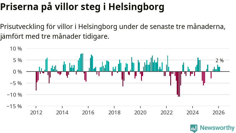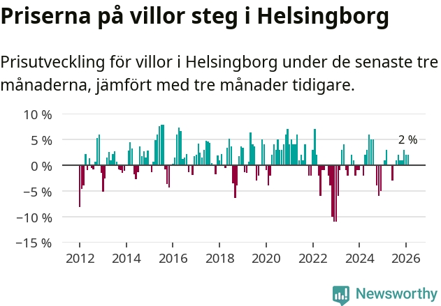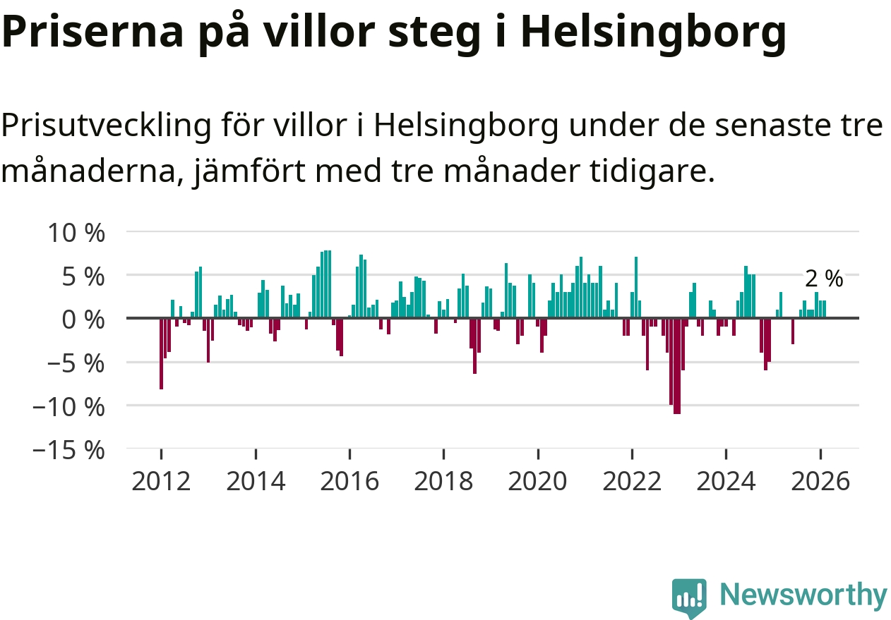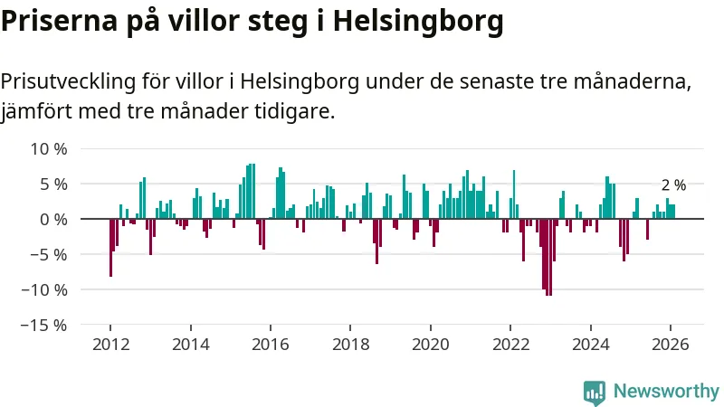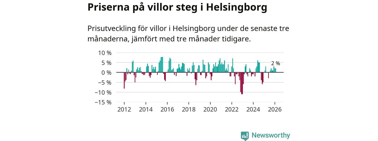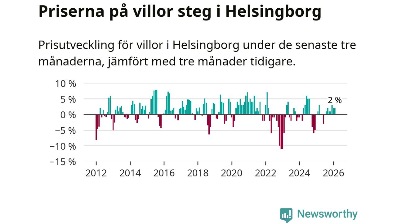 Villapriserna har gått upp i Helsingborgs kommun. Medelpriset på försäljningarna under de senaste tre månaderna visar på en uppgång med 2 procent.