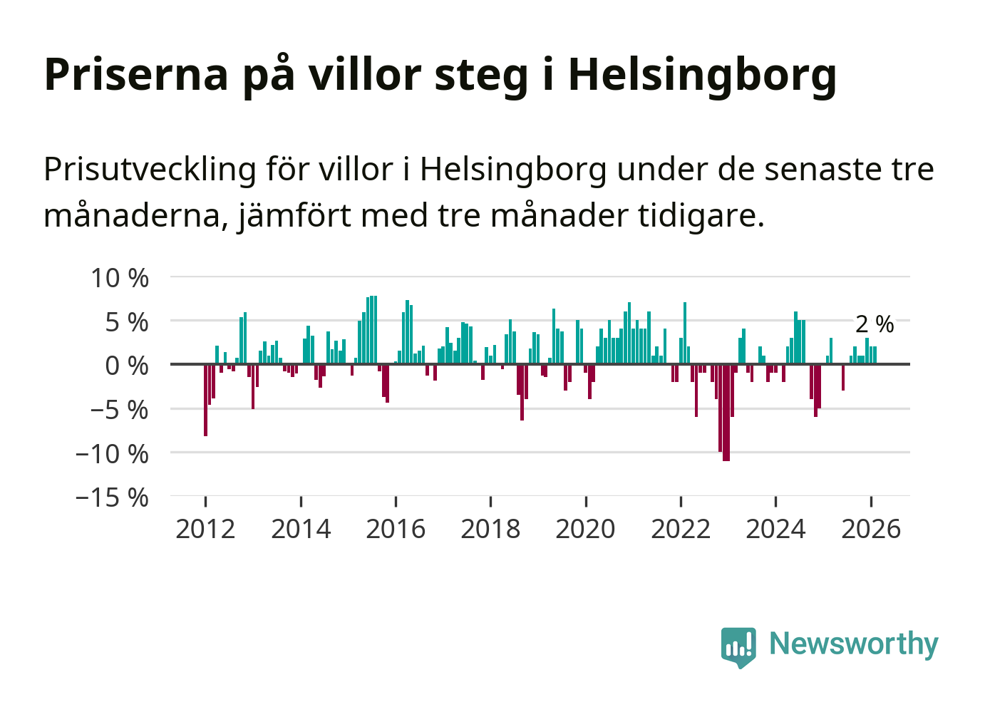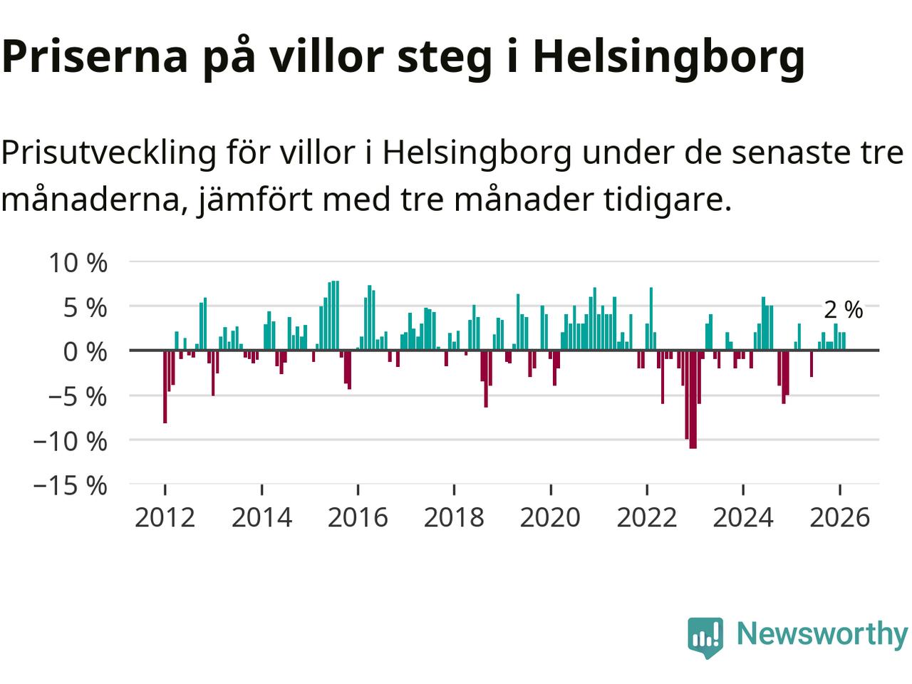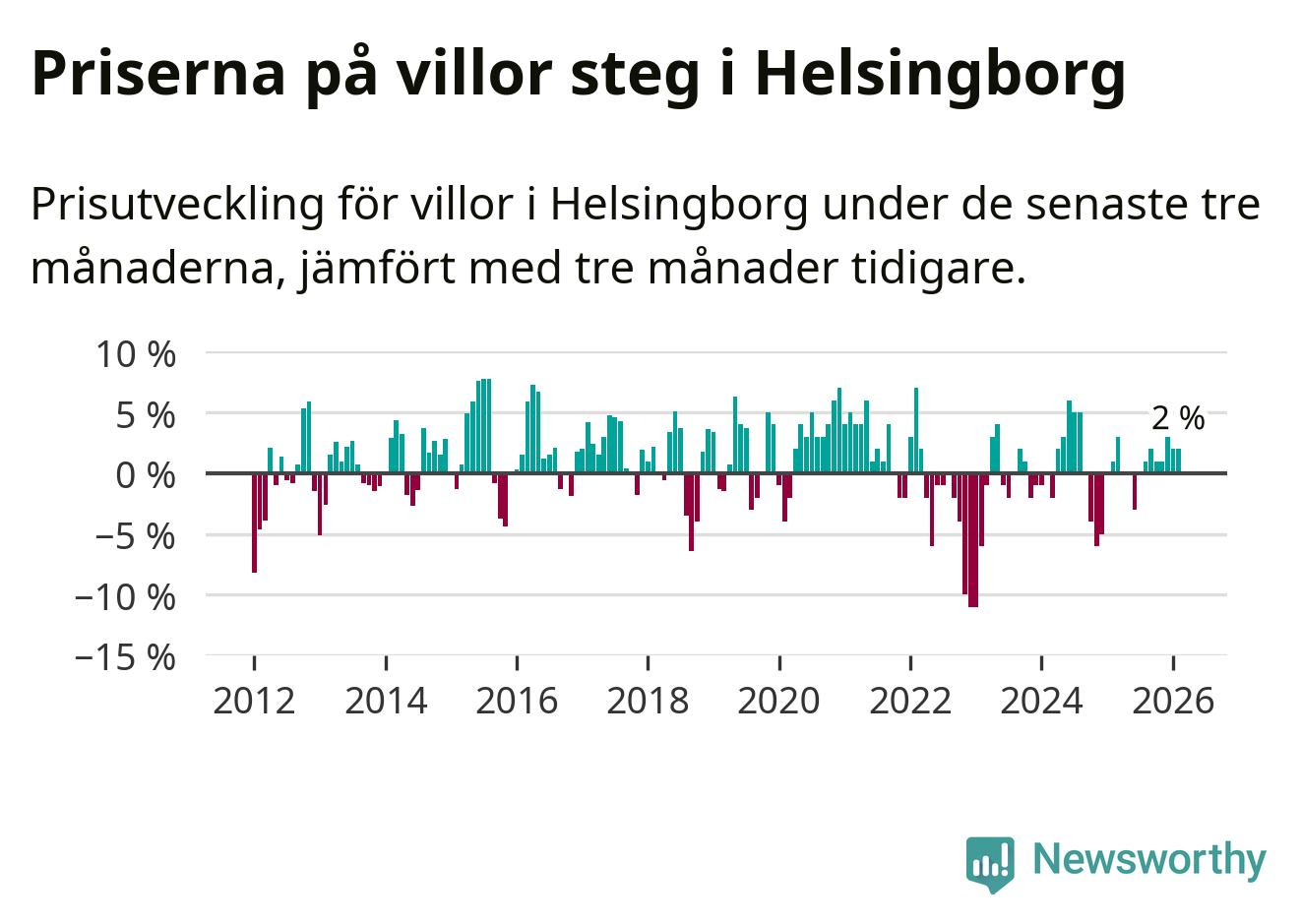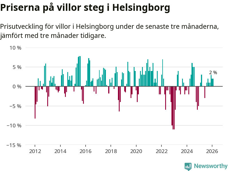 Villapriserna har gått upp i Helsingborgs kommun. Medelpriset på försäljningarna under de senaste tre månaderna visar på en uppgång med 2 procent.