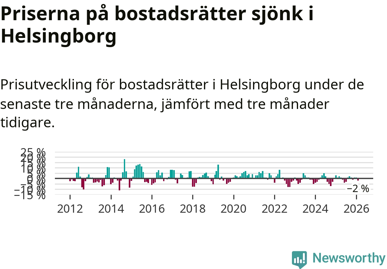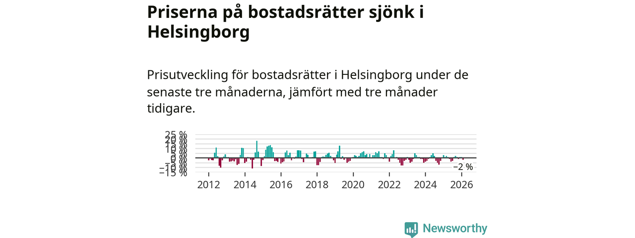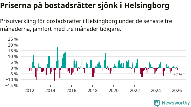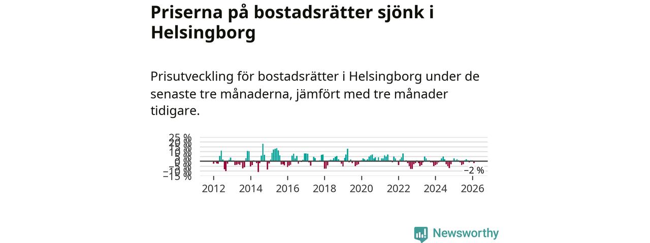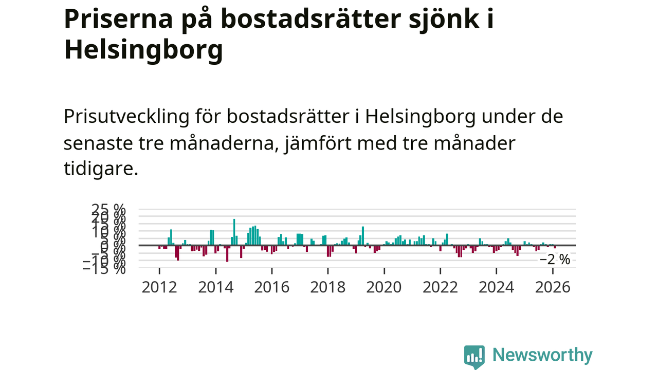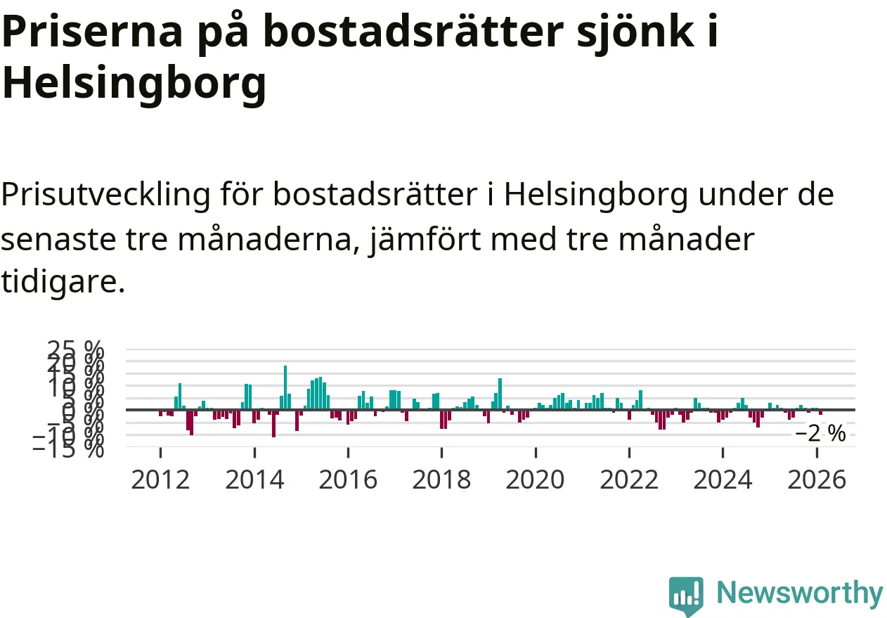 Priserna på bostadsrätter har gått ner i Helsingborgs kommun. Medelpriset på försäljningarna under de senaste tre månaderna visar på en nedgång med 2 procent.