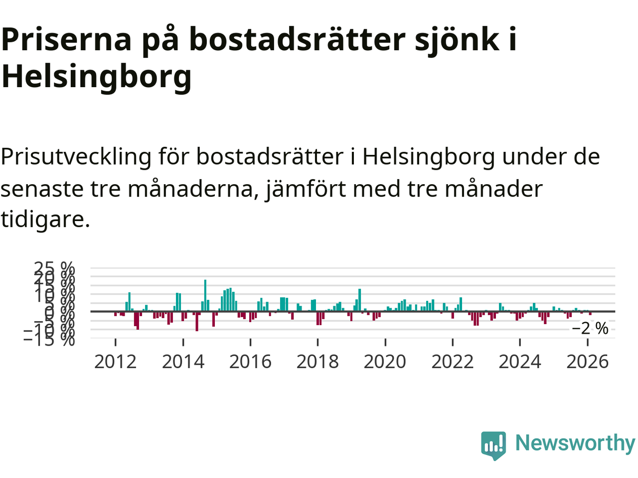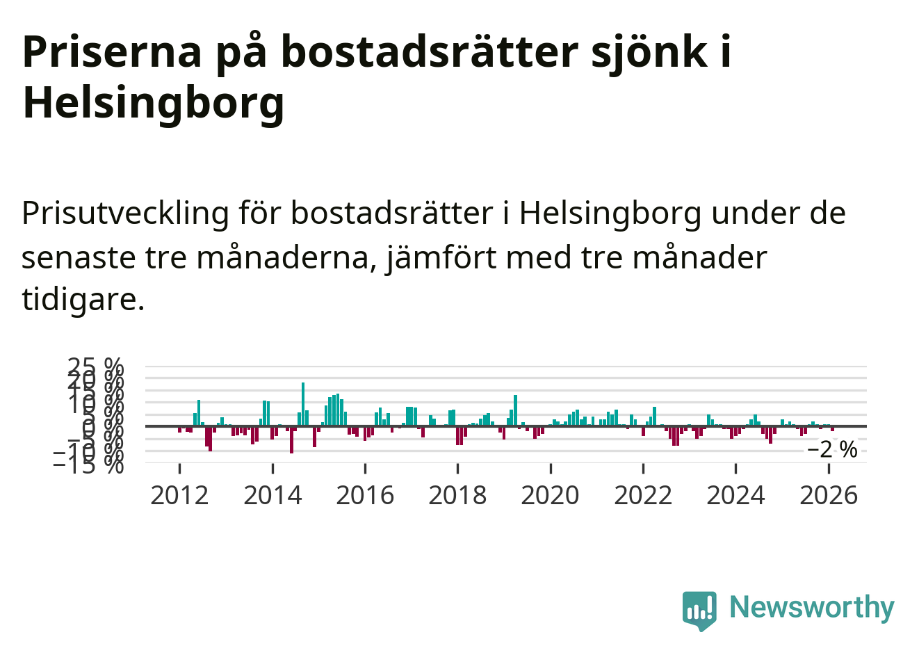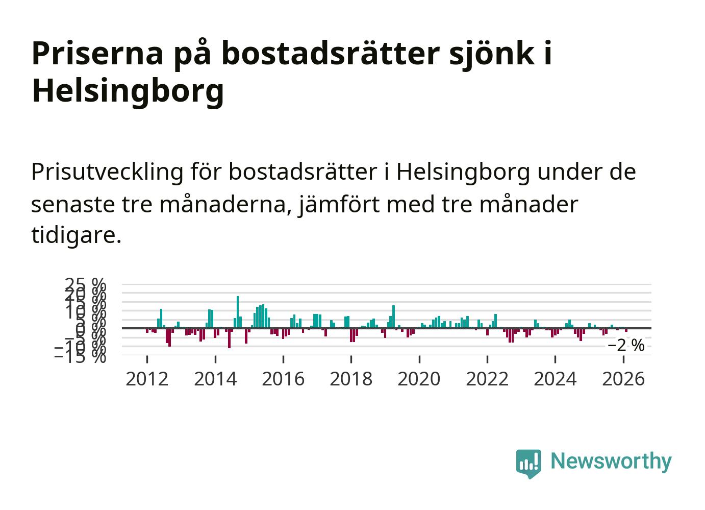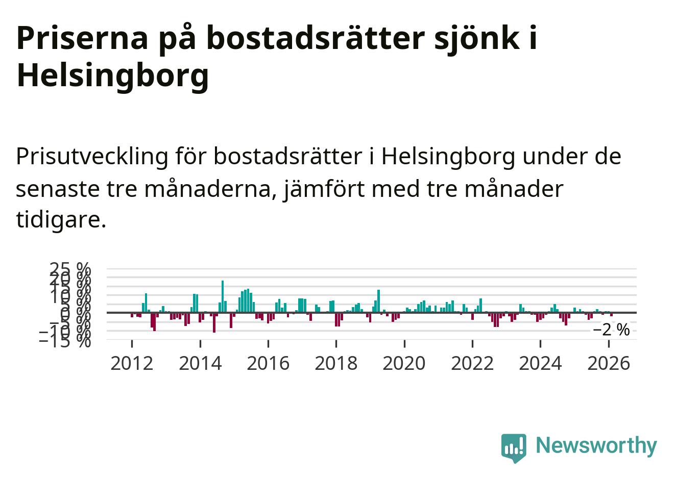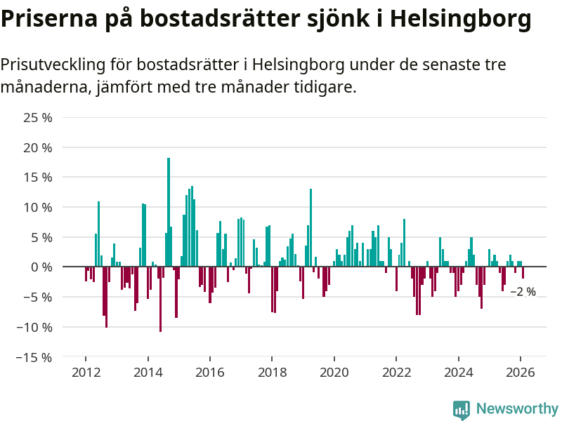 Priserna på bostadsrätter har gått ner i Helsingborgs kommun. Medelpriset på försäljningarna under de senaste tre månaderna visar på en nedgång med 2 procent.