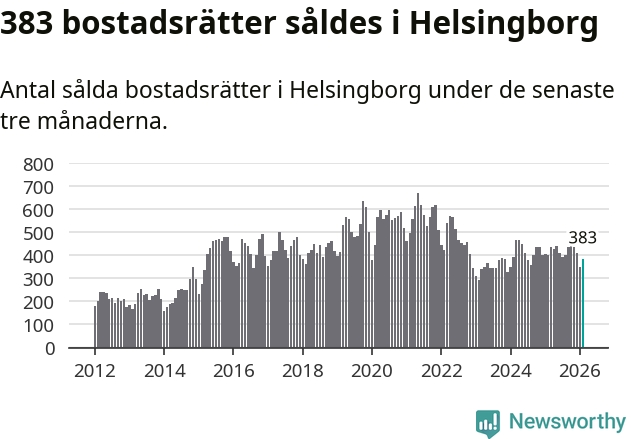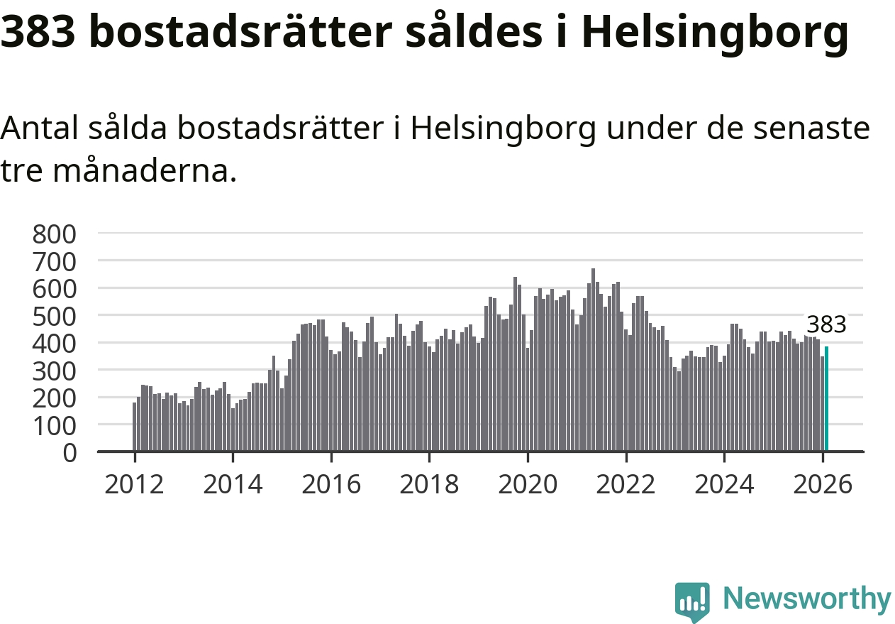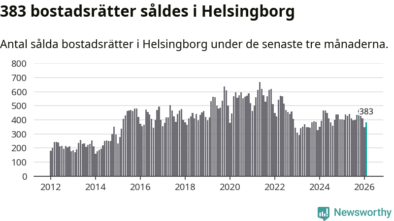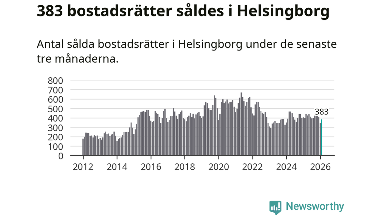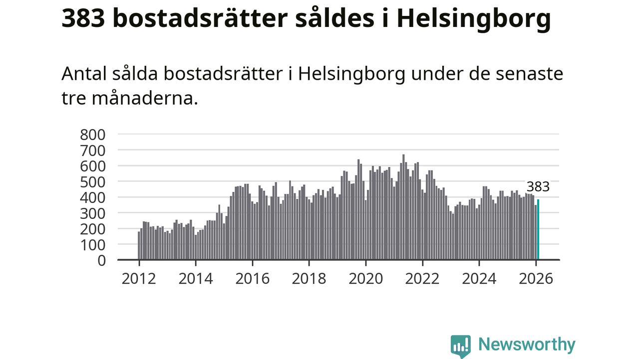 Sammanlagt såldes 383 bostadsrätter i Helsingborgs kommun mellan december och februari till ett genomsnittligt pris på 2,1 miljoner kronor. I fjol gjordes 400 affärer vid den här tiden på året.