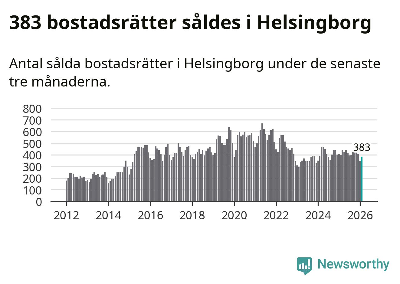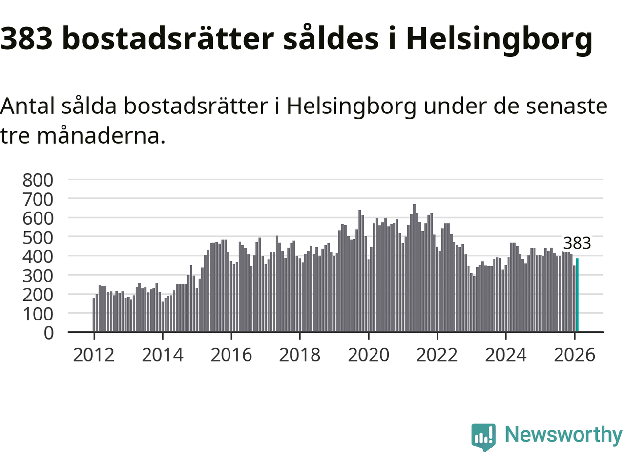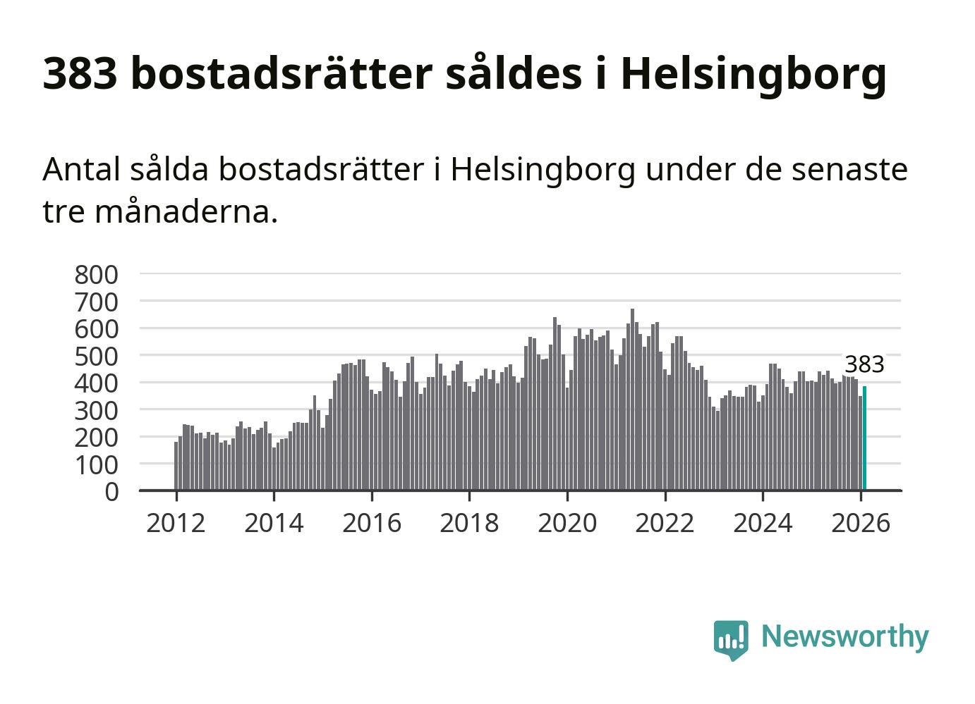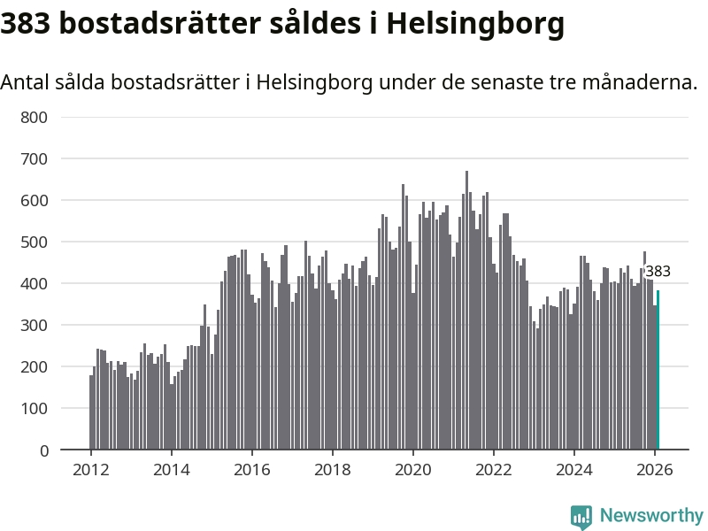 Sammanlagt såldes 383 bostadsrätter i Helsingborgs kommun mellan december och februari till ett genomsnittligt pris på 2,1 miljoner kronor. I fjol gjordes 400 affärer vid den här tiden på året.