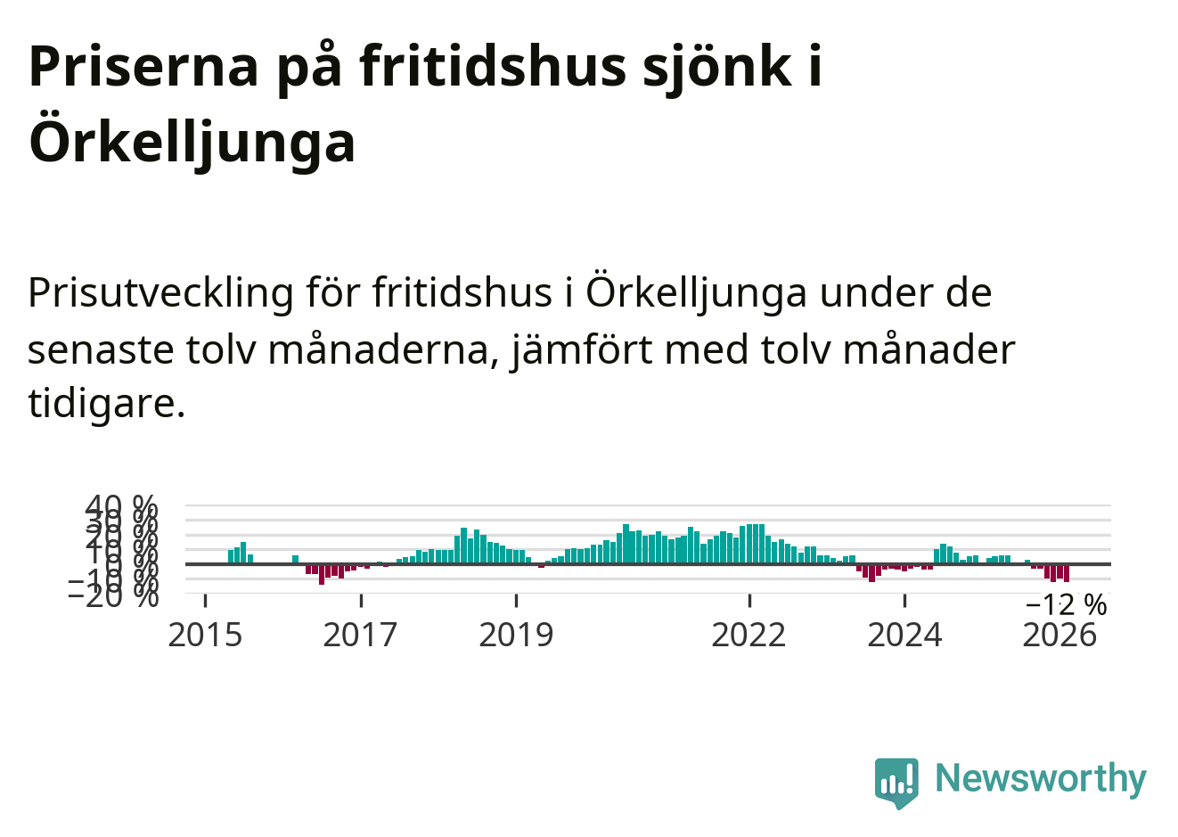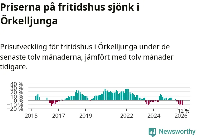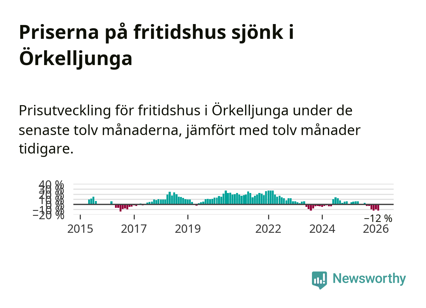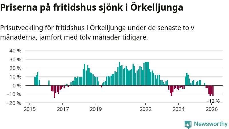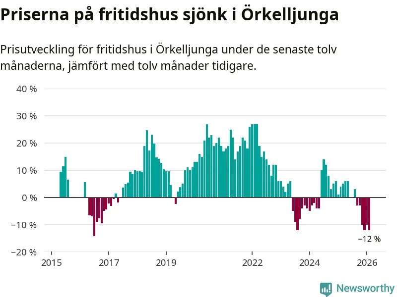 Priserna på fritidshus har gått ner i Örkelljunga kommun. Medelpriset på försäljningarna under de senaste tolv månaderna visar på en nedgång med 12 procent.