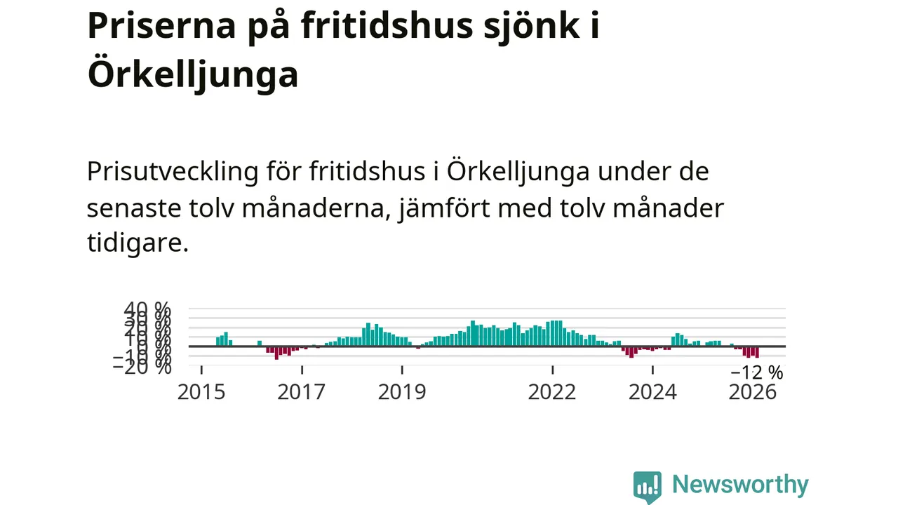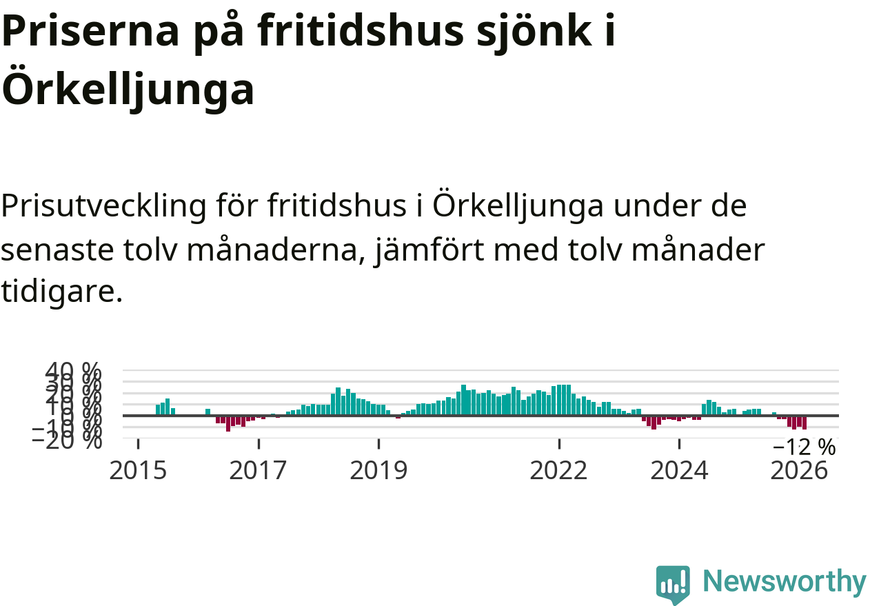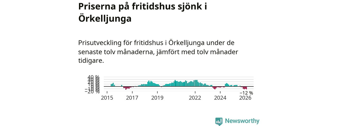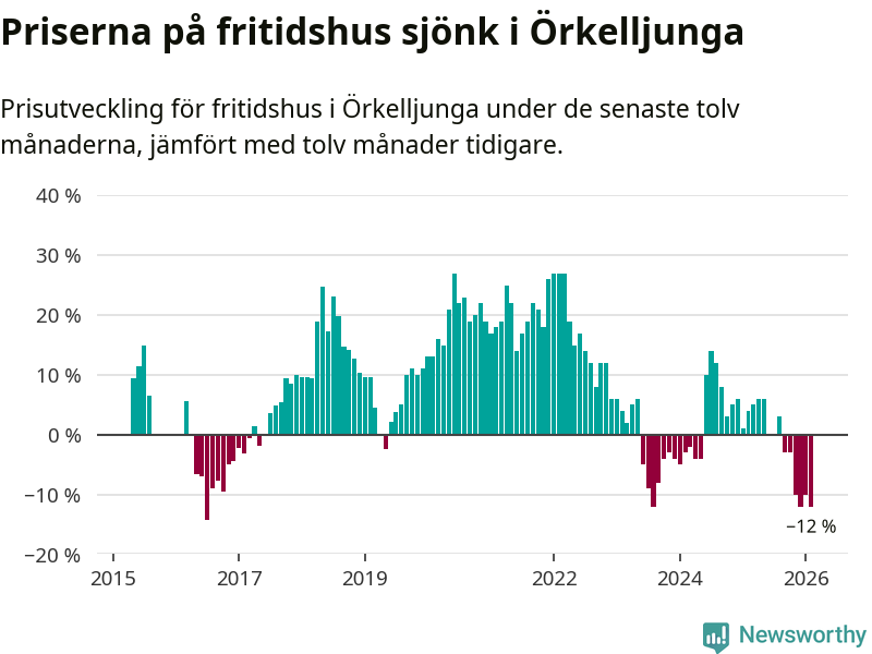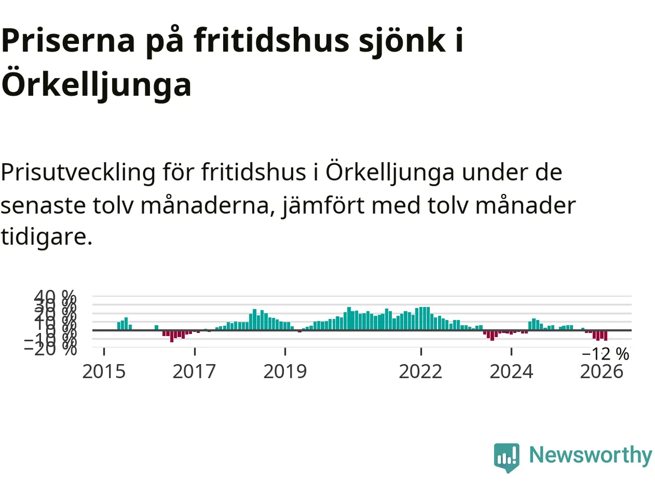 Priserna på fritidshus har gått ner i Örkelljunga kommun. Medelpriset på försäljningarna under de senaste tolv månaderna visar på en nedgång med 12 procent.