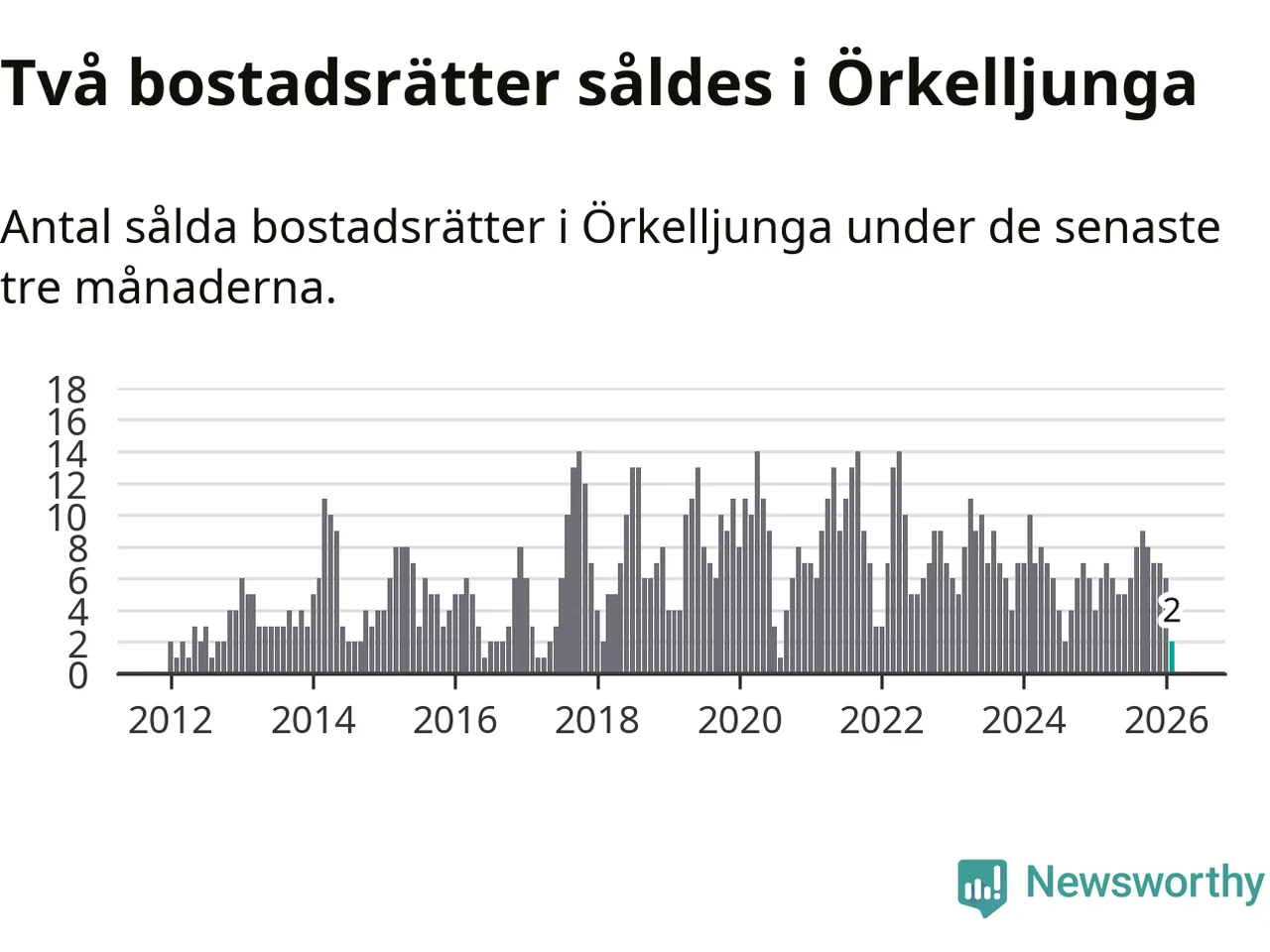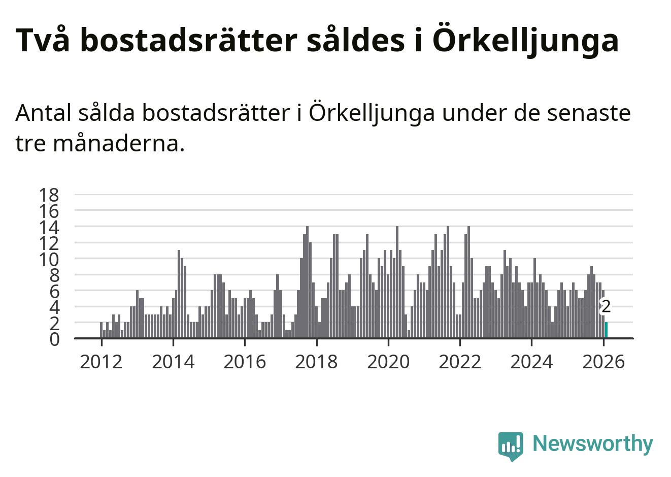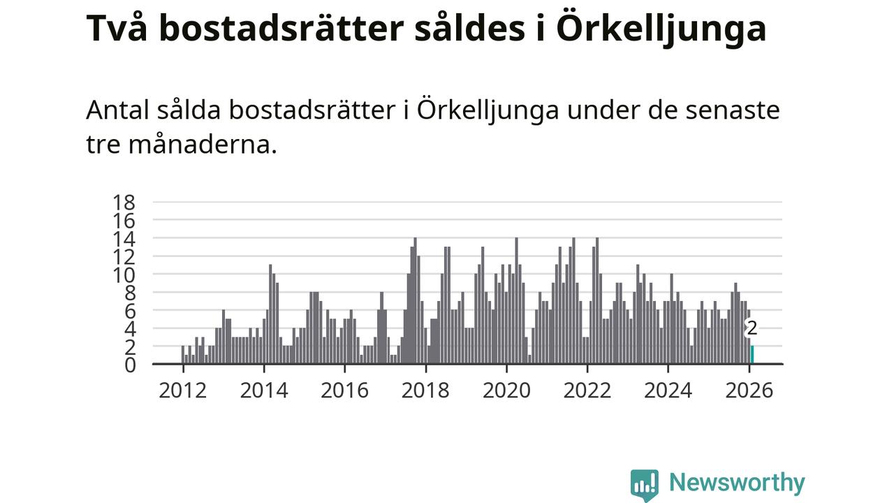 Mellan december och februari gjordes sammanlagt två affärer med bostadsrätter i Örkelljunga kommun. Det kan jämföras med sex vid motsvarande tid i fjol.