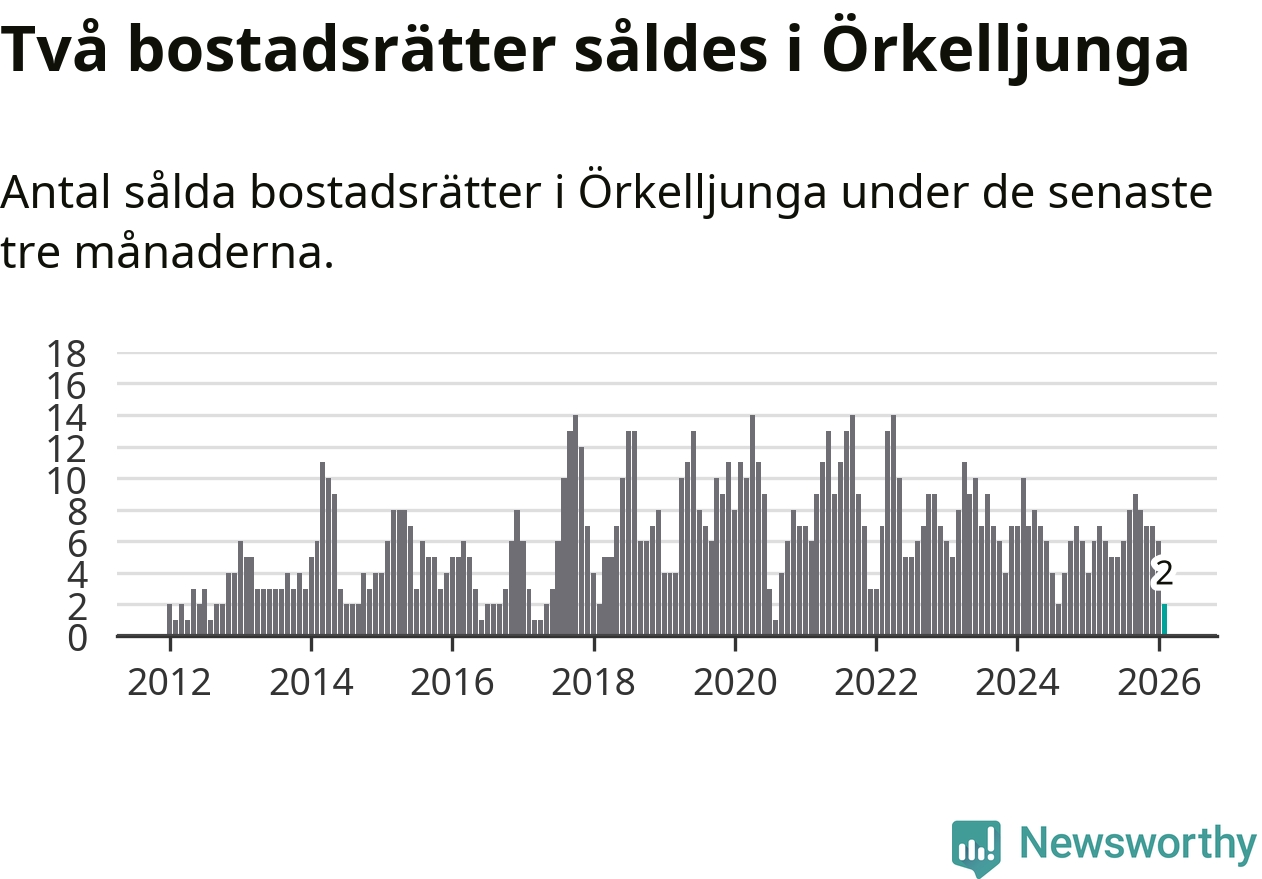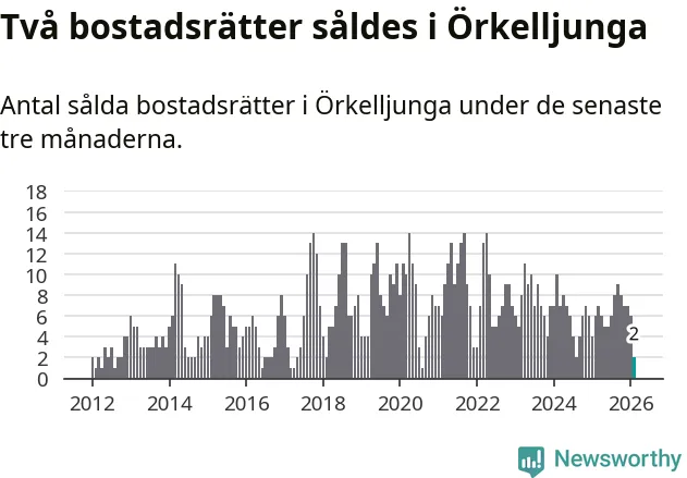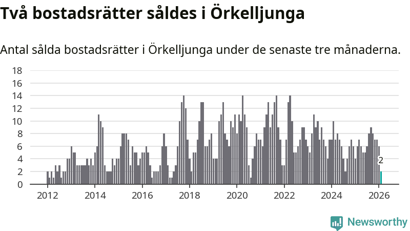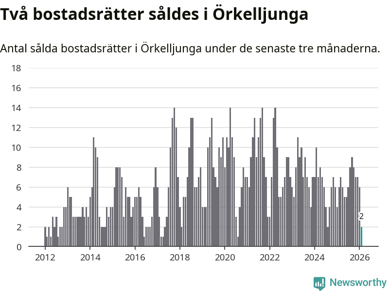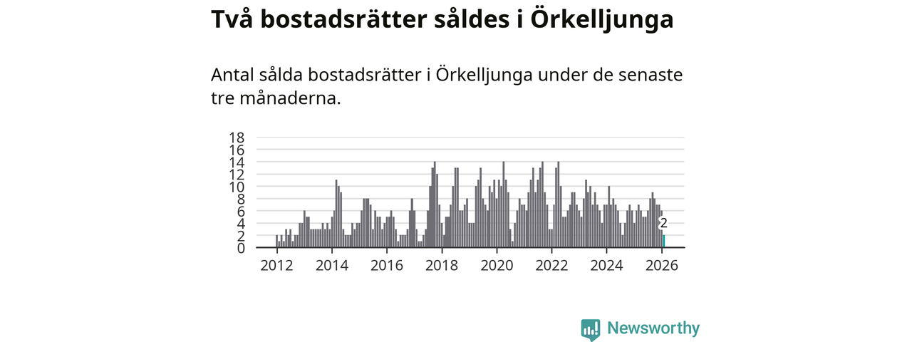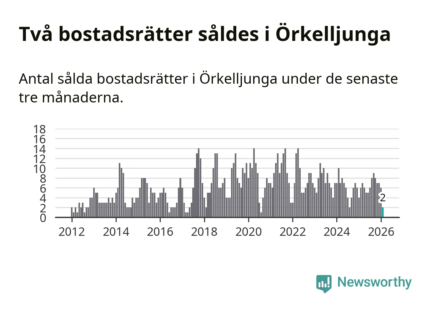 Mellan december och februari gjordes sammanlagt två affärer med bostadsrätter i Örkelljunga kommun. Det kan jämföras med sex vid motsvarande tid i fjol.