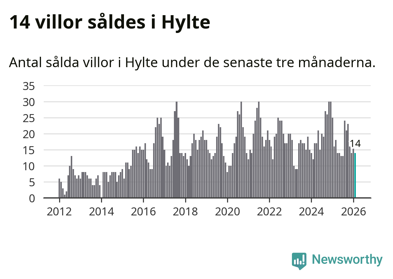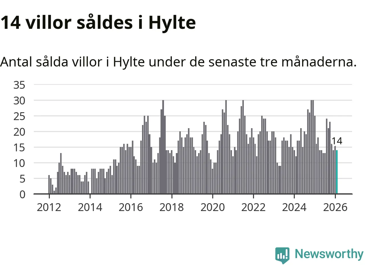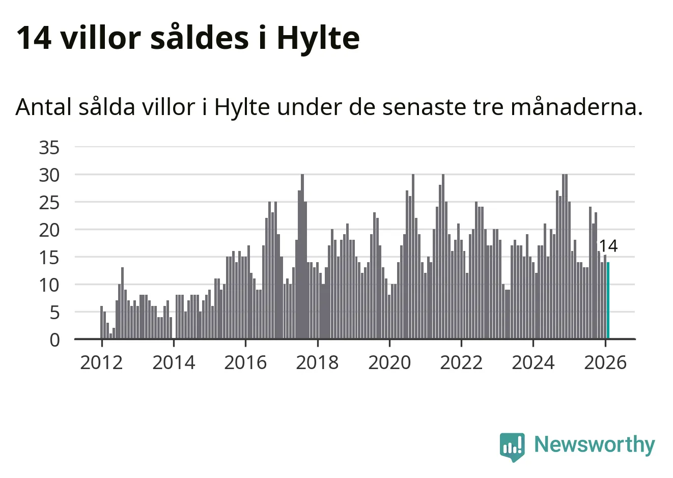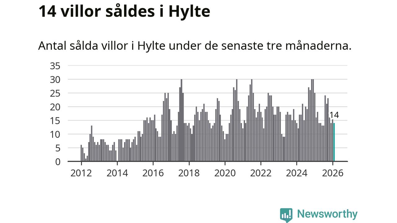 Mellan december och februari gjordes sammanlagt 14 affärer med villor i Hylte kommun. Det kan jämföras med 16 vid motsvarande tid i fjol.