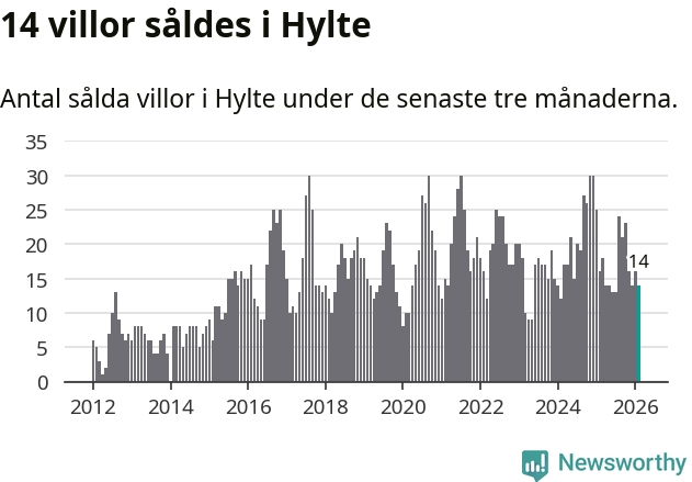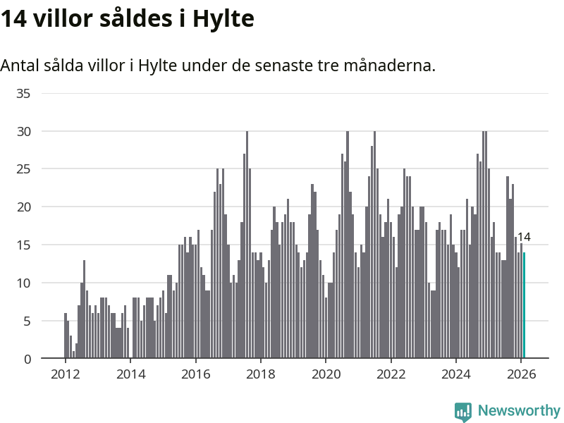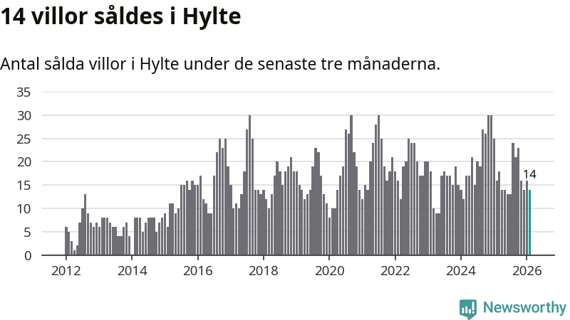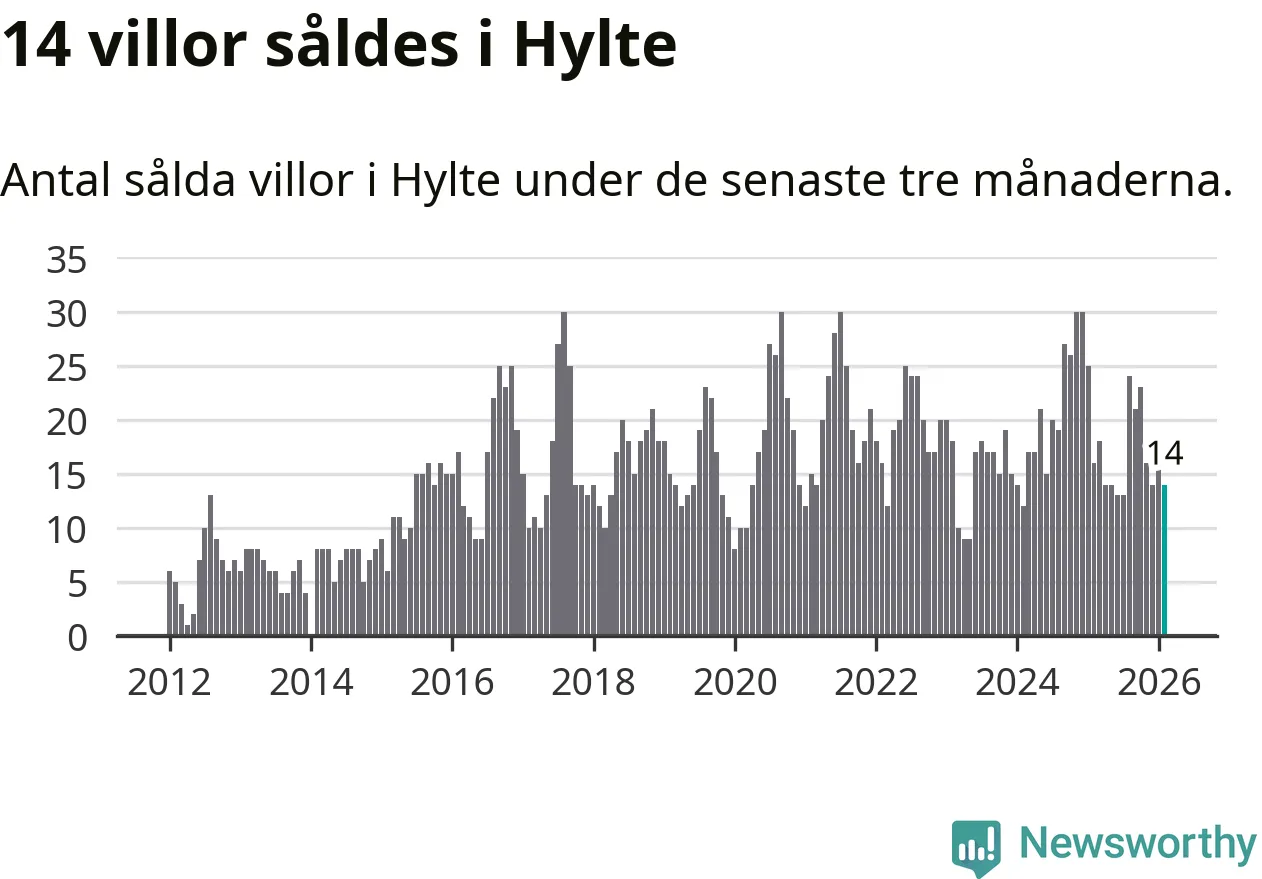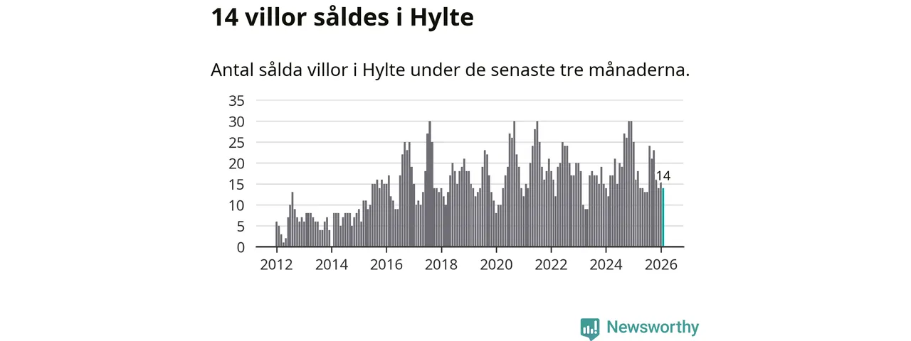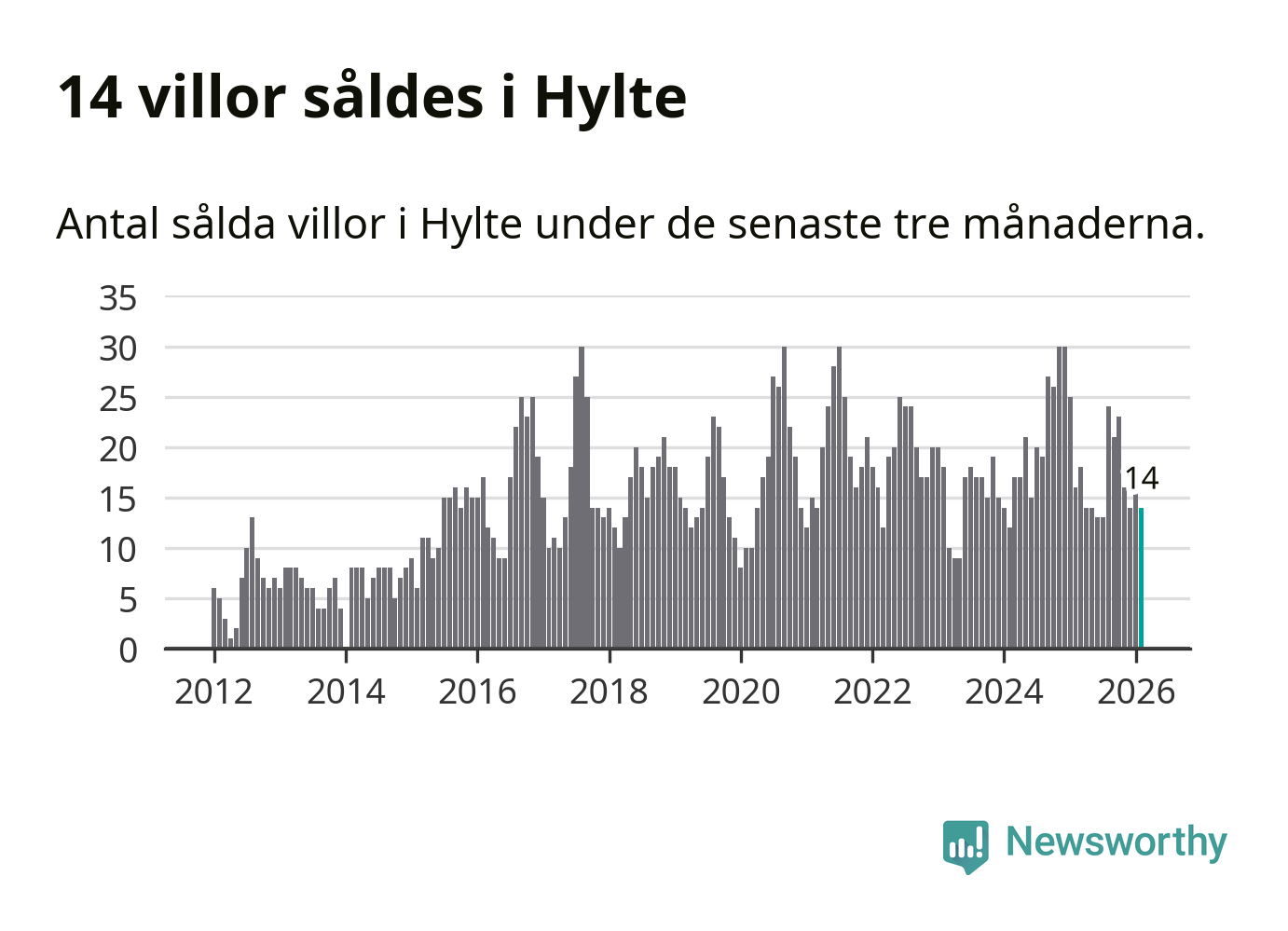 Mellan december och februari gjordes sammanlagt 14 affärer med villor i Hylte kommun. Det kan jämföras med 16 vid motsvarande tid i fjol.