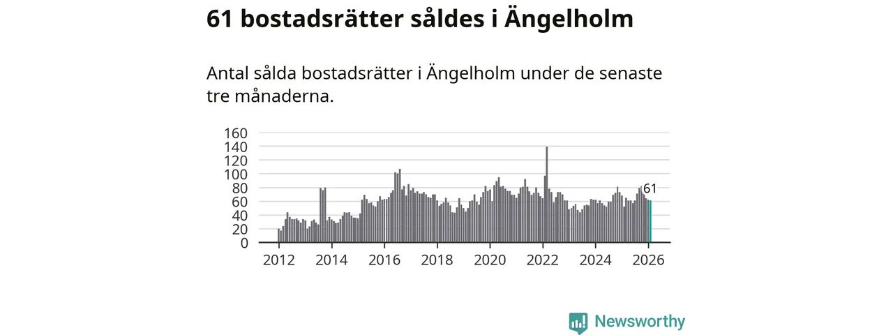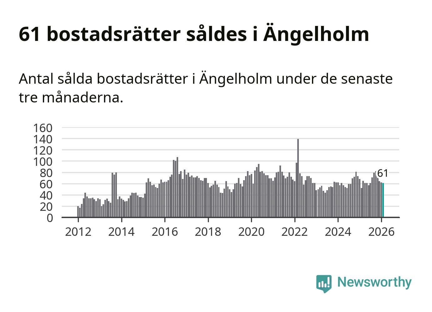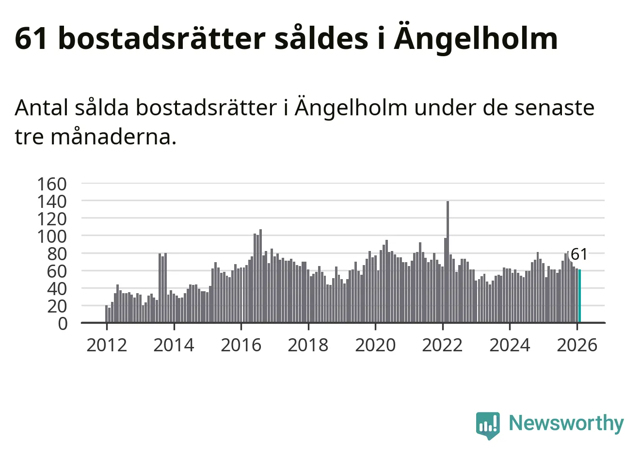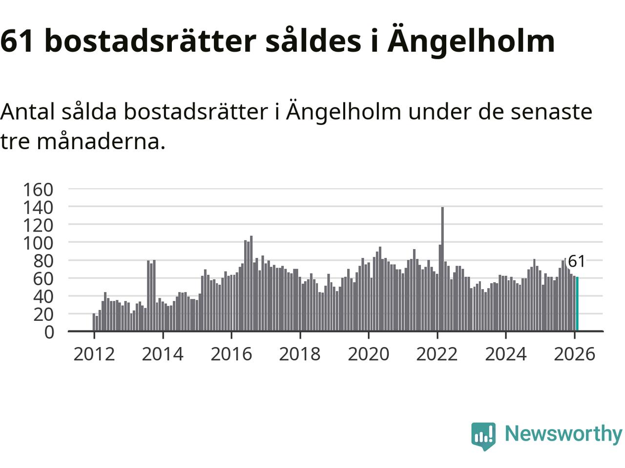 Sammanlagt såldes 61 bostadsrätter i Ängelholms kommun mellan december och februari till ett genomsnittligt pris på 2,3 miljoner kronor. I fjol gjordes 52 affärer vid den här tiden på året.