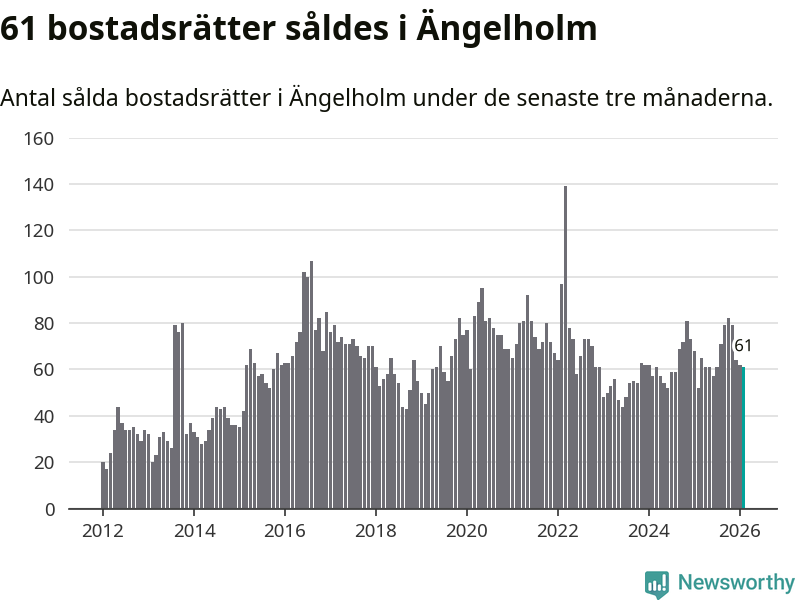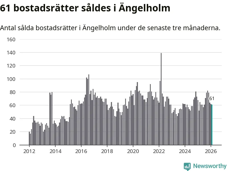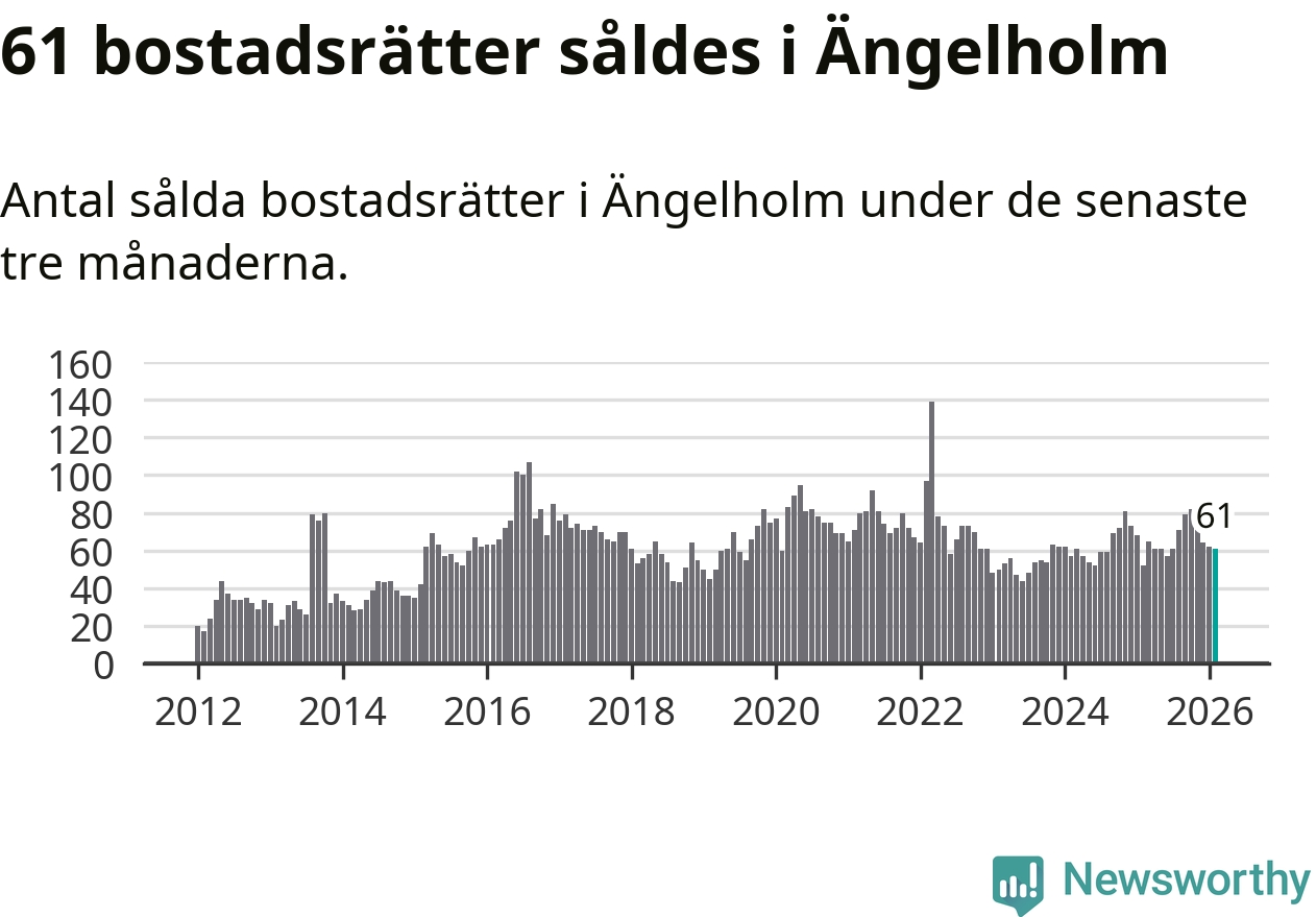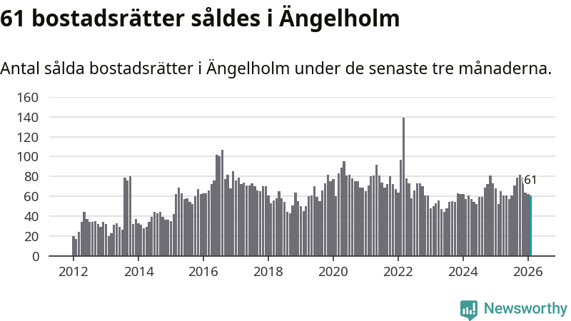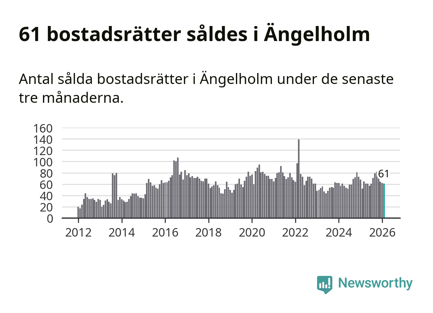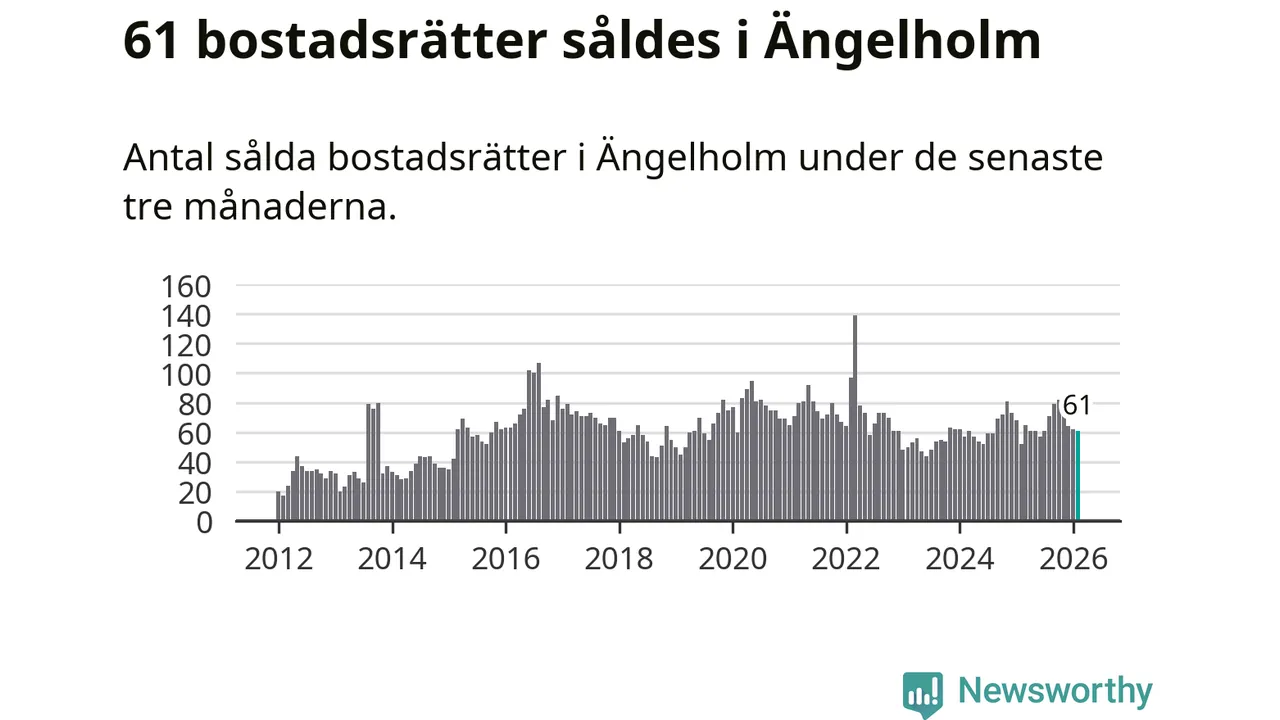 Sammanlagt såldes 61 bostadsrätter i Ängelholms kommun mellan december och februari till ett genomsnittligt pris på 2,3 miljoner kronor. I fjol gjordes 52 affärer vid den här tiden på året.