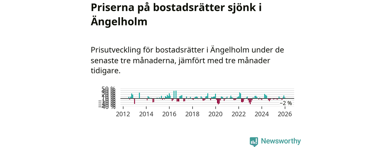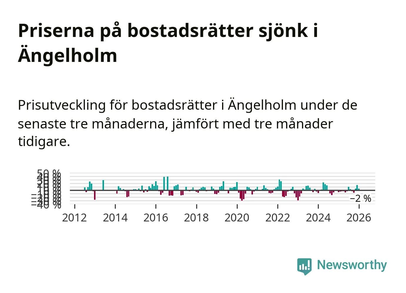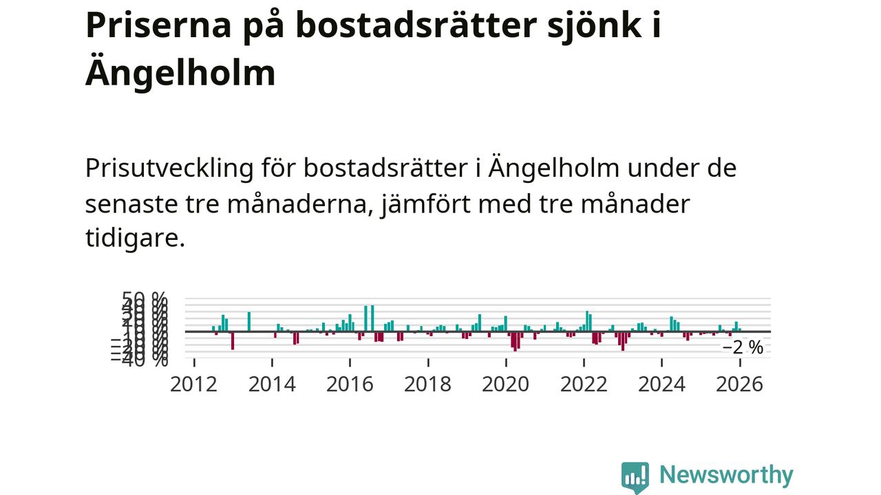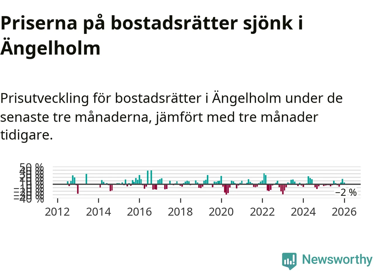 Priserna på bostadsrätter har gått ner i Ängelholms kommun. Medelpriset på försäljningarna under de senaste tre månaderna visar på en nedgång med 2 procent.