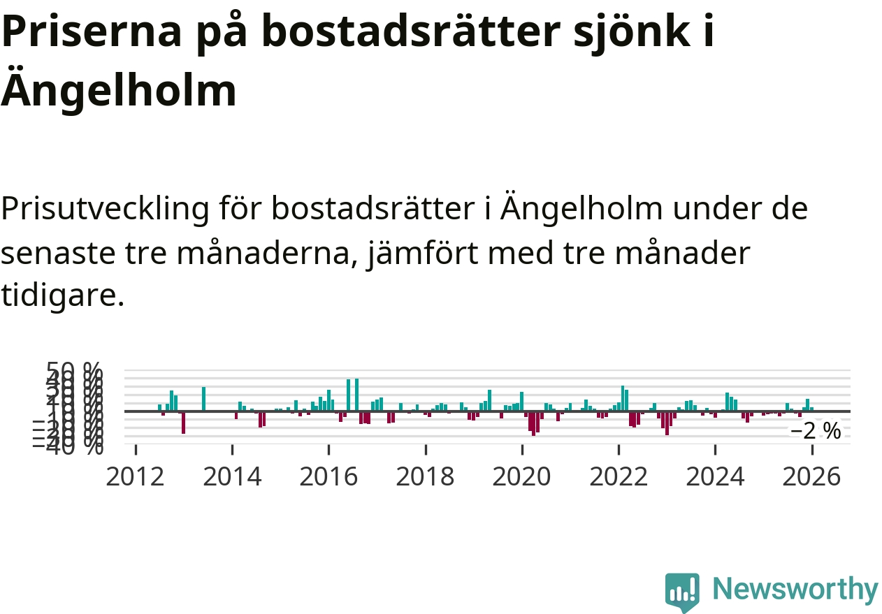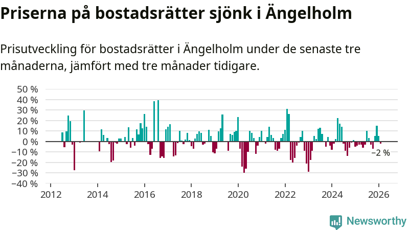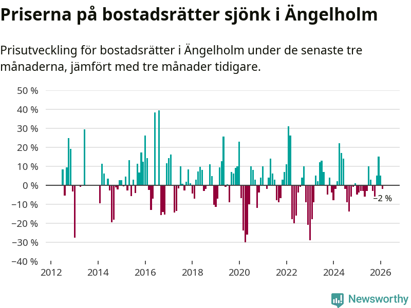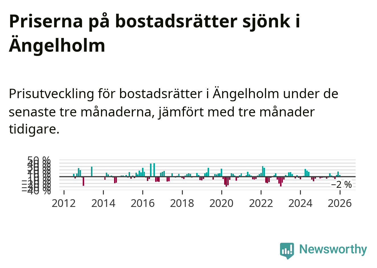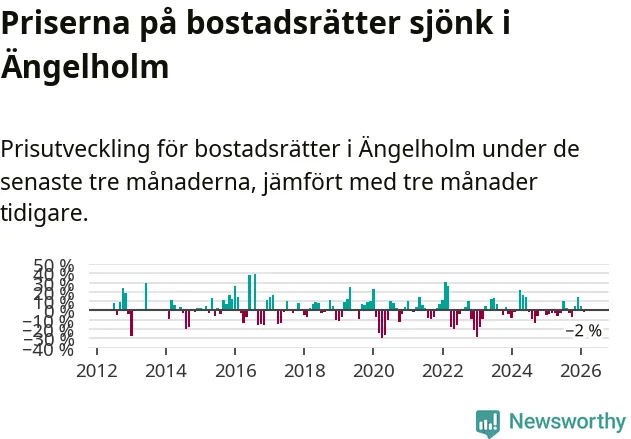 Priserna på bostadsrätter har gått ner i Ängelholms kommun. Medelpriset på försäljningarna under de senaste tre månaderna visar på en nedgång med 2 procent.