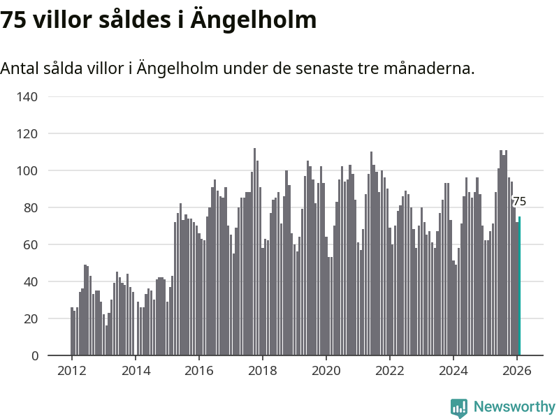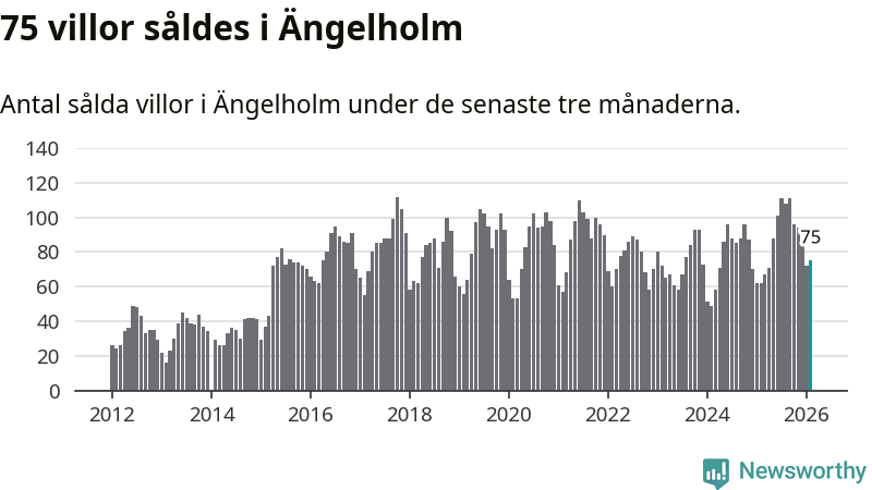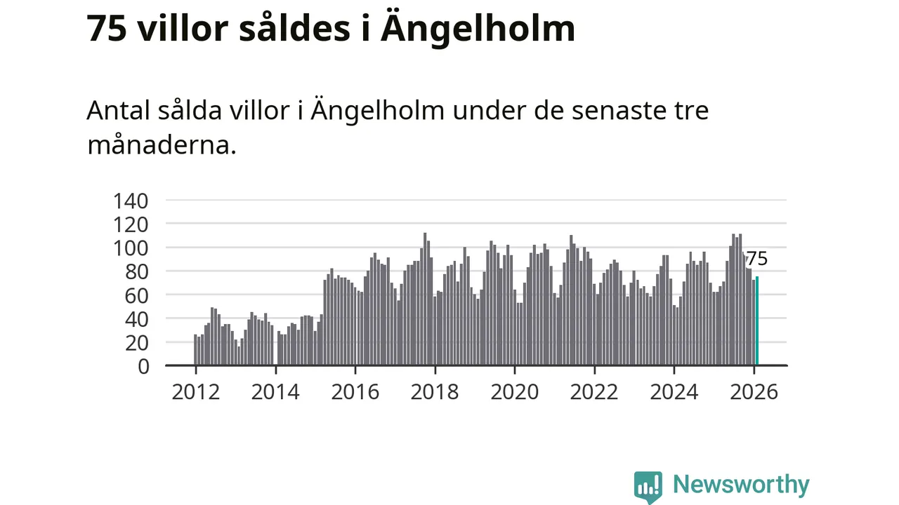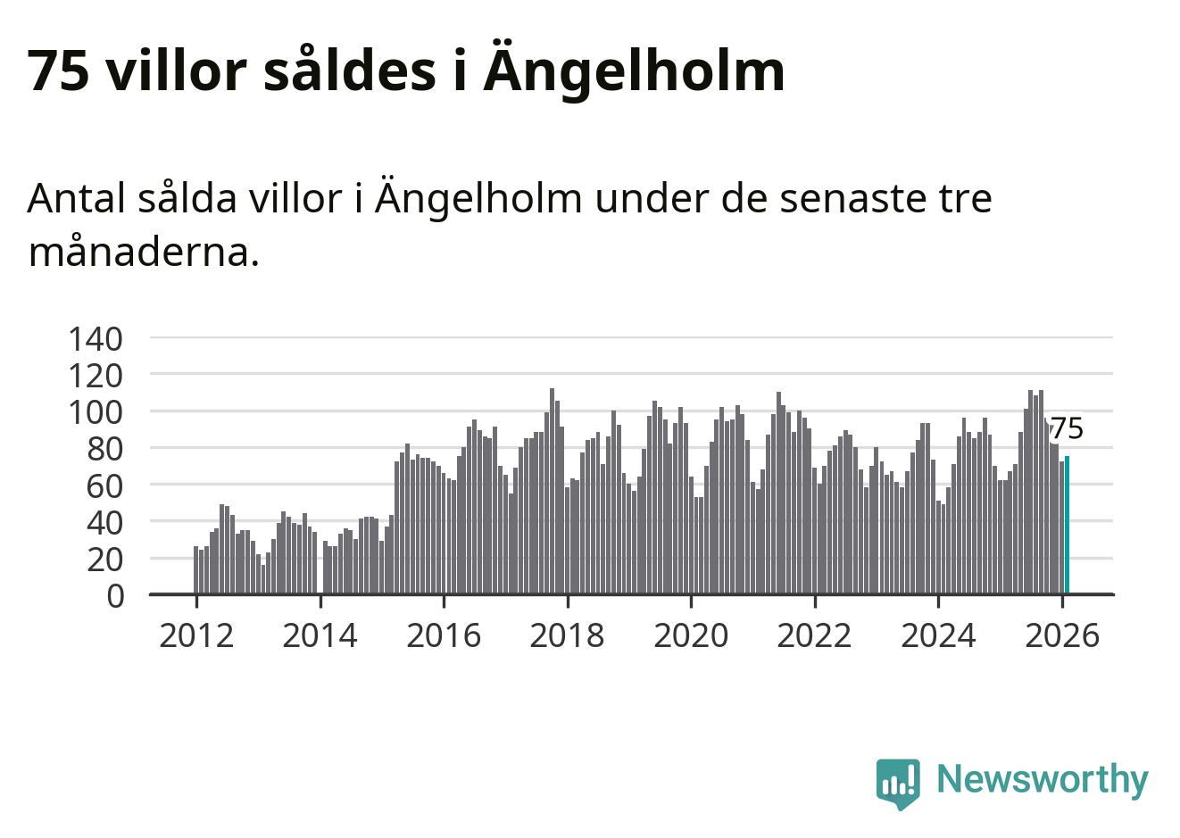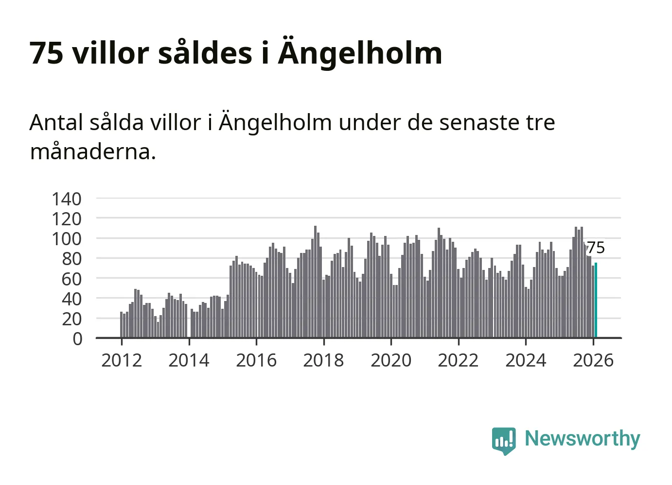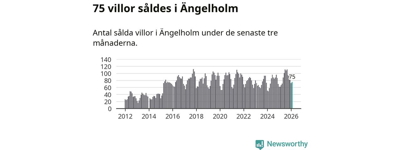 Sammanlagt såldes 75 villor i Ängelholms kommun mellan december och februari till ett genomsnittligt pris på 3,8 miljoner kronor. I fjol gjordes 62 affärer vid den här tiden på året.