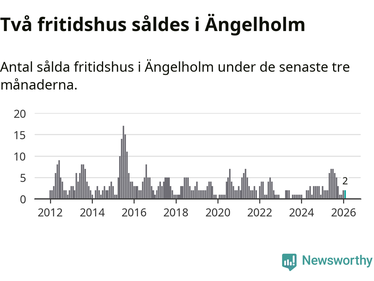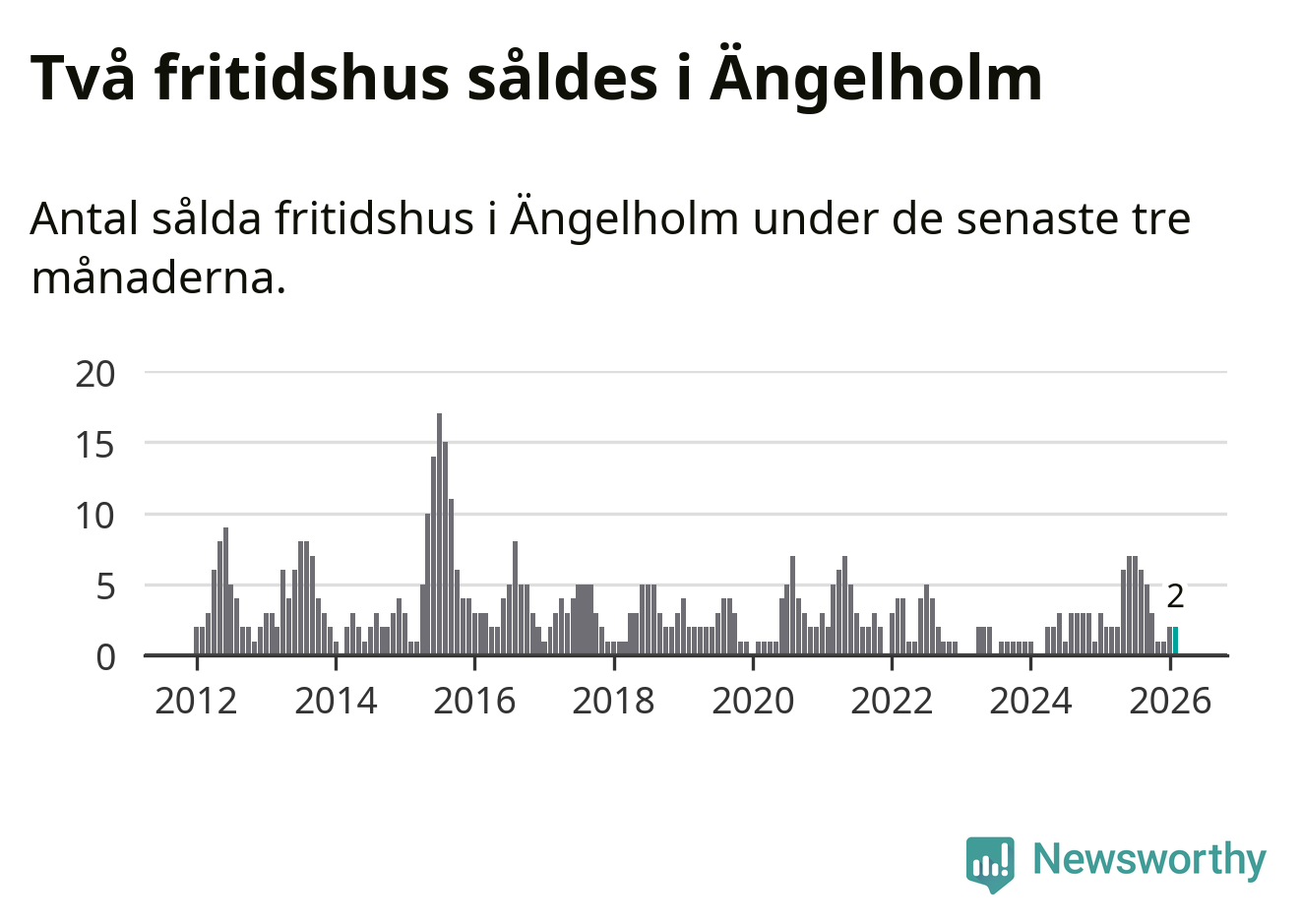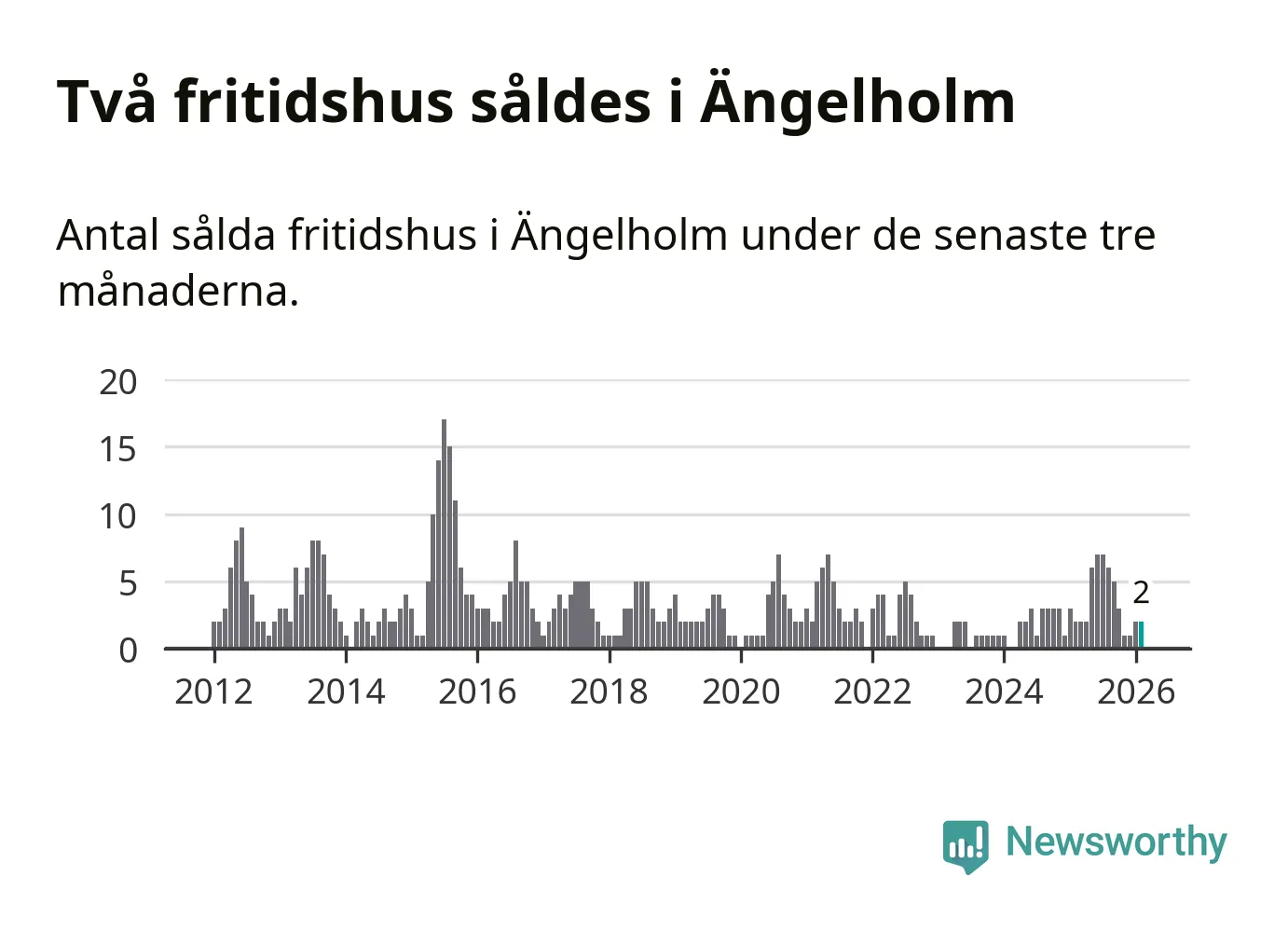 Mellan december och februari gjordes sammanlagt två affärer med fritidshus i Ängelholms kommun. Det är lika många affärer som vid motsvarande tid i fjol.