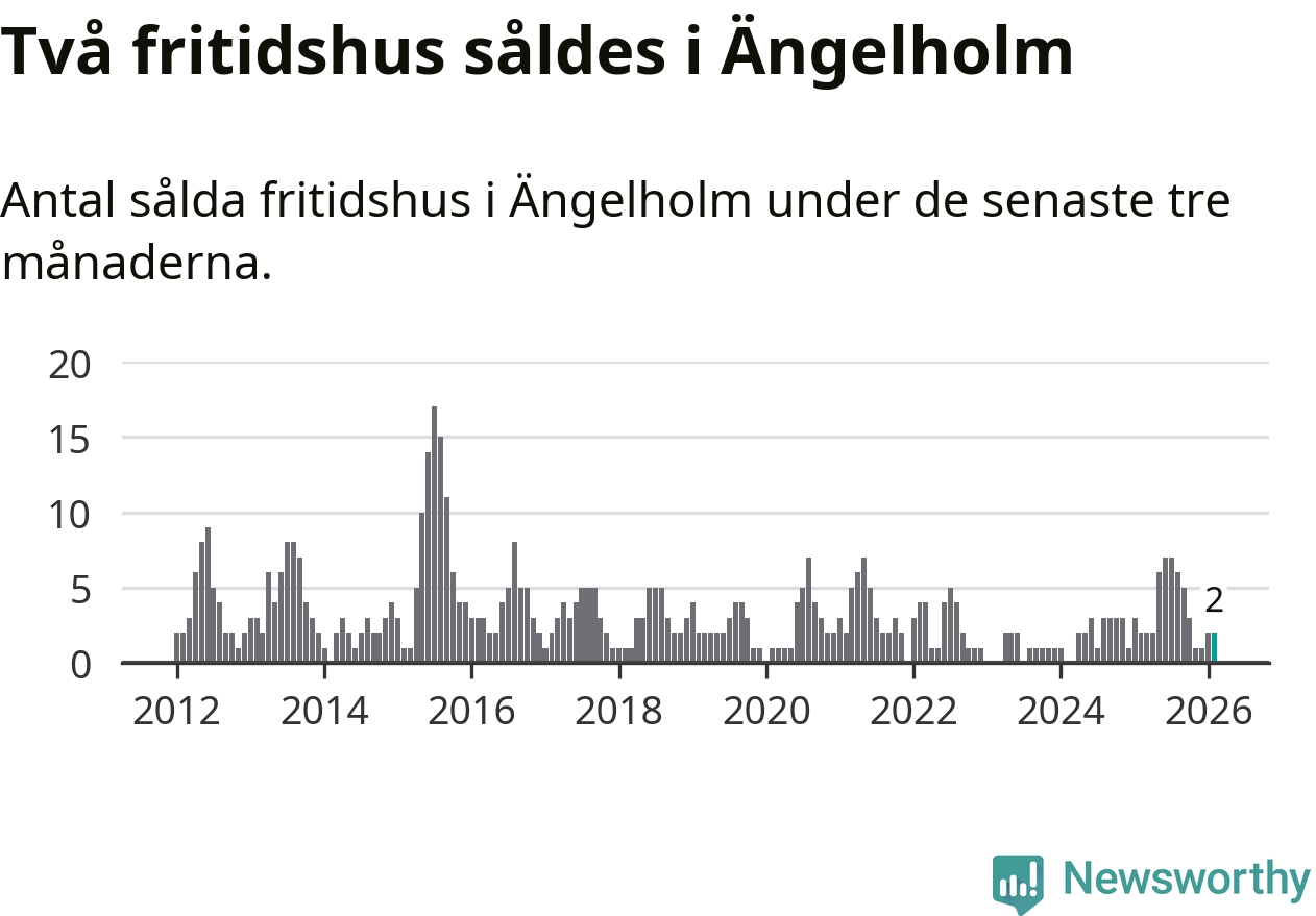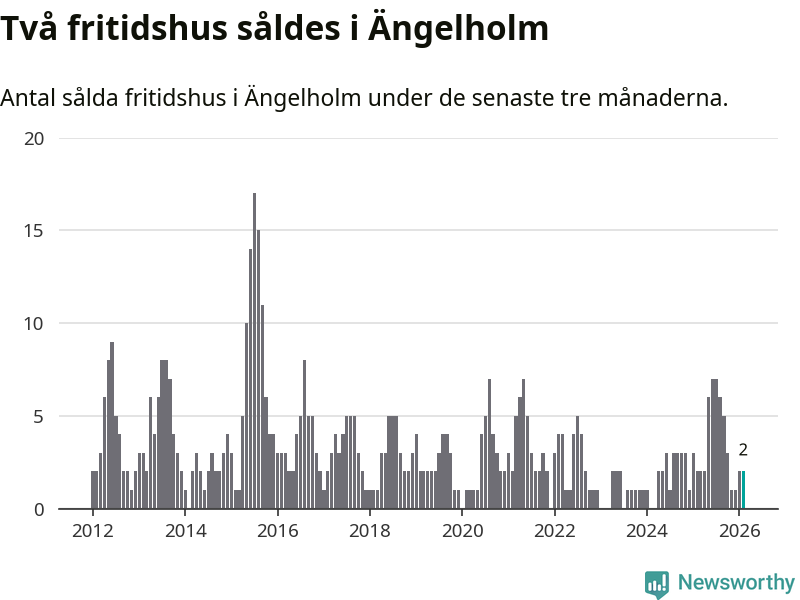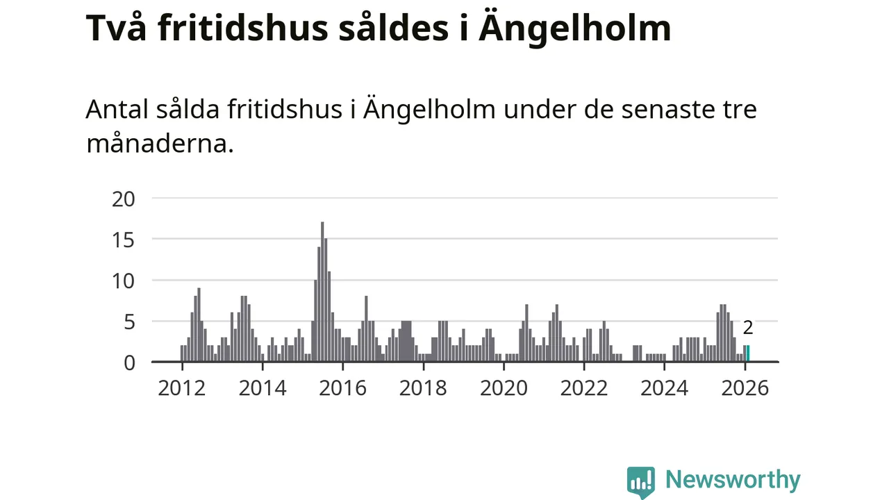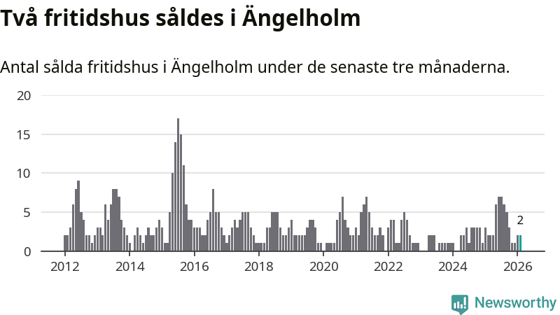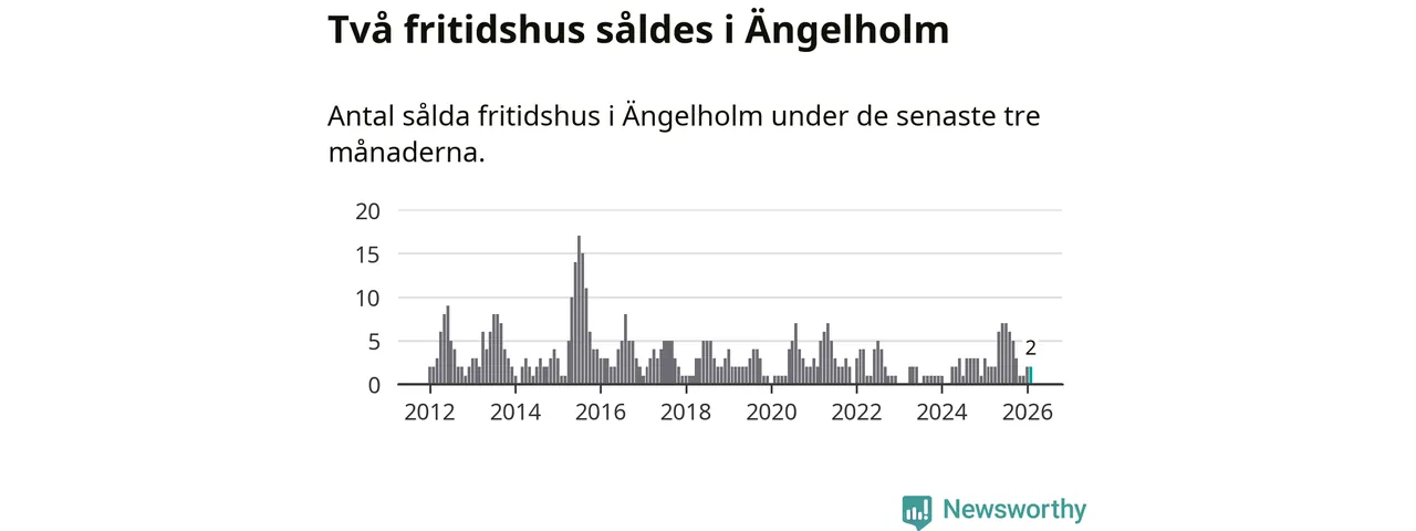 Mellan december och februari gjordes sammanlagt två affärer med fritidshus i Ängelholms kommun. Det är lika många affärer som vid motsvarande tid i fjol.