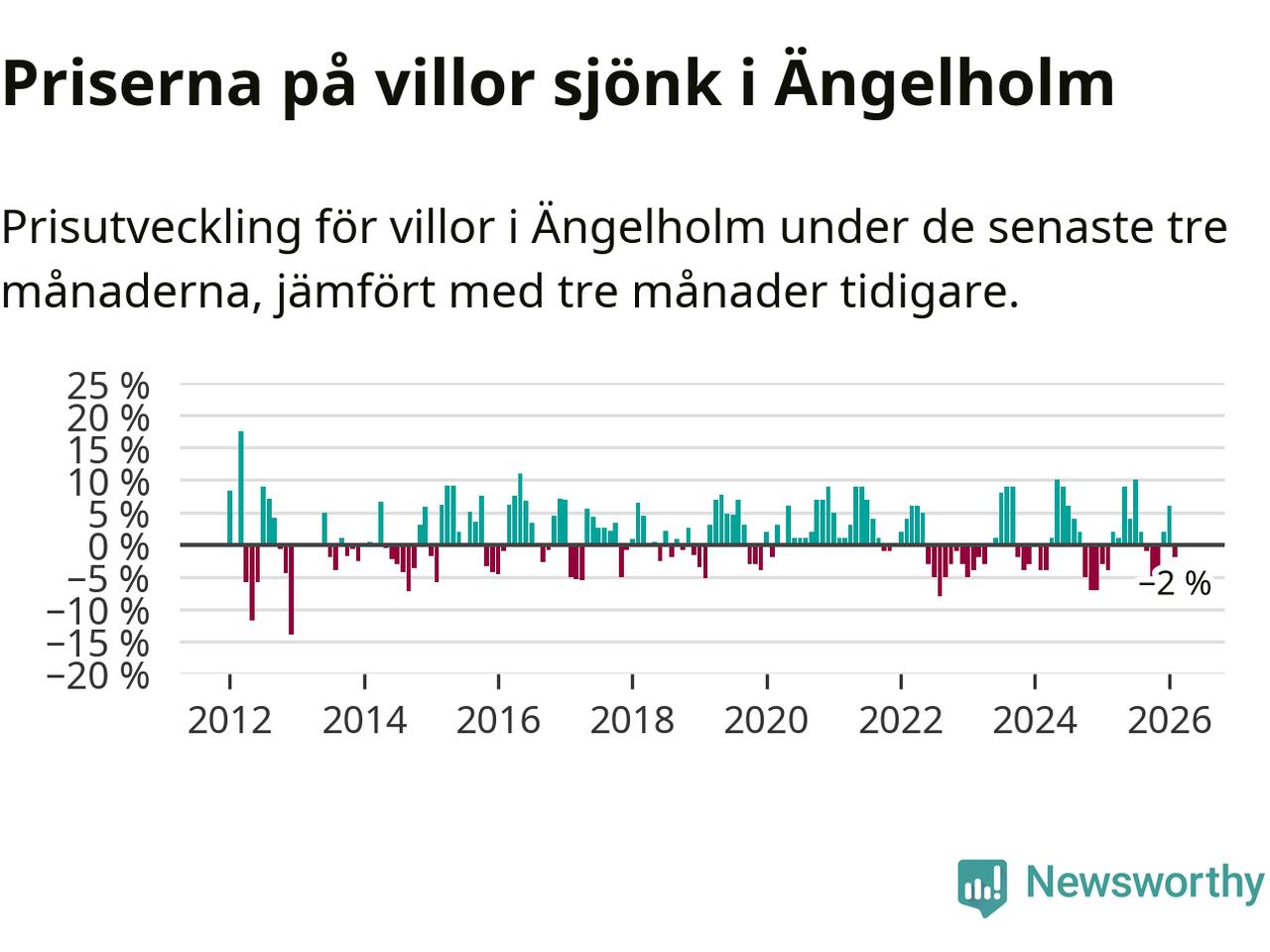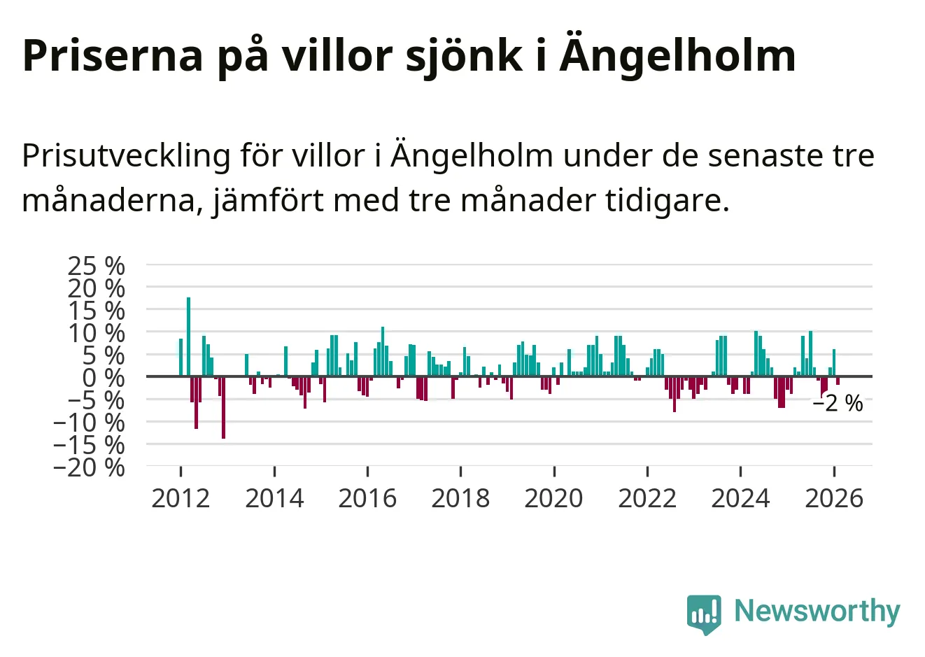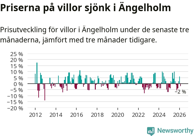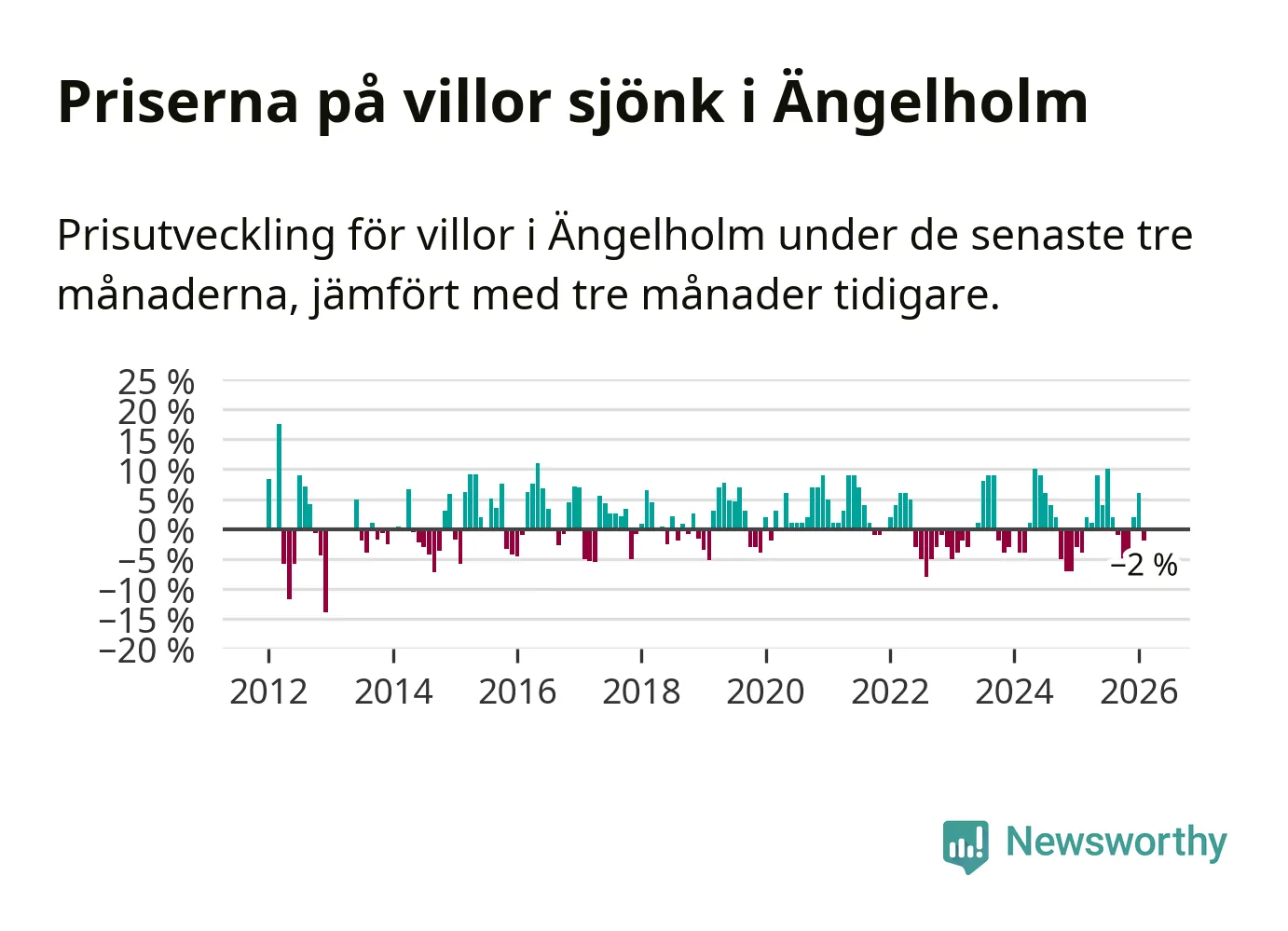 Villapriserna har gått ner i Ängelholms kommun. Medelpriset på försäljningarna under de senaste tre månaderna visar på en nedgång med 2 procent.