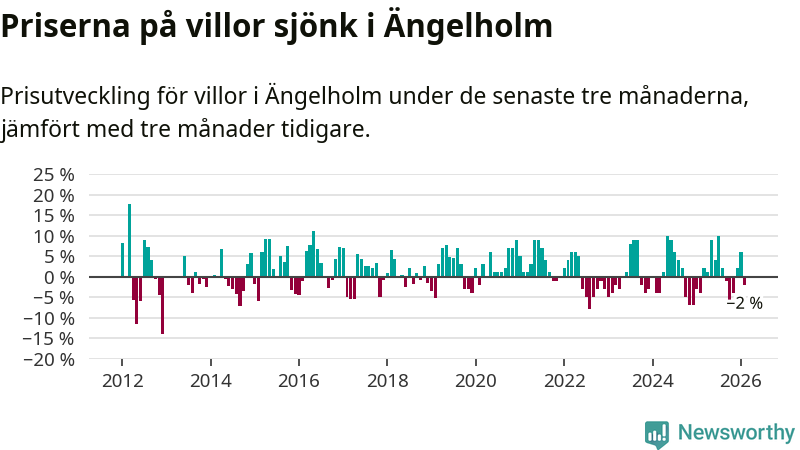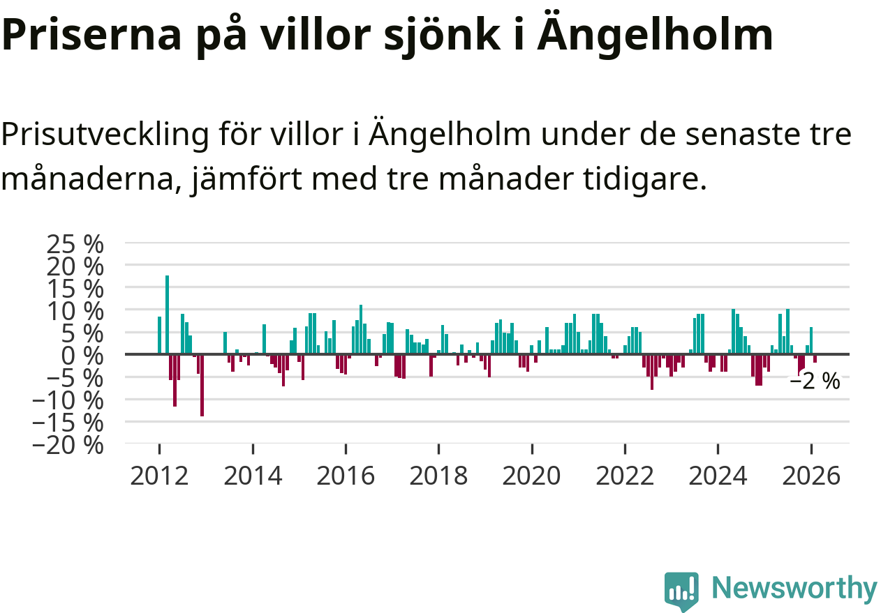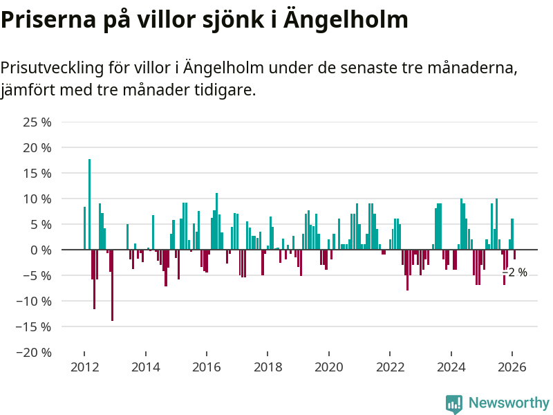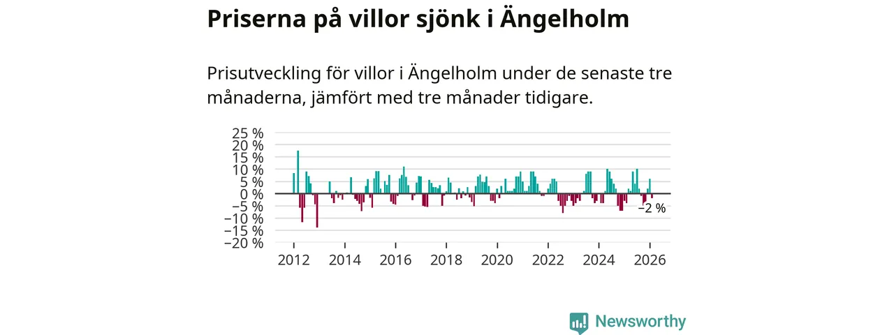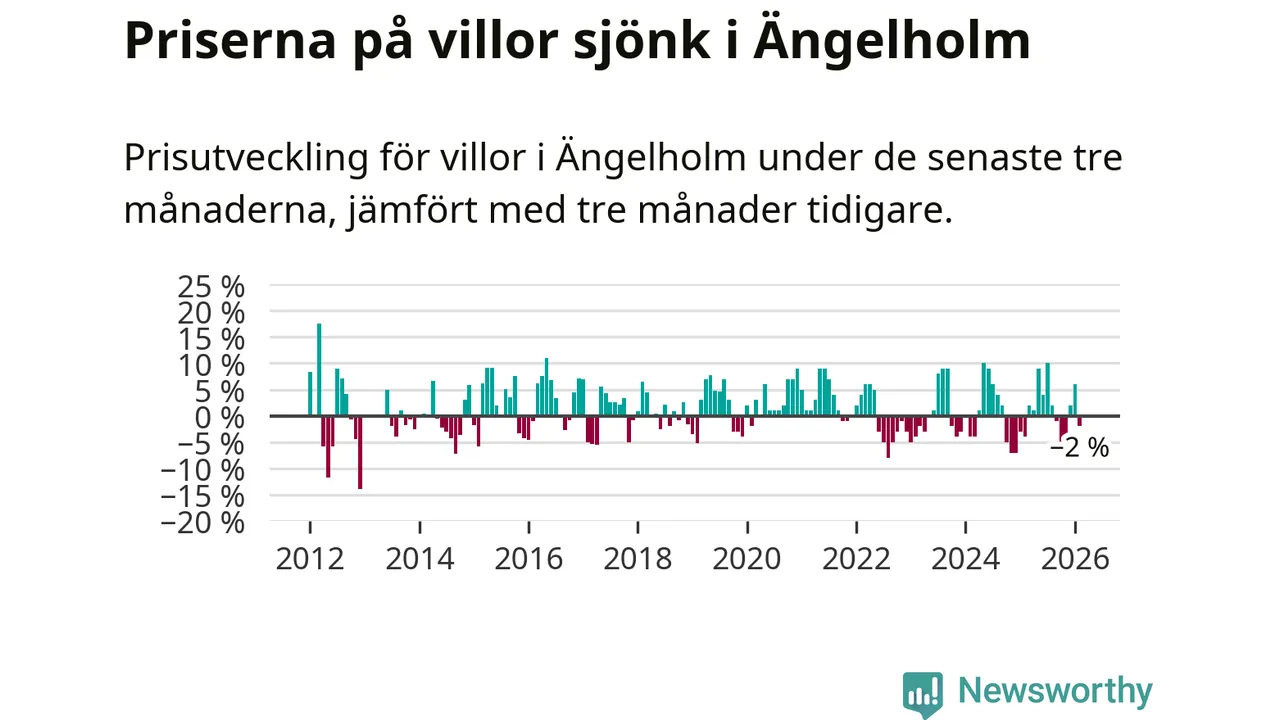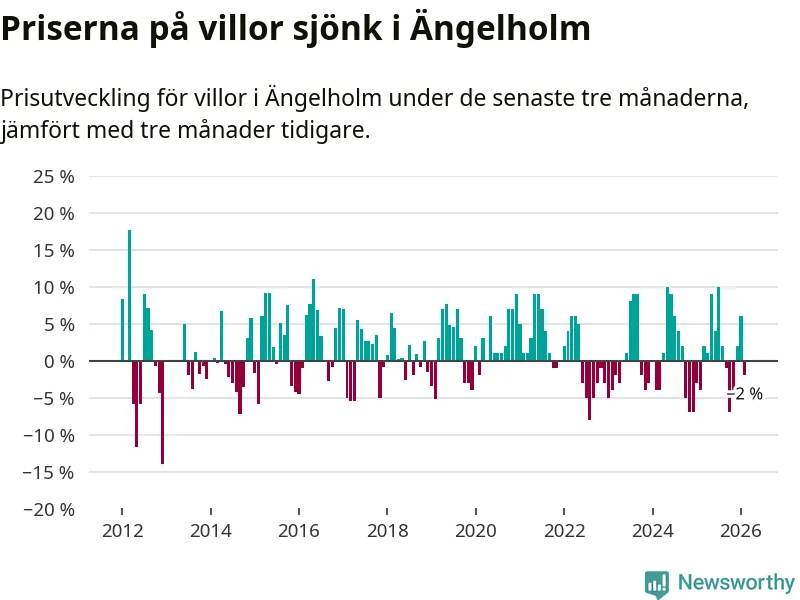 Villapriserna har gått ner i Ängelholms kommun. Medelpriset på försäljningarna under de senaste tre månaderna visar på en nedgång med 2 procent.
