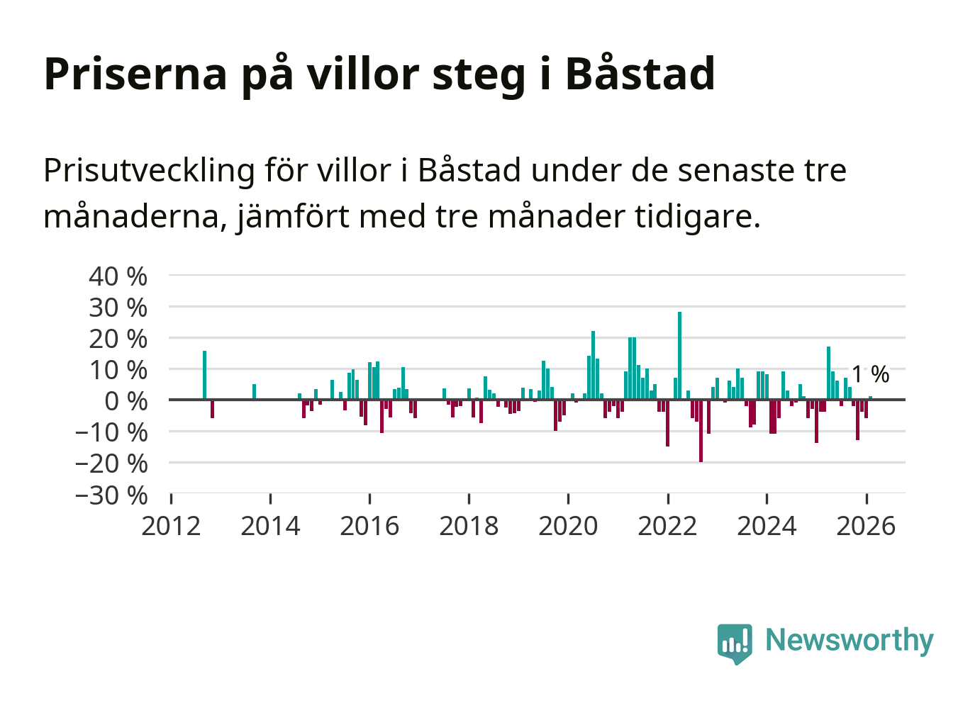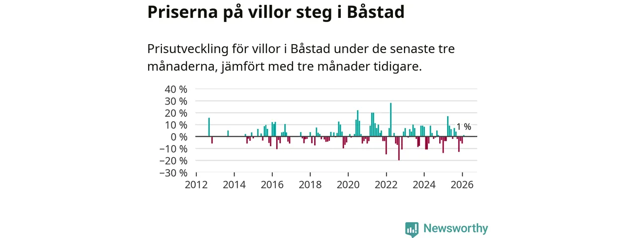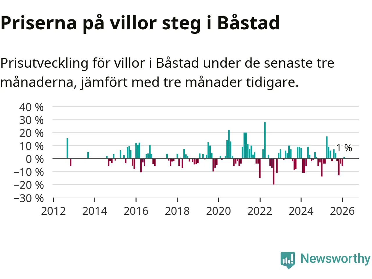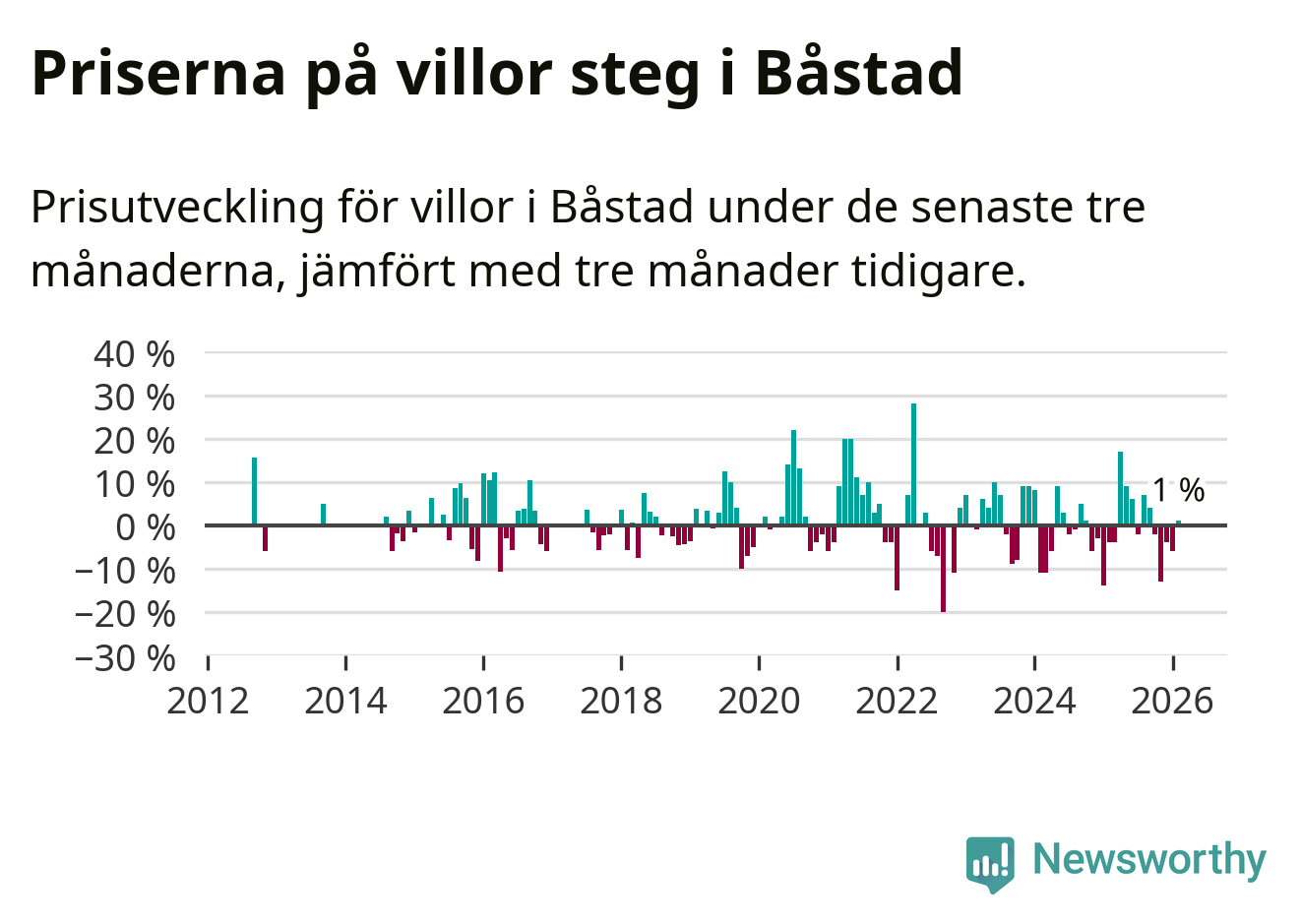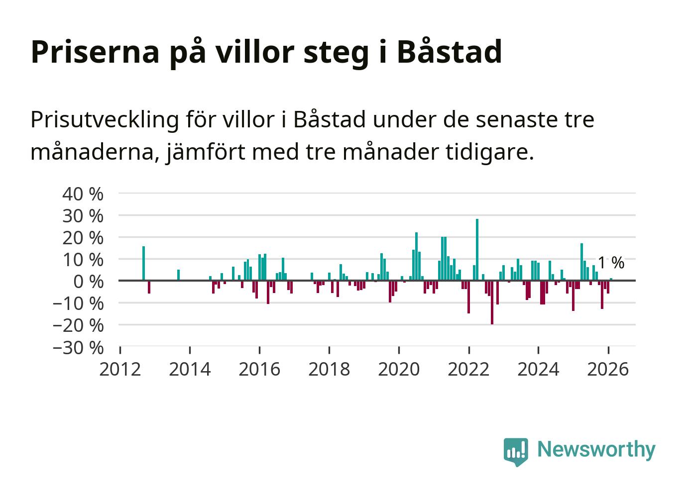 Villapriserna har gått upp i Båstads kommun. Medelpriset på försäljningarna under de senaste tre månaderna visar på en uppgång med 1 procent.