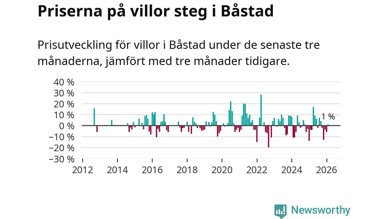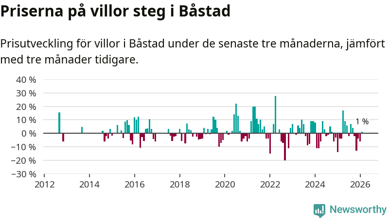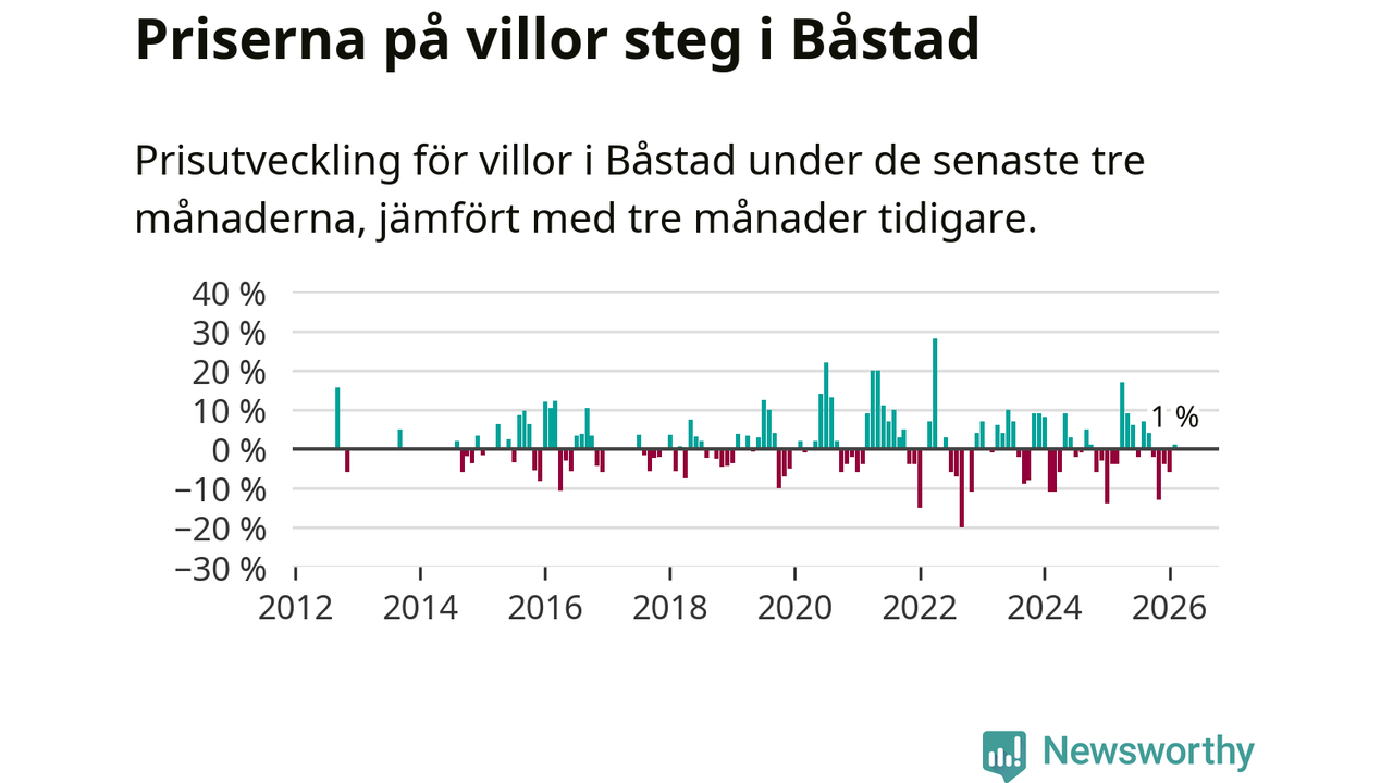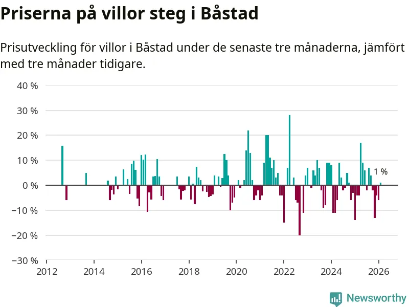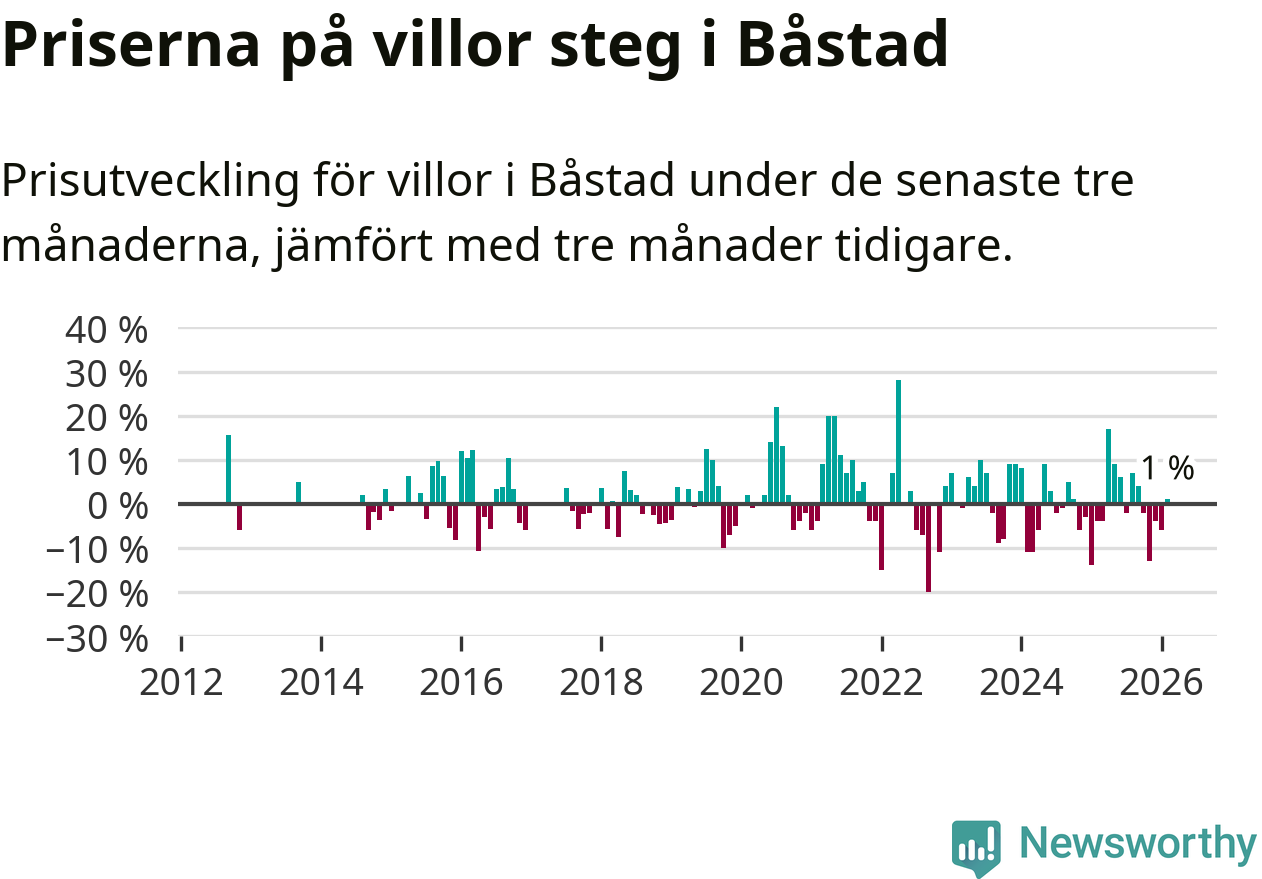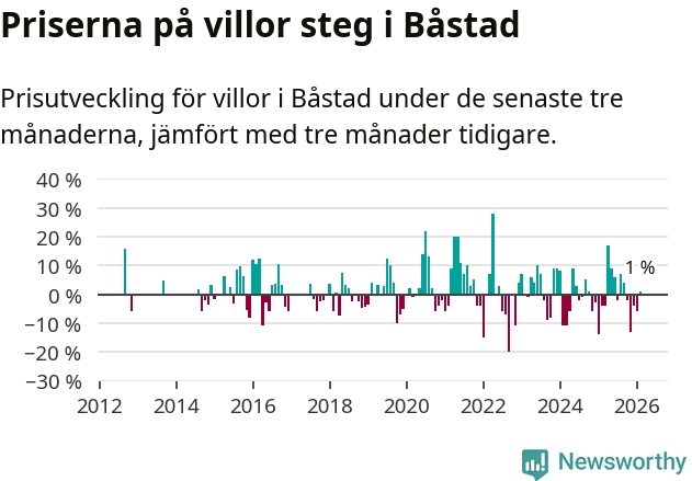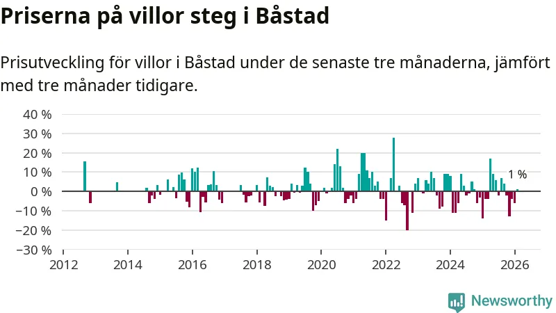 Villapriserna har gått upp i Båstads kommun. Medelpriset på försäljningarna under de senaste tre månaderna visar på en uppgång med 1 procent.