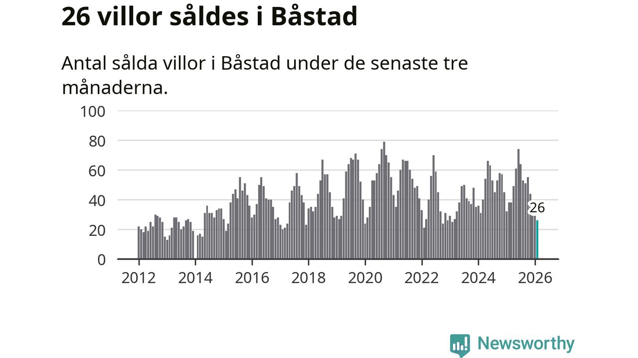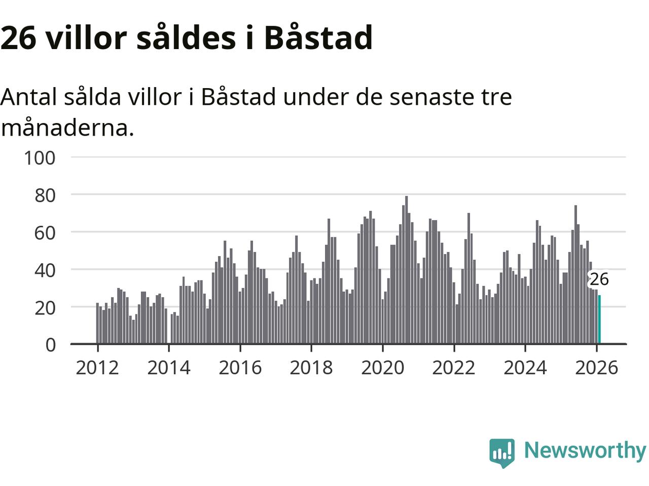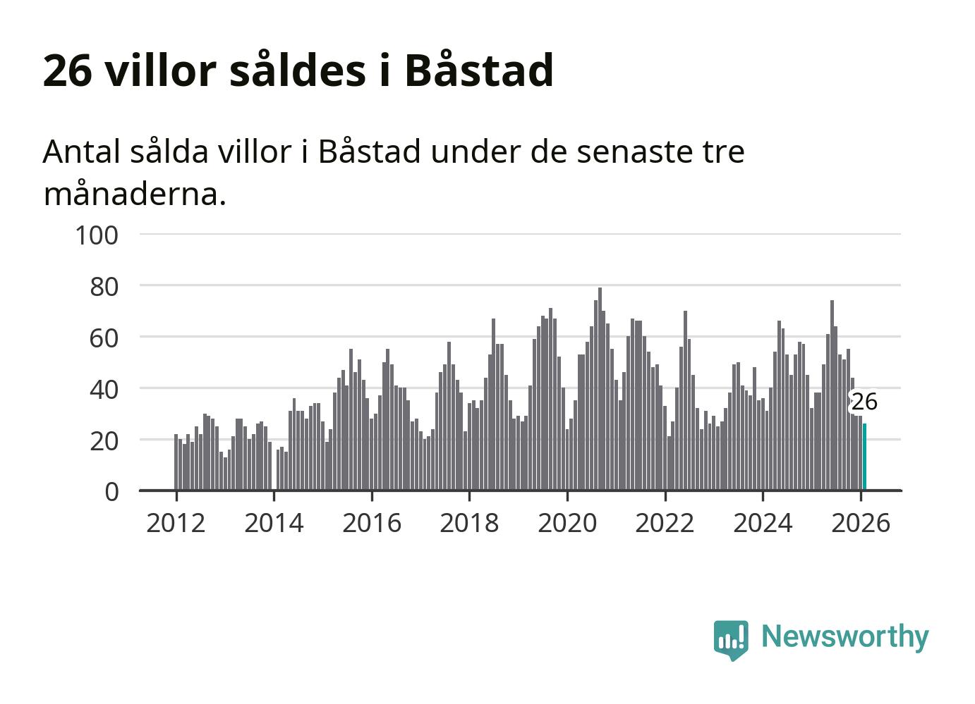 Sammanlagt såldes 26 villor i Båstads kommun mellan december och februari till ett genomsnittligt pris på 4,7 miljoner kronor. I fjol gjordes 38 affärer vid den här tiden på året.