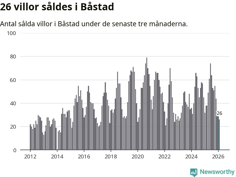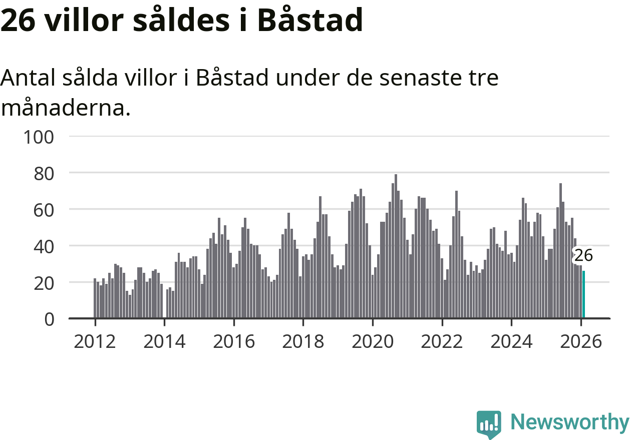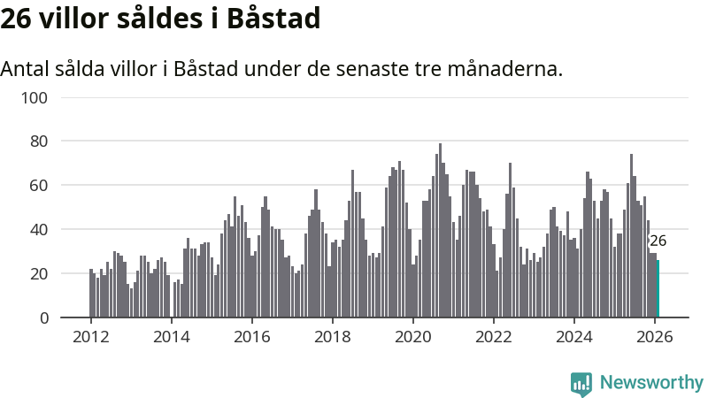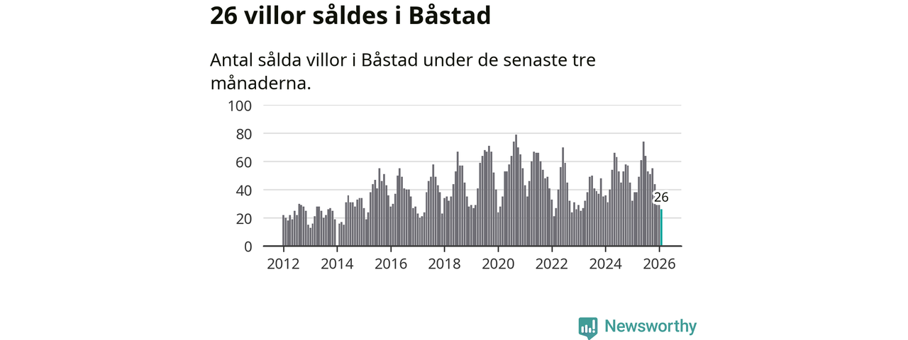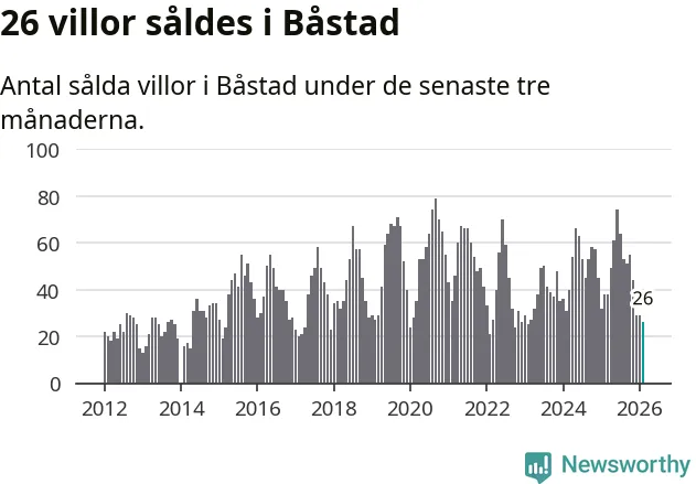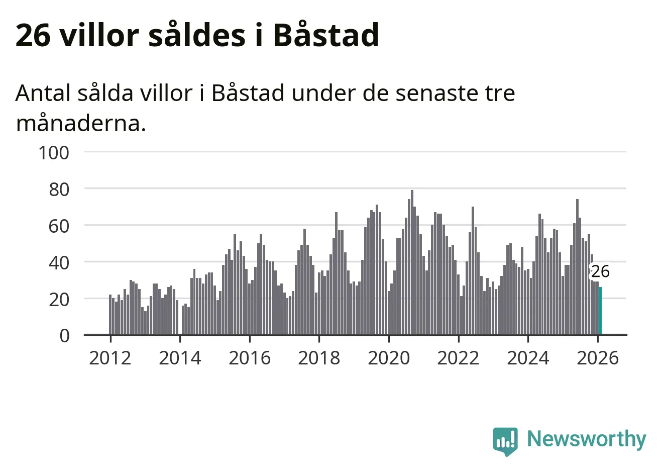 Sammanlagt såldes 26 villor i Båstads kommun mellan december och februari till ett genomsnittligt pris på 4,7 miljoner kronor. I fjol gjordes 38 affärer vid den här tiden på året.