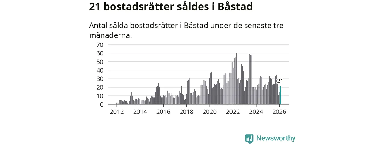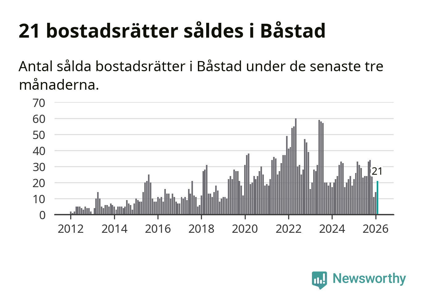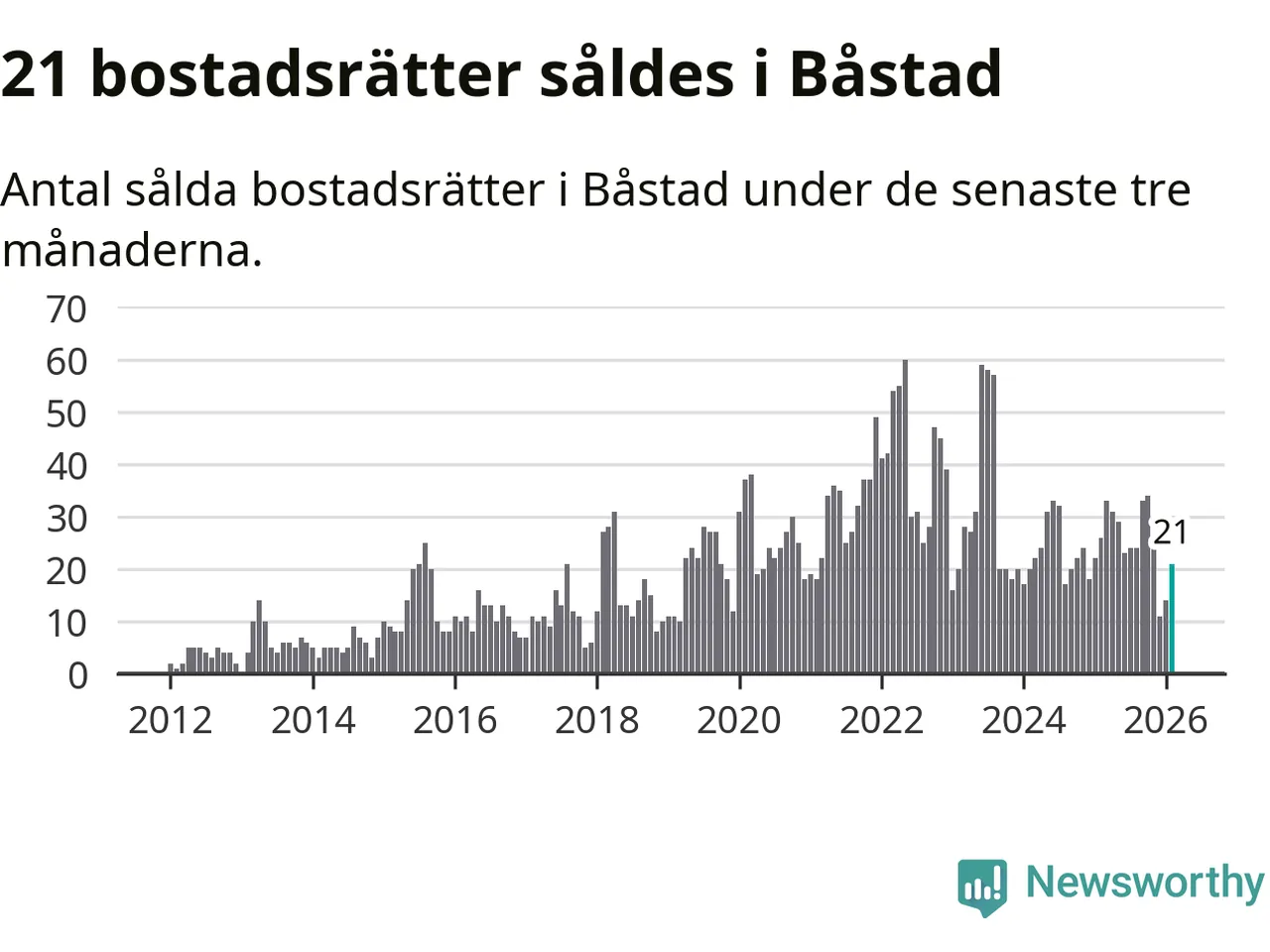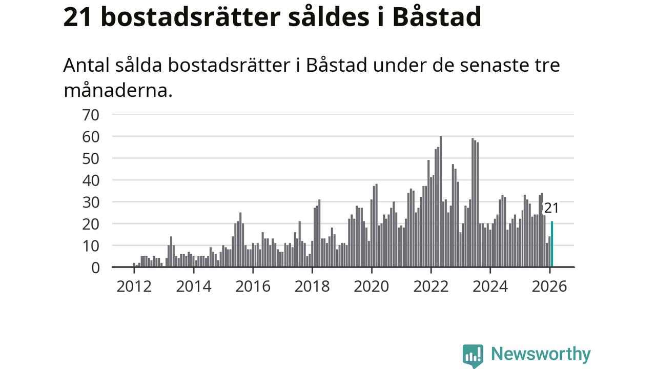 Mellan december och februari gjordes sammanlagt 21 affärer med bostadsrätter i Båstads kommun. Det kan jämföras med 26 vid motsvarande tid i fjol.
