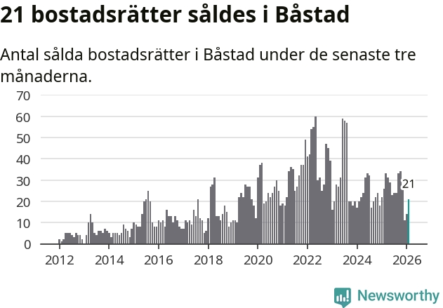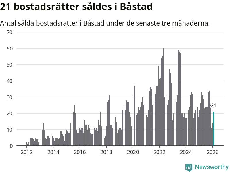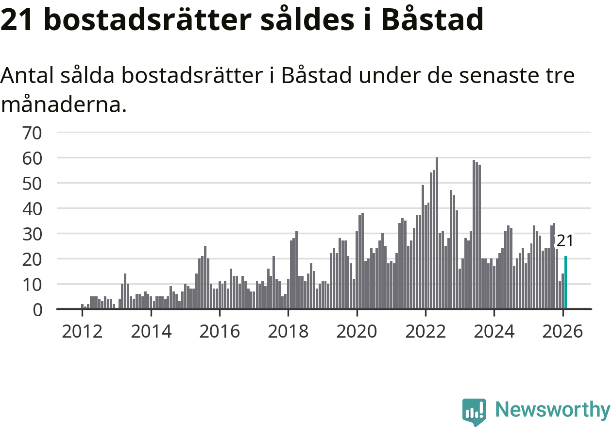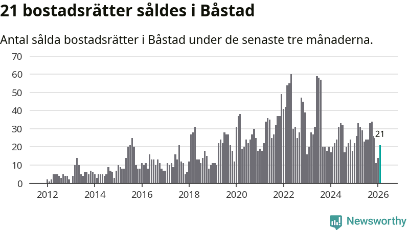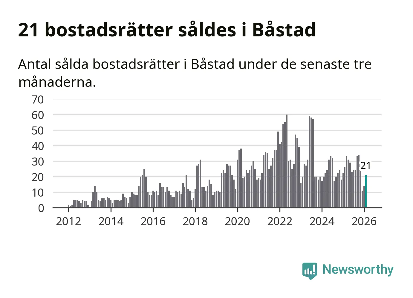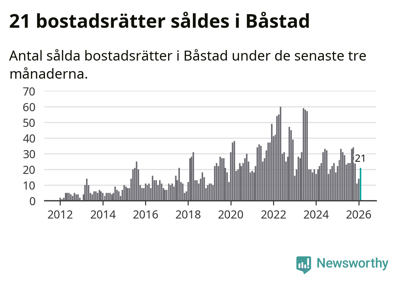 Mellan december och februari gjordes sammanlagt 21 affärer med bostadsrätter i Båstads kommun. Det kan jämföras med 26 vid motsvarande tid i fjol.