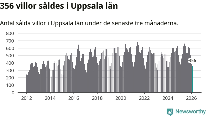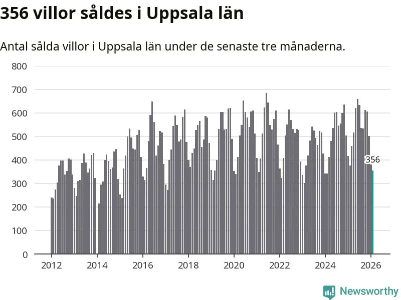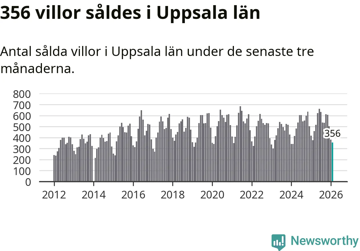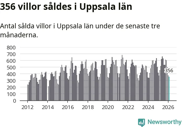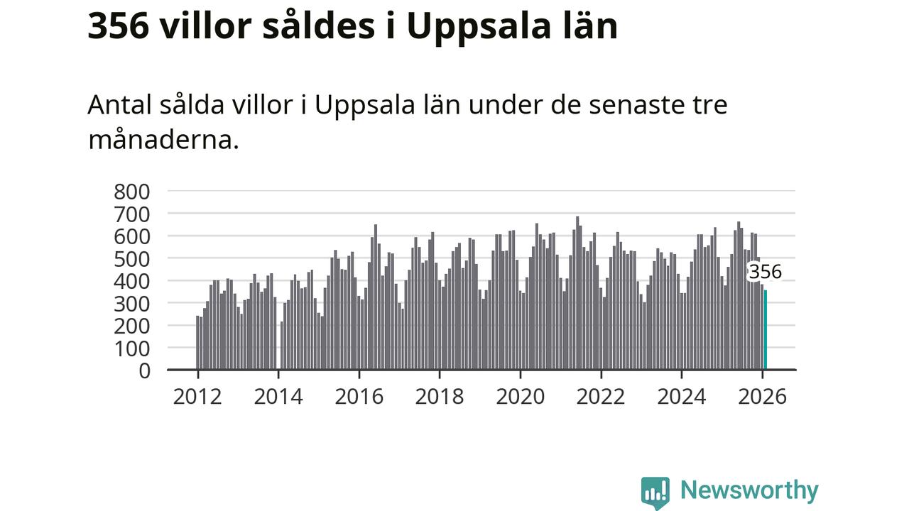 Sammanlagt såldes 356 villor i Uppsala län mellan december och februari till ett genomsnittligt pris på 4,3 miljoner kronor. I fjol gjordes 377 affärer vid den här tiden på året.
