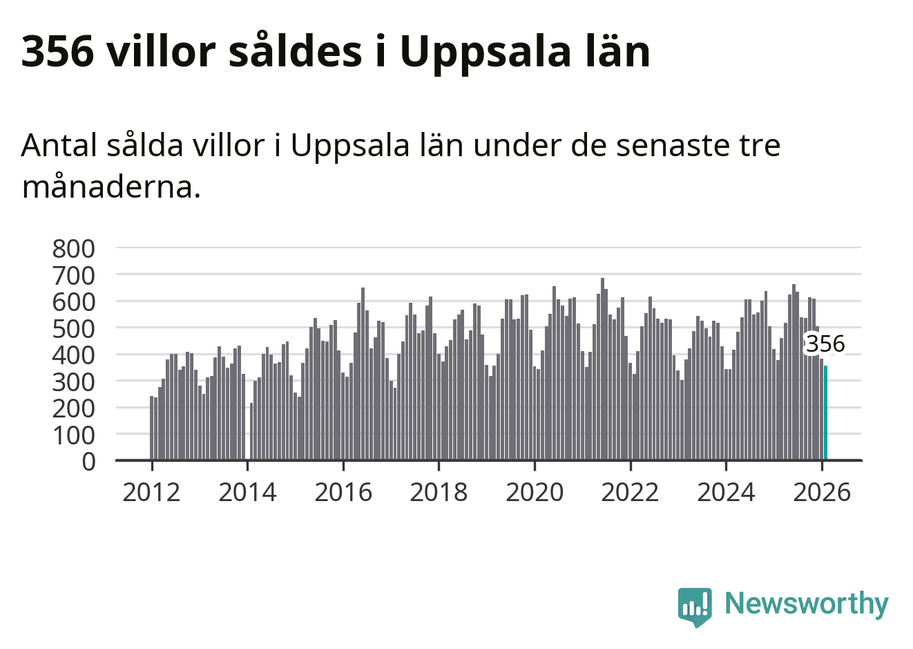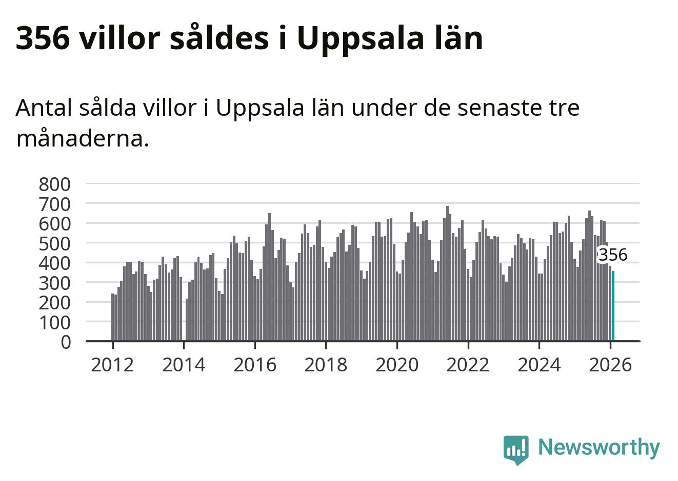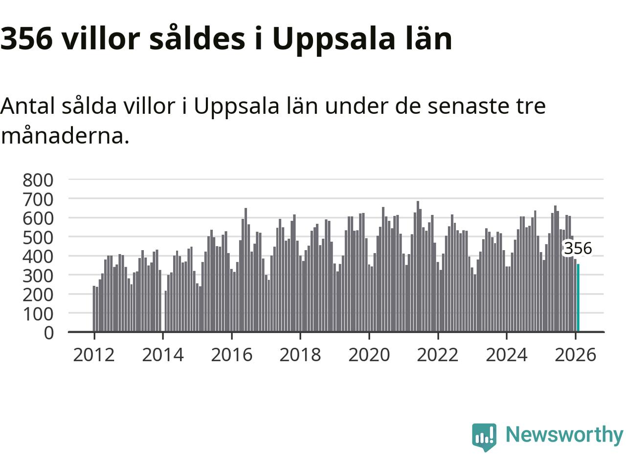 Sammanlagt såldes 356 villor i Uppsala län mellan december och februari till ett genomsnittligt pris på 4,3 miljoner kronor. I fjol gjordes 377 affärer vid den här tiden på året.