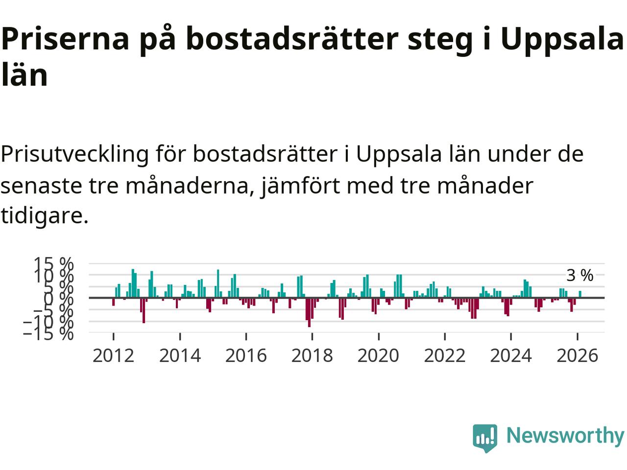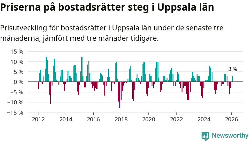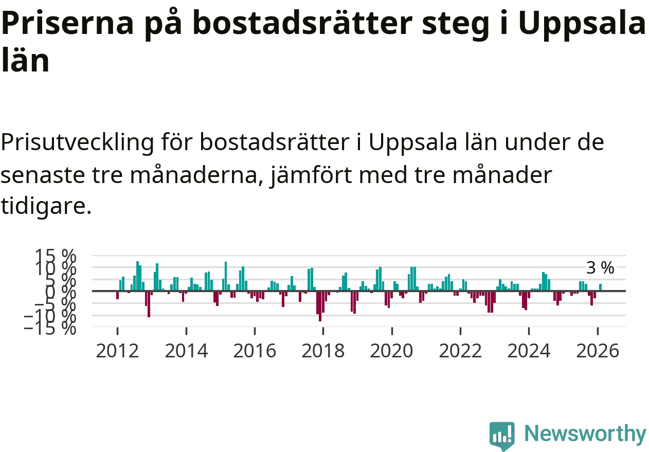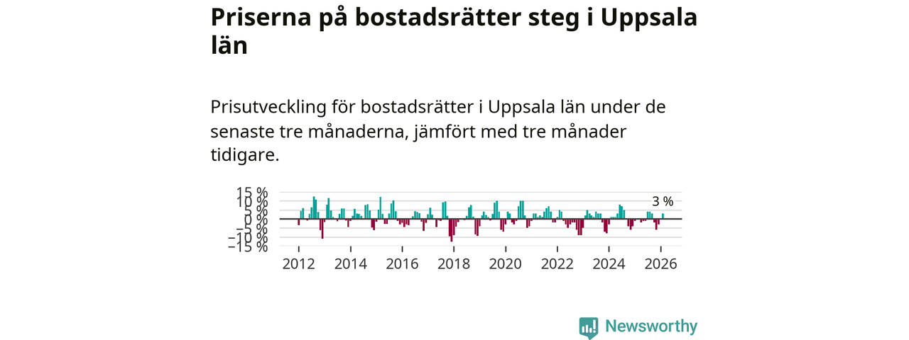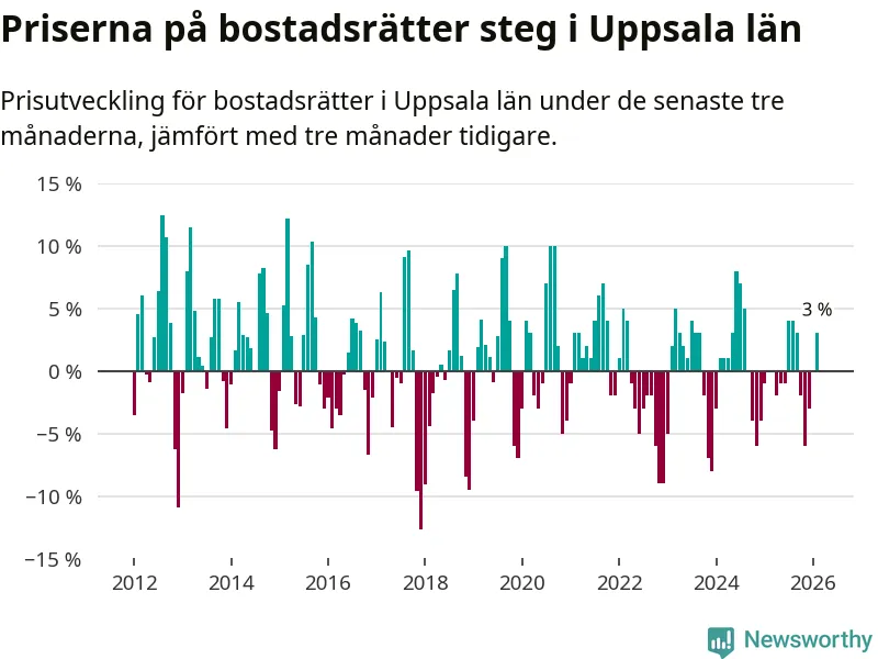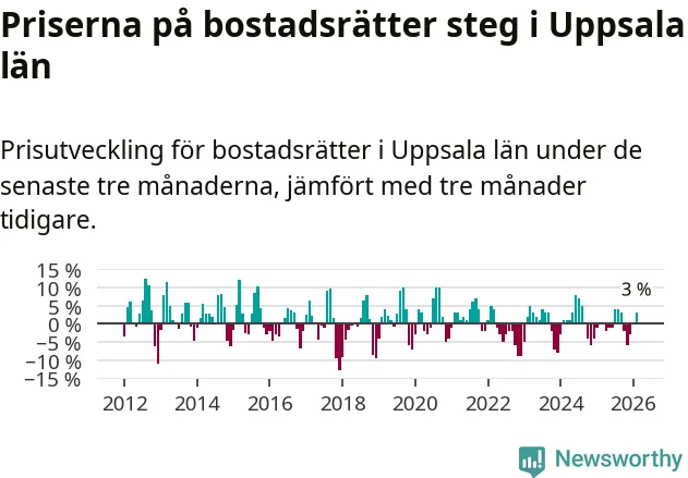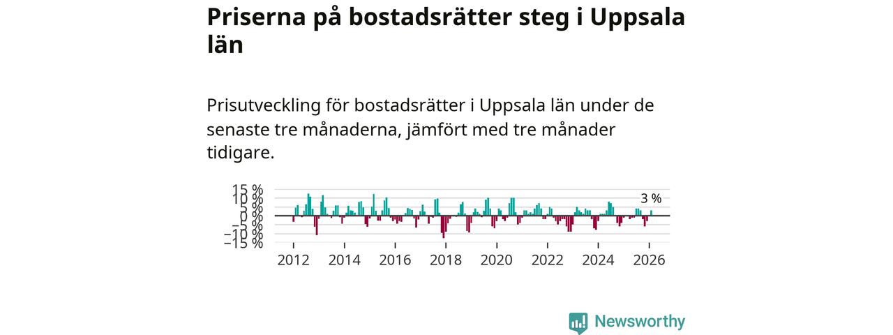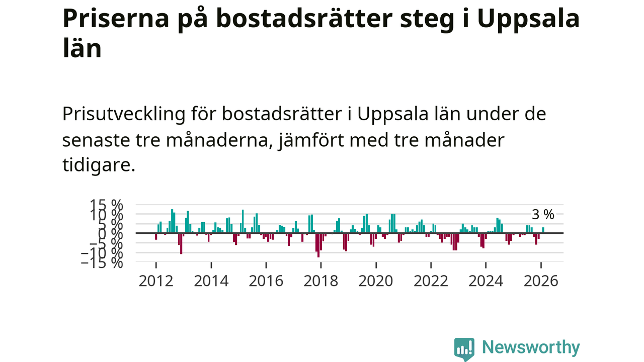 Priserna på bostadsrätter har gått upp i Uppsala län. Medelpriset på försäljningarna under de senaste tre månaderna visar på en uppgång med 3 procent.