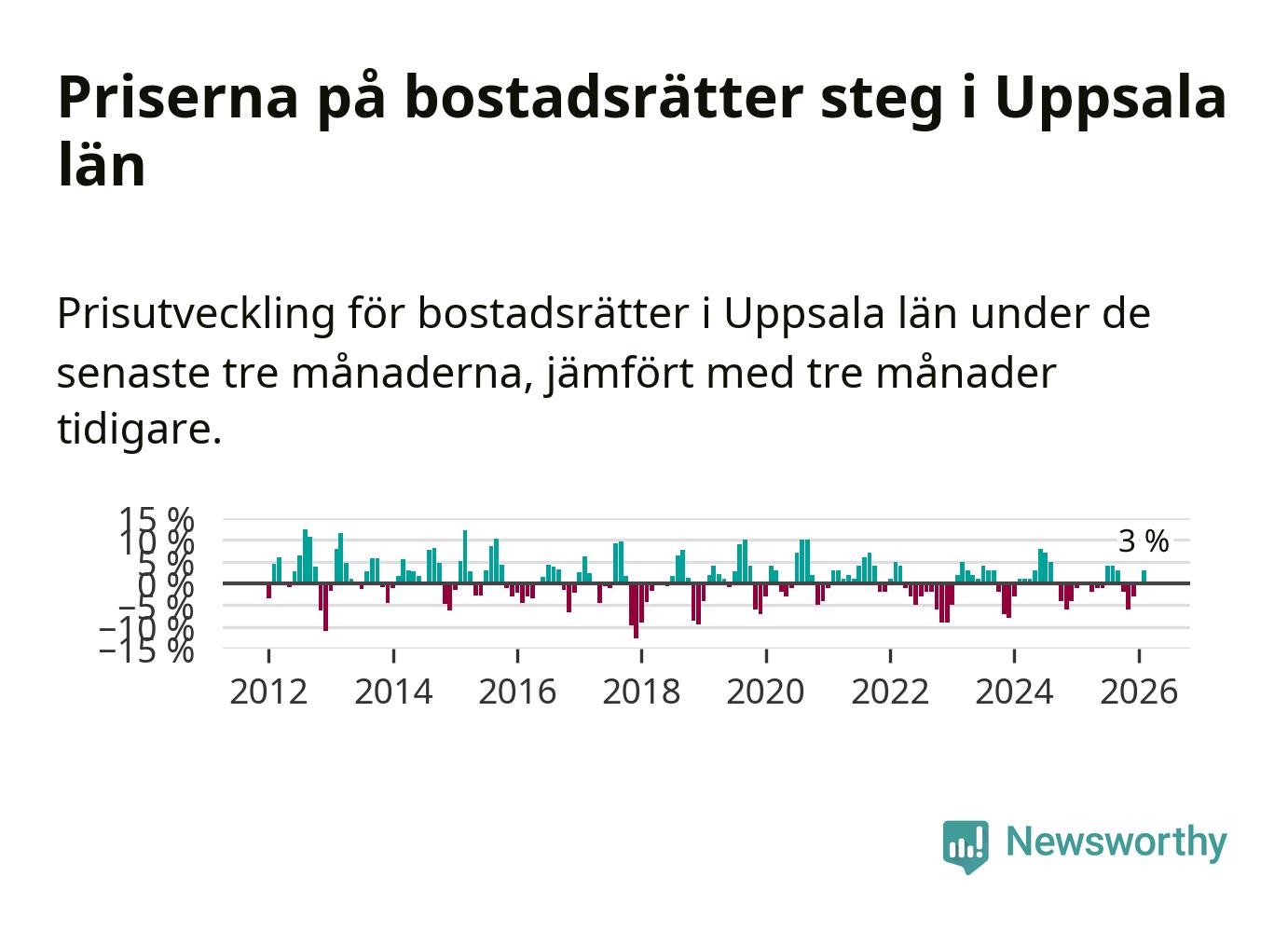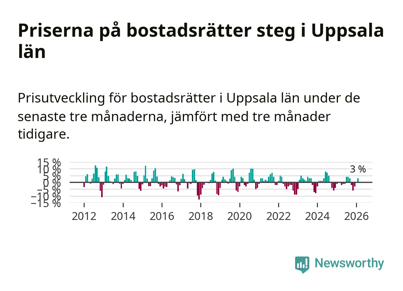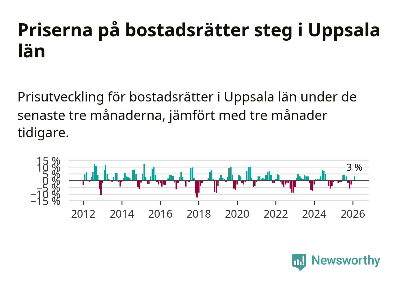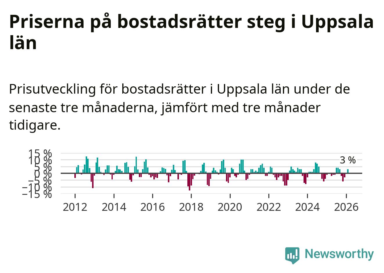 Priserna på bostadsrätter har gått upp i Uppsala län. Medelpriset på försäljningarna under de senaste tre månaderna visar på en uppgång med 3 procent.
