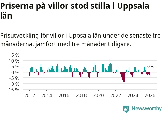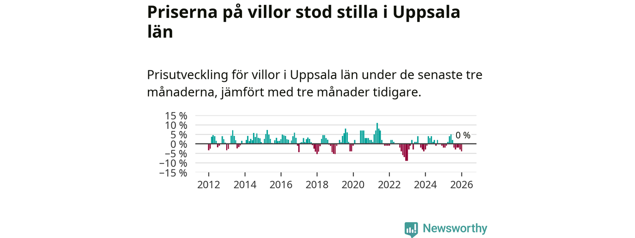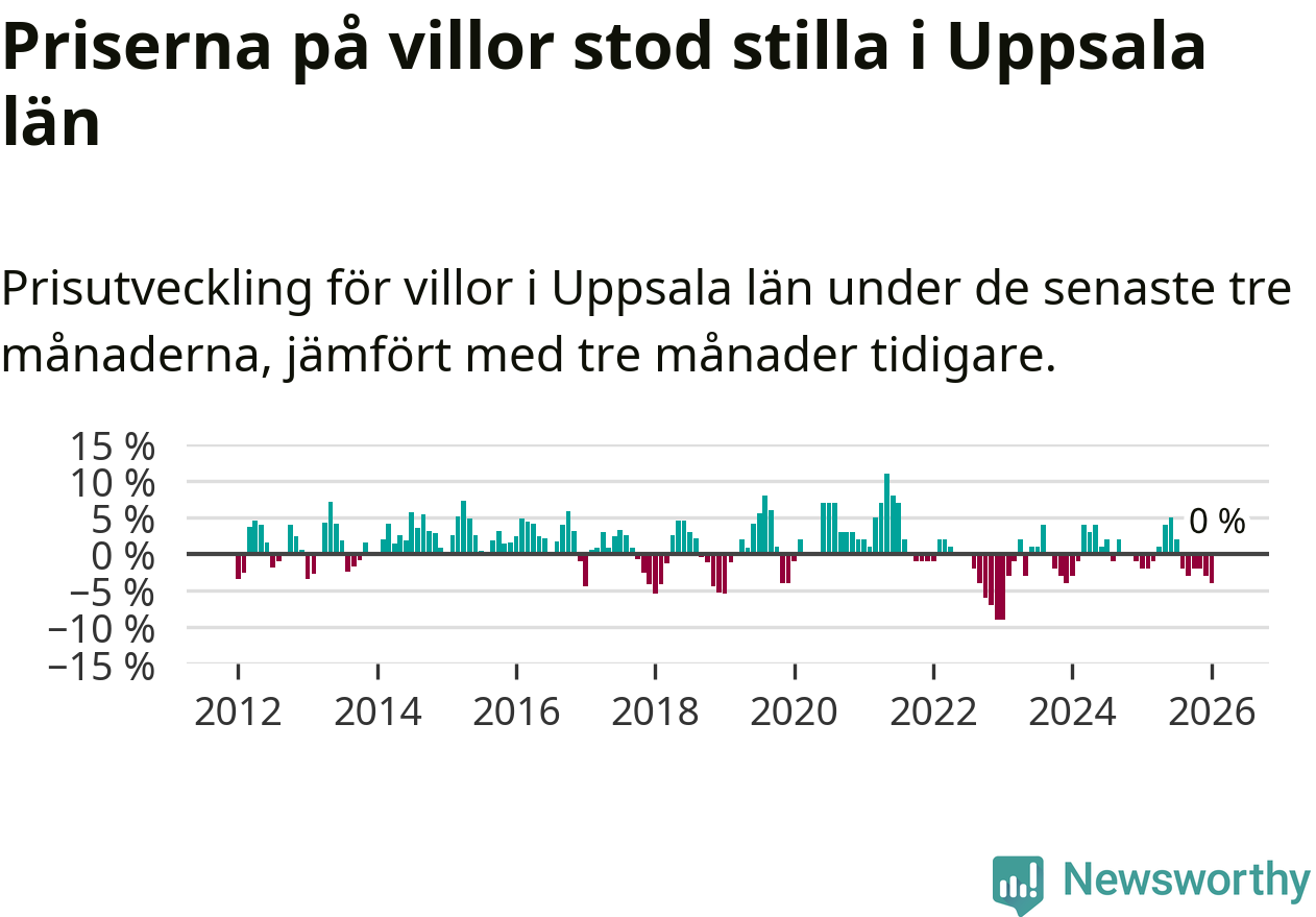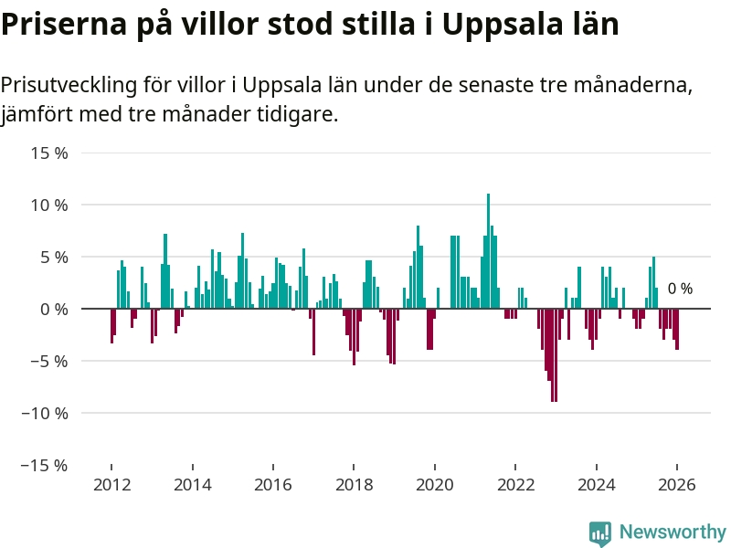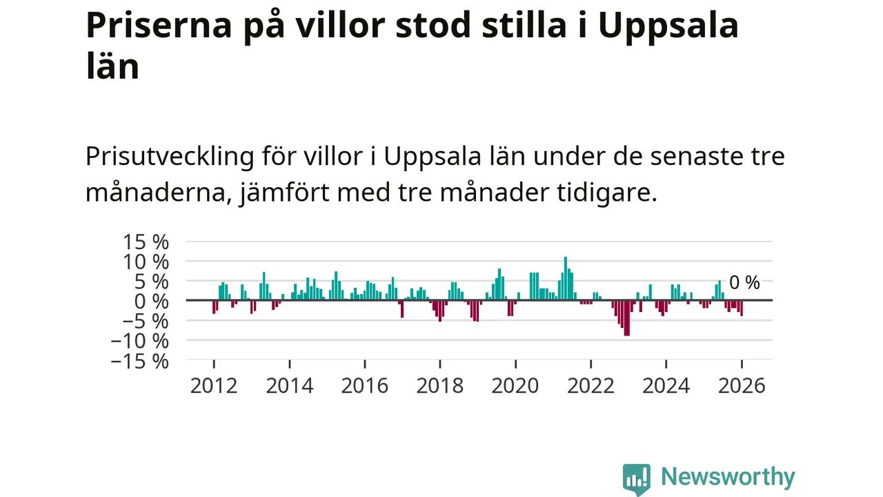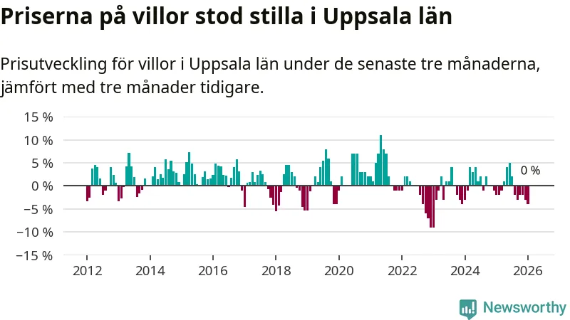 Villapriserna står i stort sett stilla i Uppsala län. Medelpriset på de på försäljningarna under de senaste tre månaderna låg på samma nivå som för tre månader sedan.