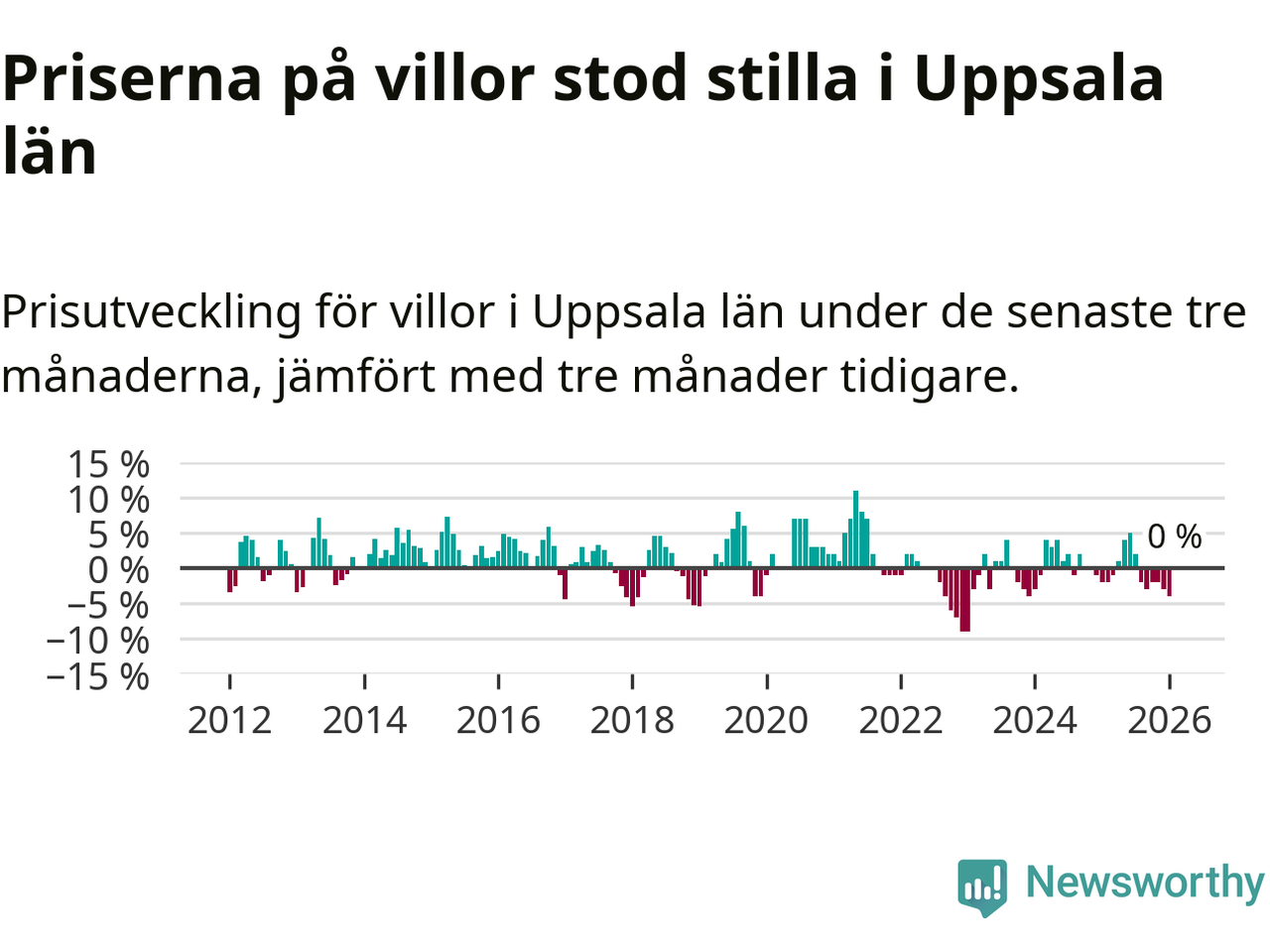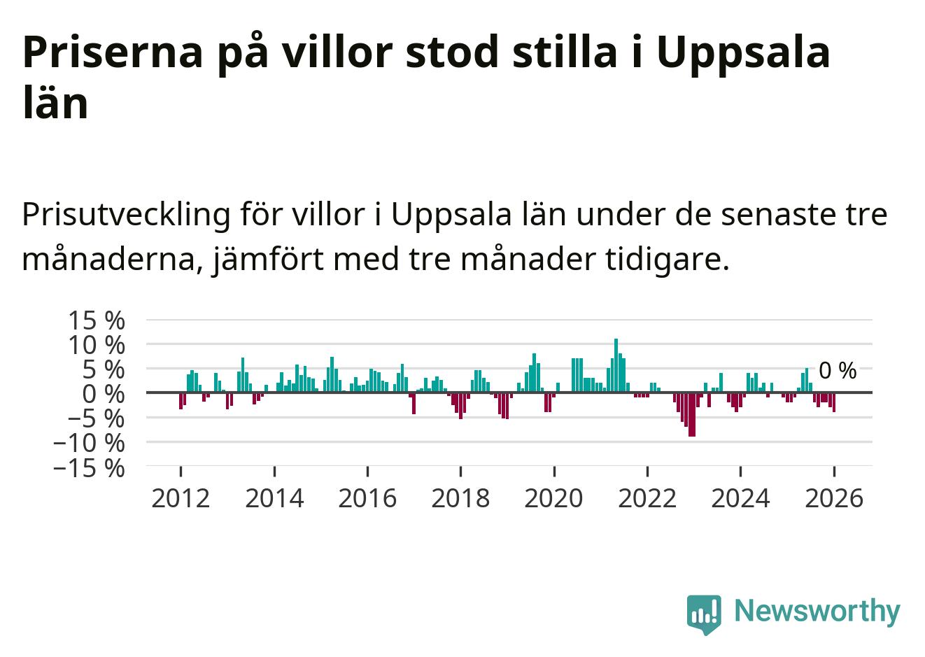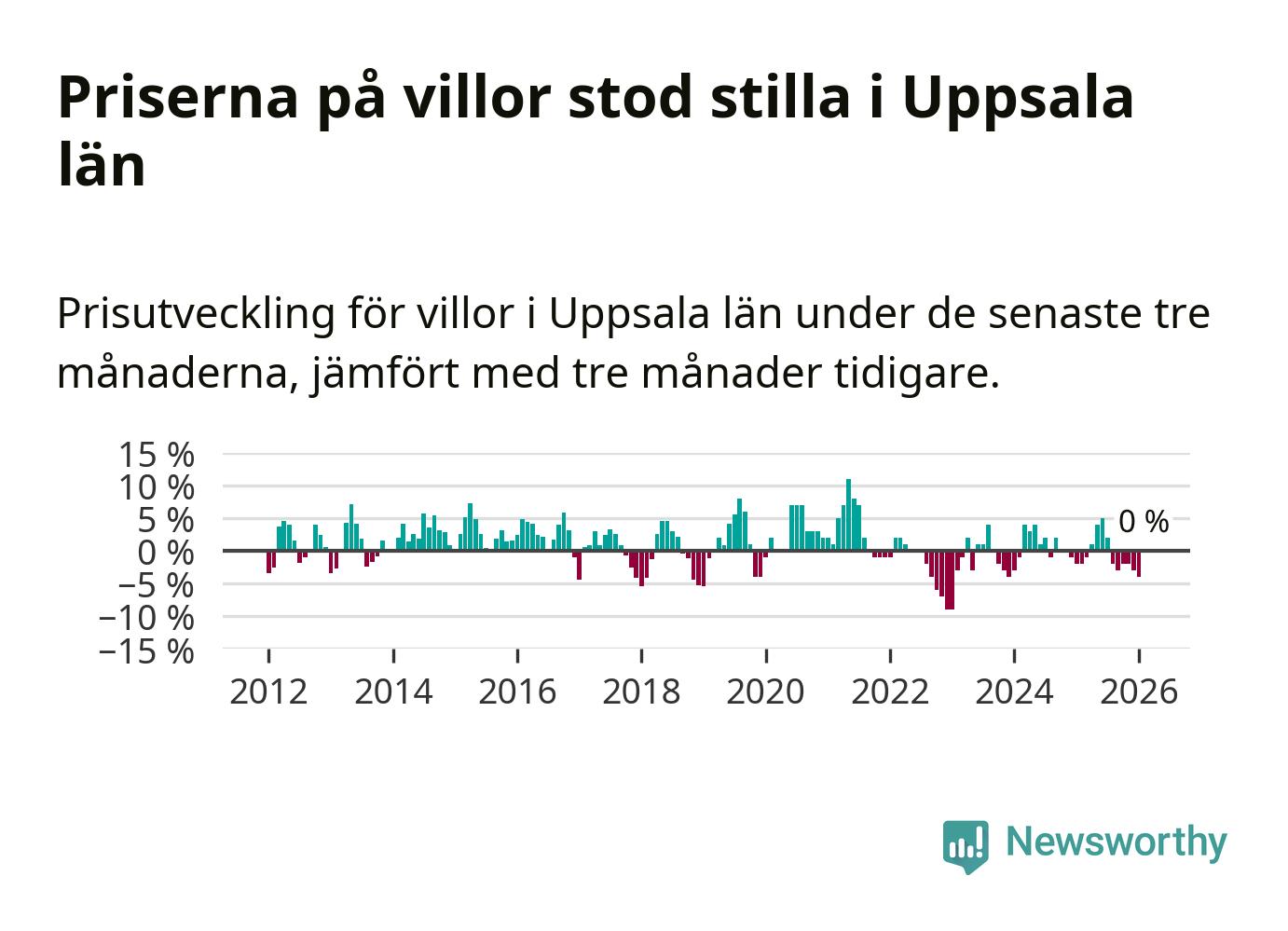 Villapriserna står i stort sett stilla i Uppsala län. Medelpriset på de på försäljningarna under de senaste tre månaderna låg på samma nivå som för tre månader sedan.