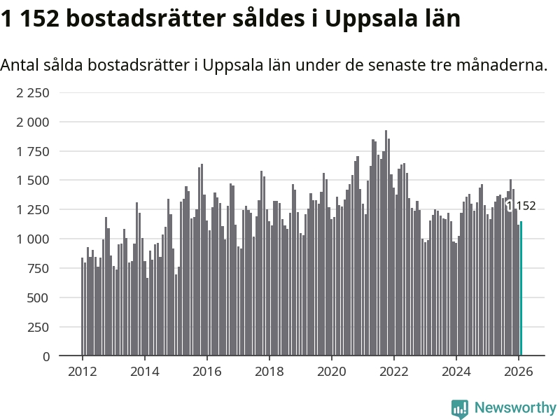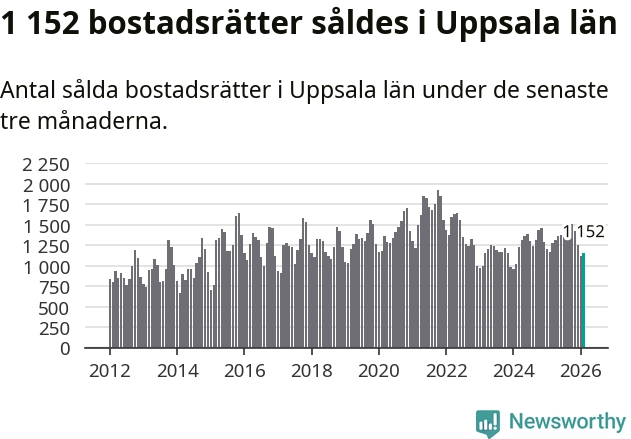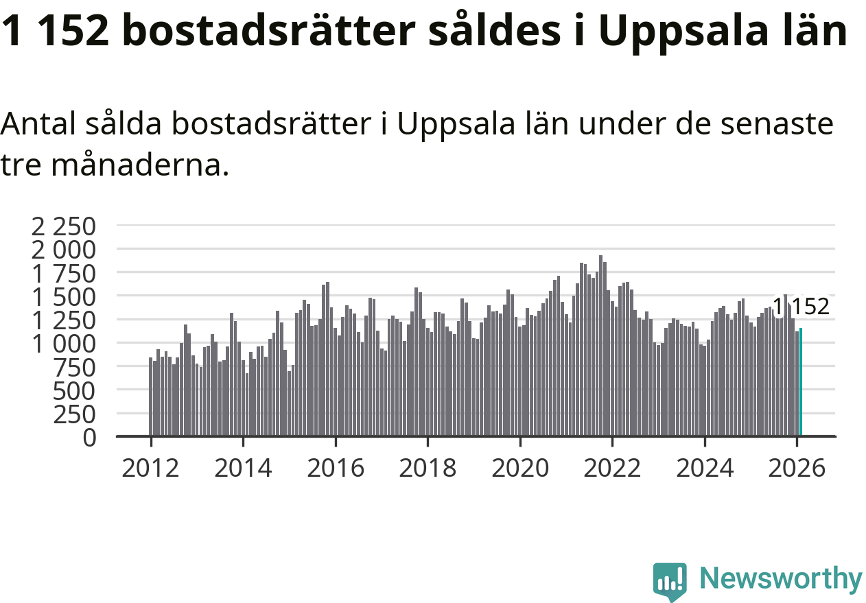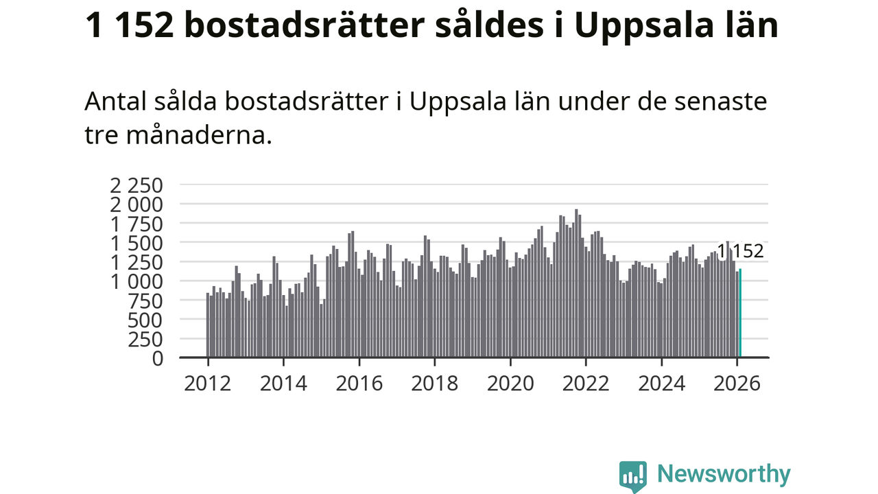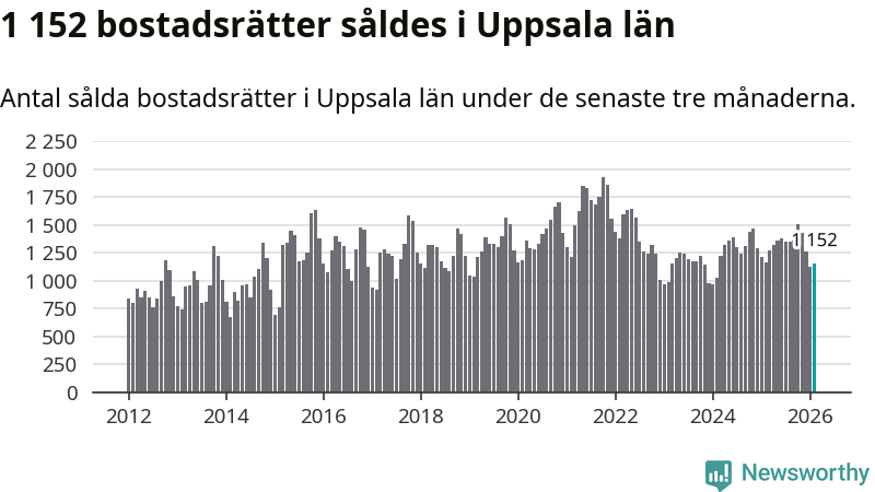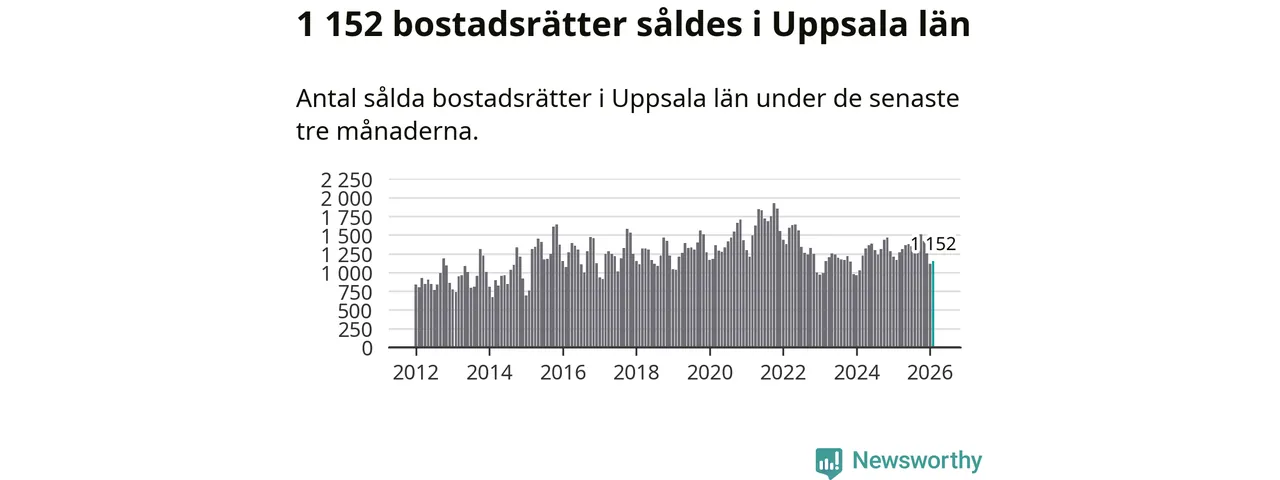Sammanlagt såldes 1 152 bostadsrätter i Uppsala län mellan december och februari till ett genomsnittligt pris på 2,4 miljoner kronor. I fjol gjordes 1 167 affärer vid den här tiden på året.