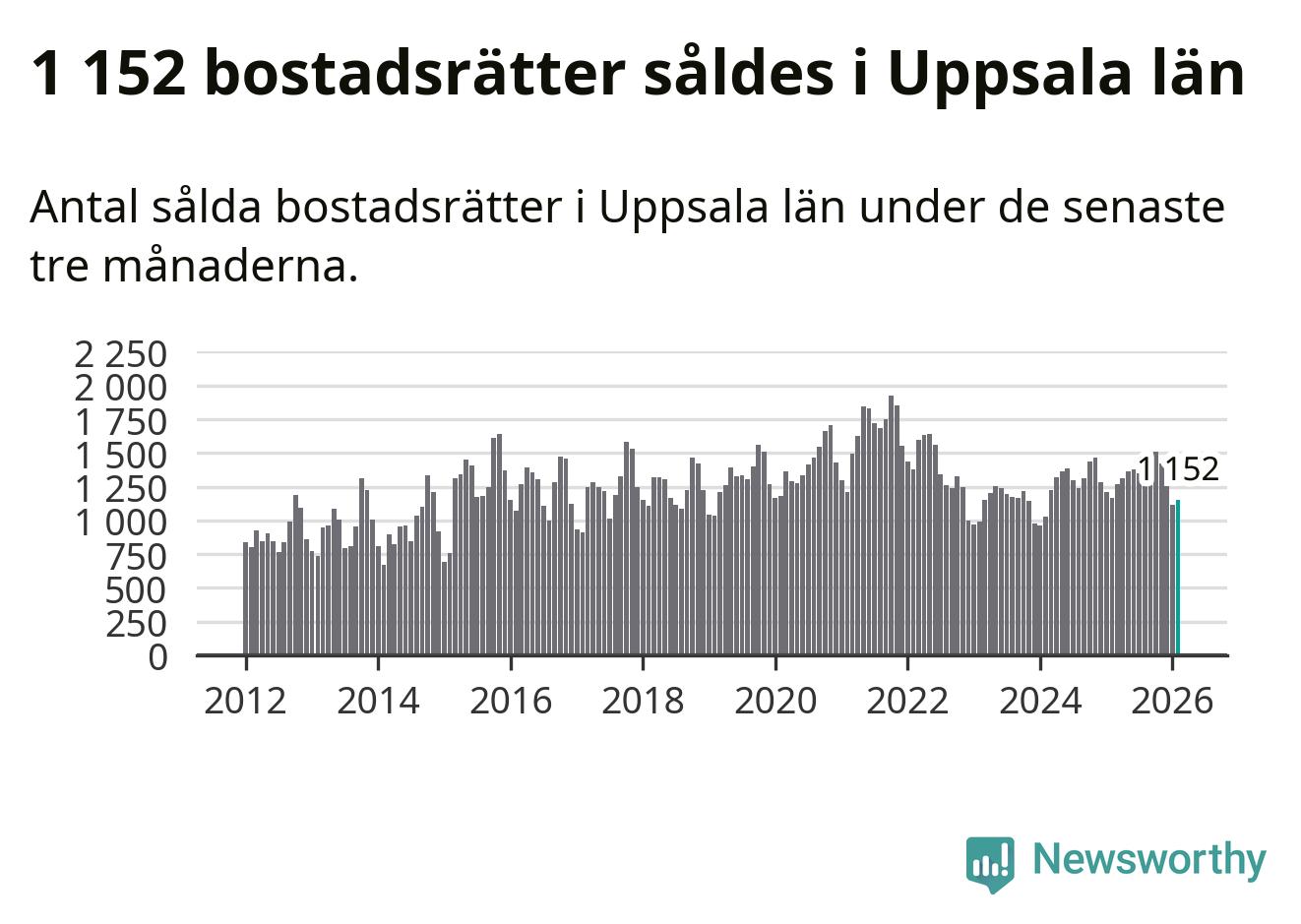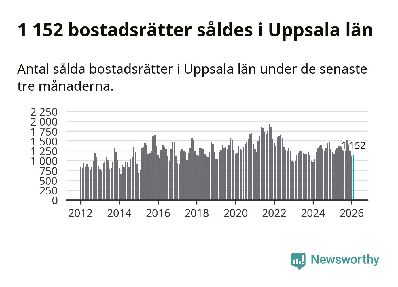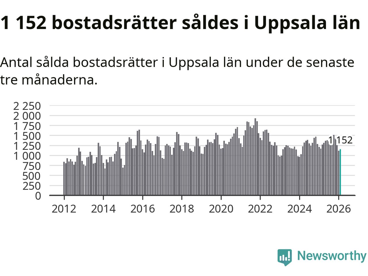 Sammanlagt såldes 1 152 bostadsrätter i Uppsala län mellan december och februari till ett genomsnittligt pris på 2,4 miljoner kronor. I fjol gjordes 1 167 affärer vid den här tiden på året.