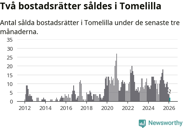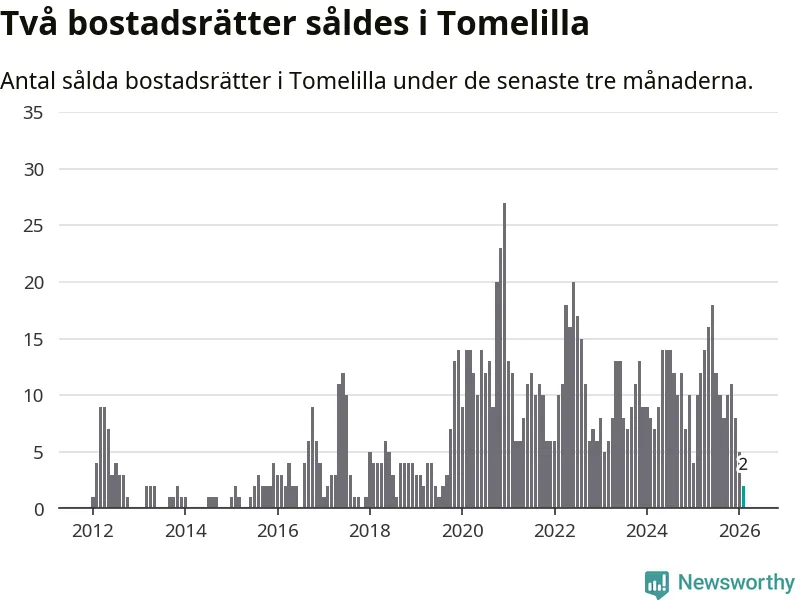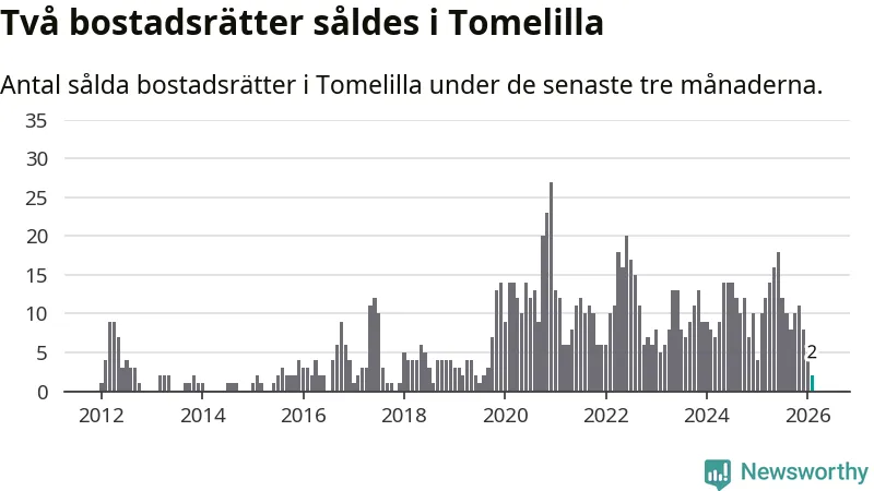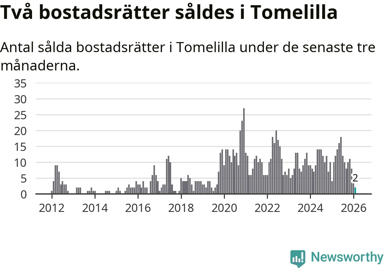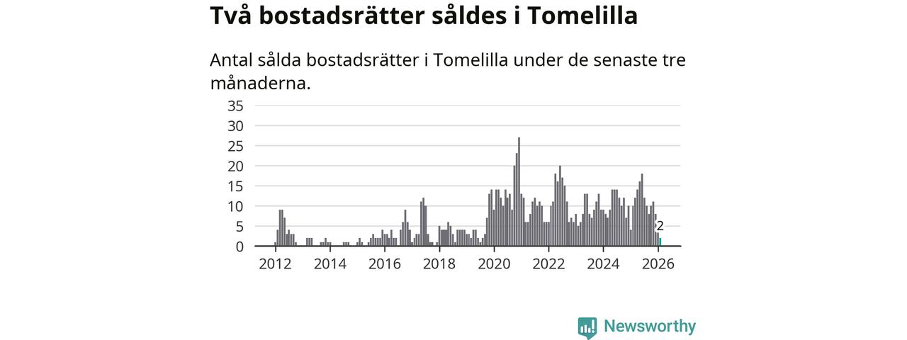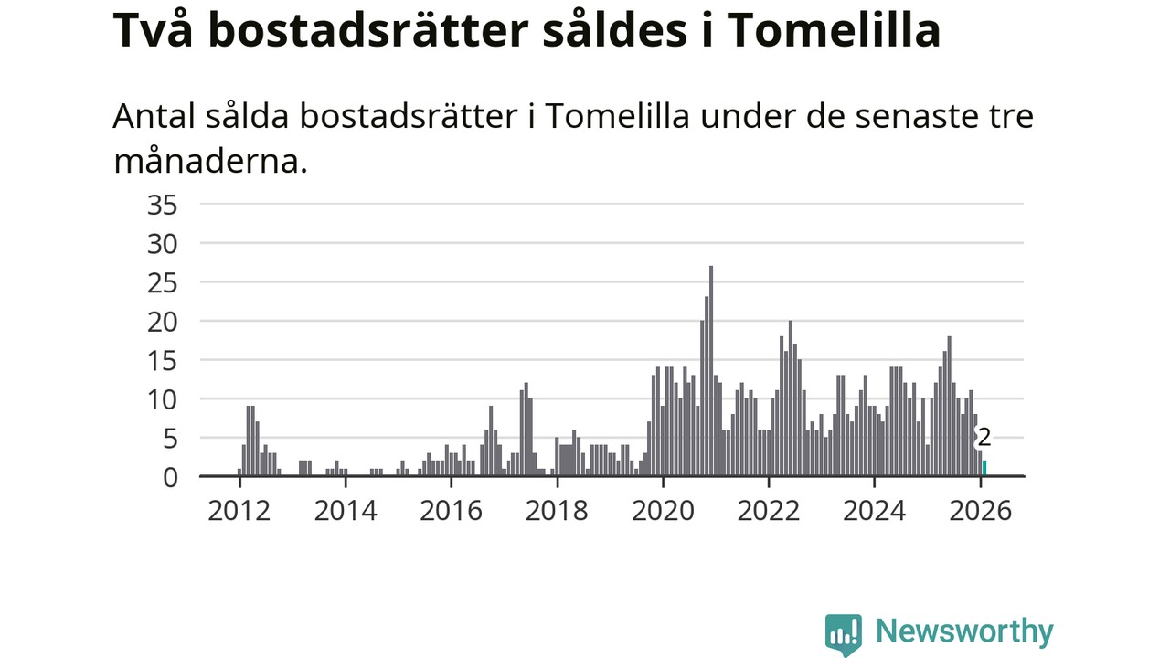 Mellan december och februari gjordes sammanlagt två affärer med bostadsrätter i Tomelilla kommun. Det kan jämföras med tio vid motsvarande tid i fjol.