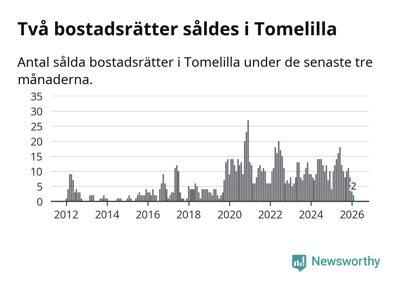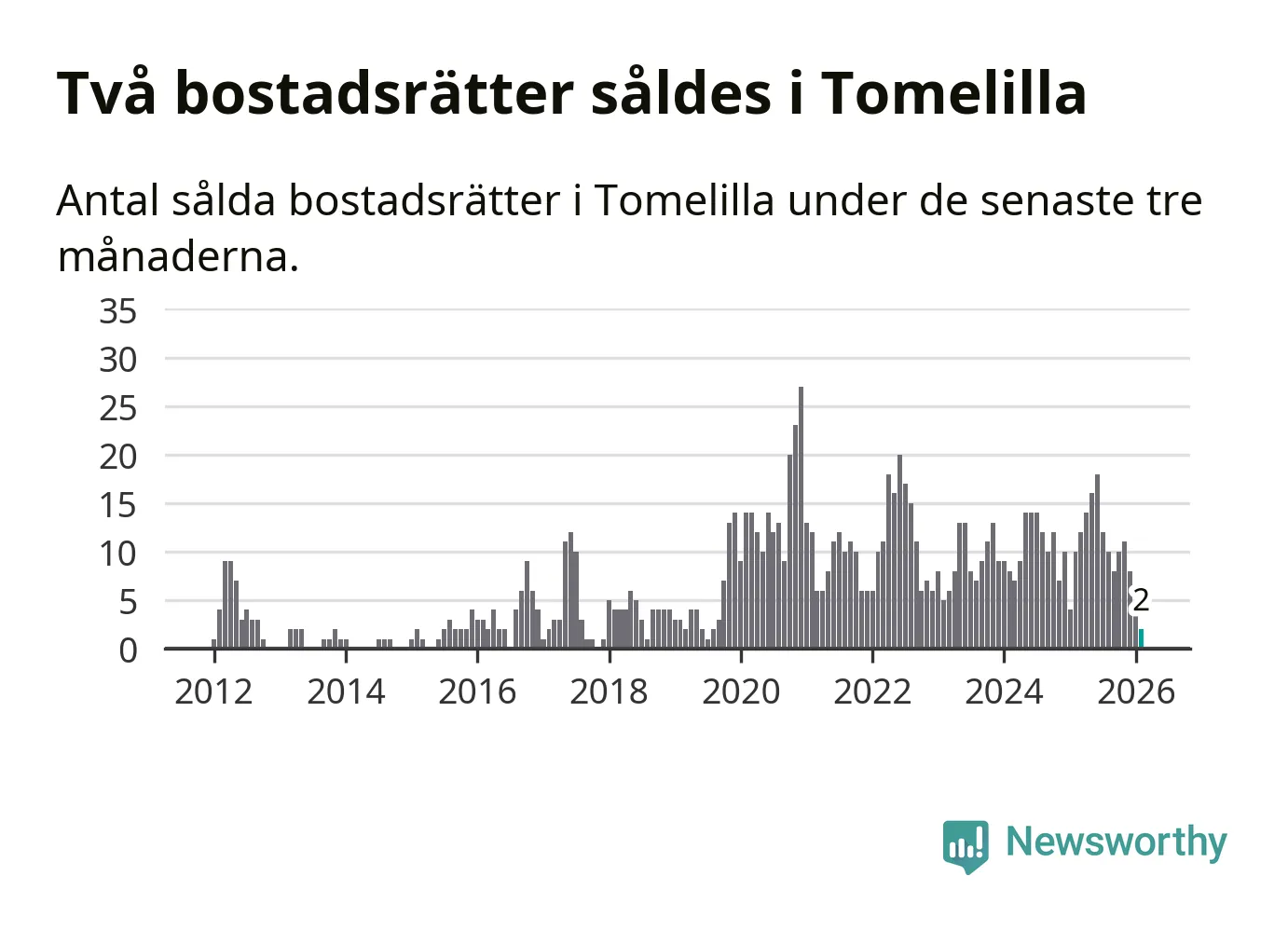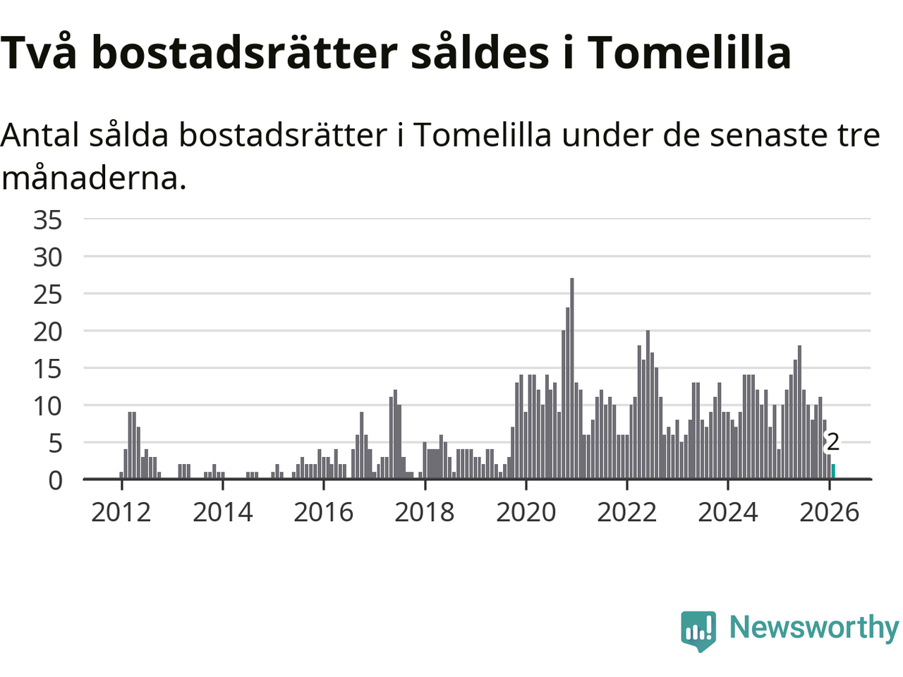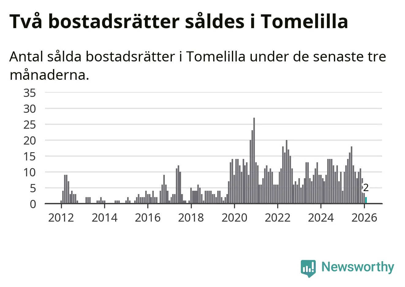 Mellan december och februari gjordes sammanlagt två affärer med bostadsrätter i Tomelilla kommun. Det kan jämföras med tio vid motsvarande tid i fjol.