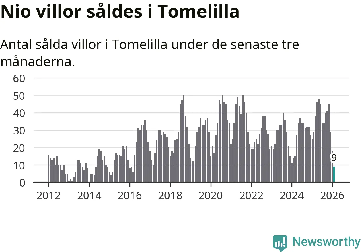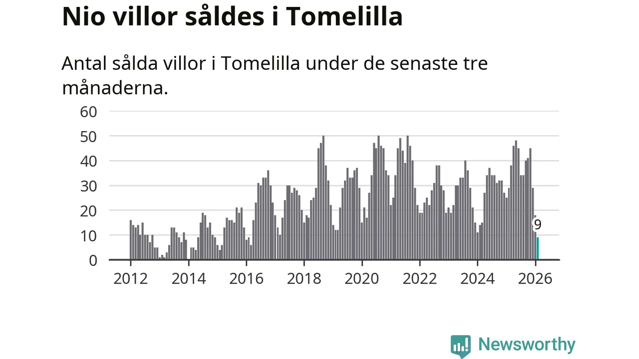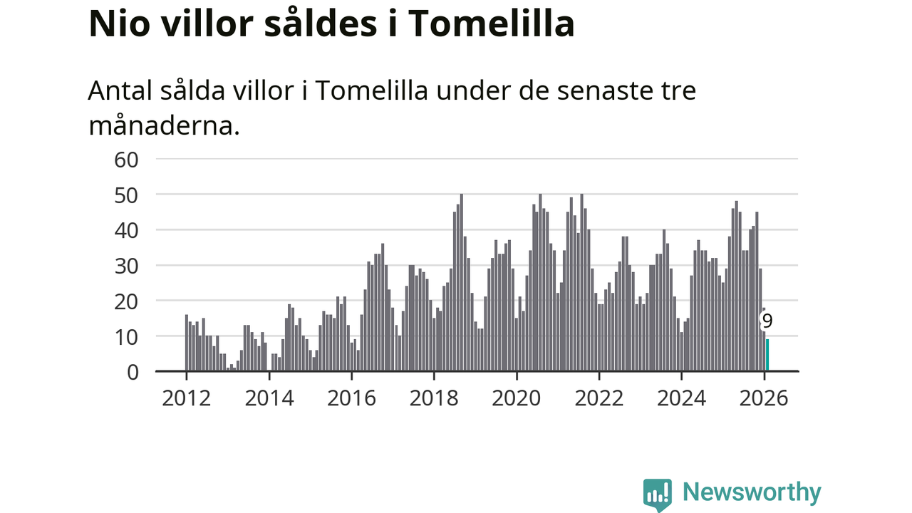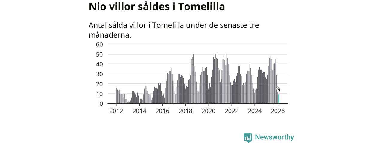 Mellan december och februari gjordes sammanlagt nio affärer med villor i Tomelilla kommun. Det kan jämföras med 29 vid motsvarande tid i fjol.
