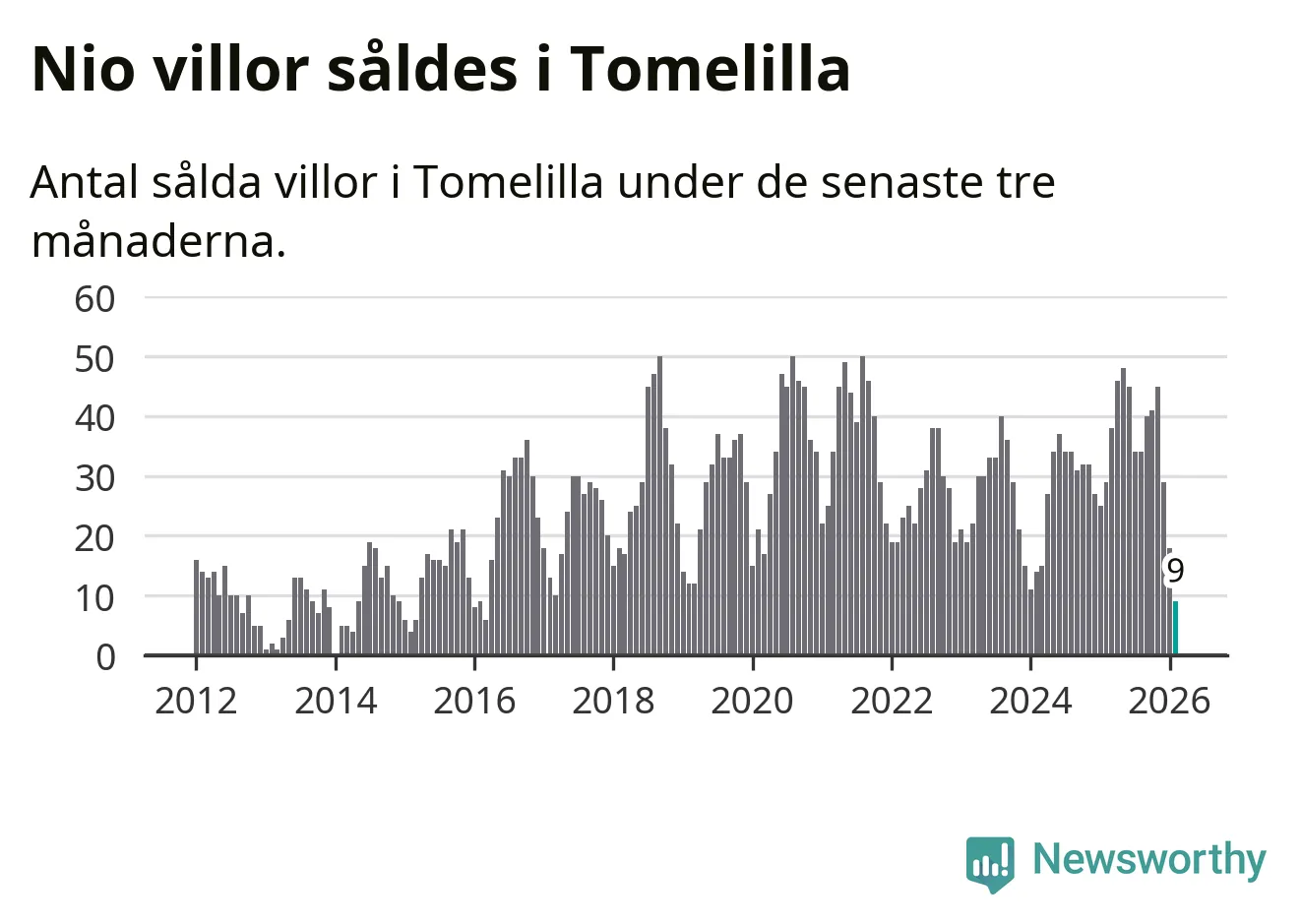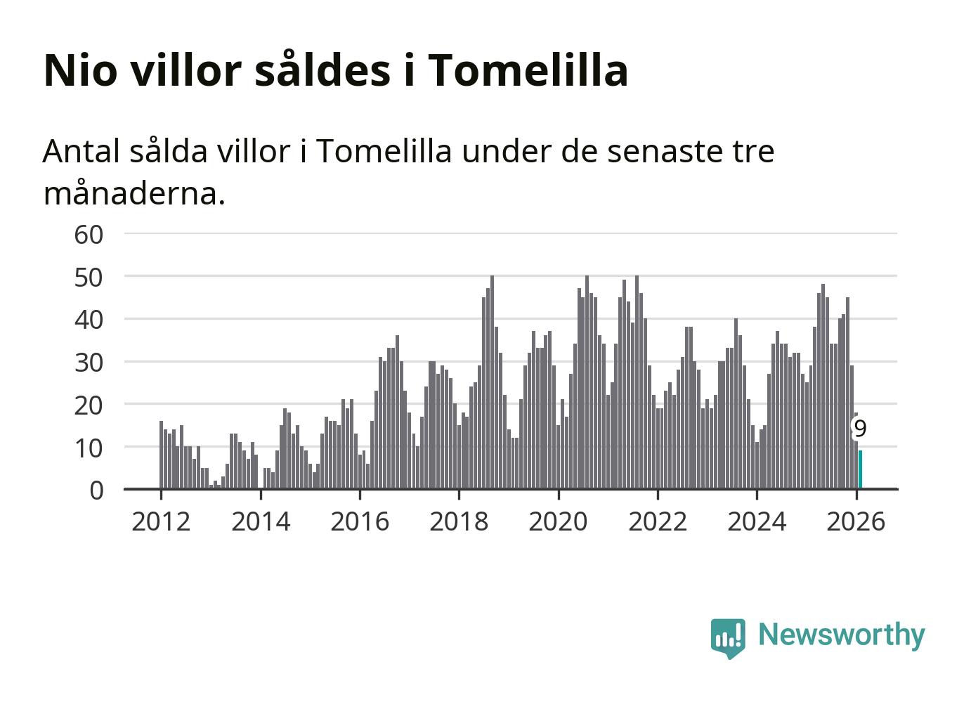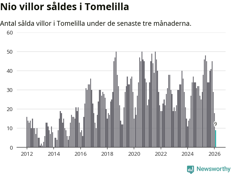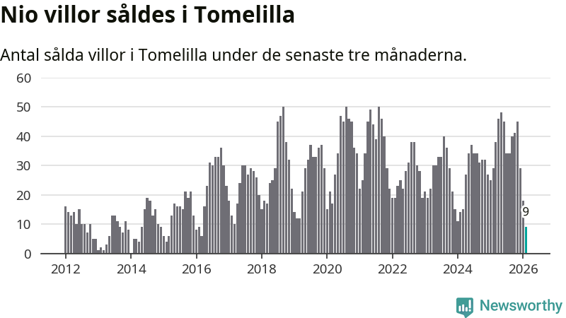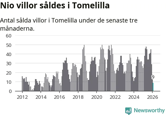 Mellan december och februari gjordes sammanlagt nio affärer med villor i Tomelilla kommun. Det kan jämföras med 29 vid motsvarande tid i fjol.