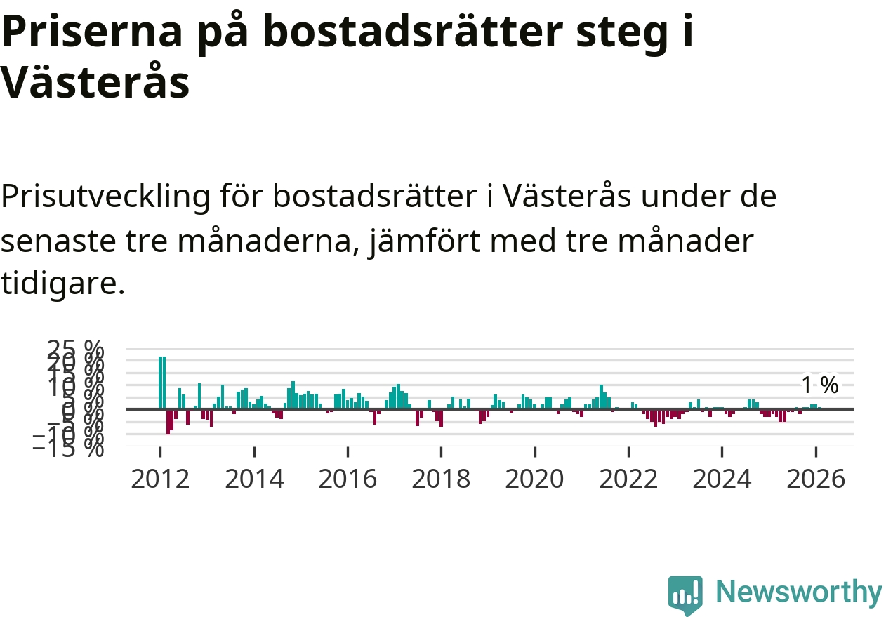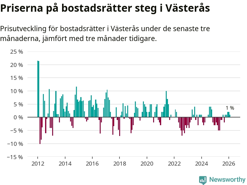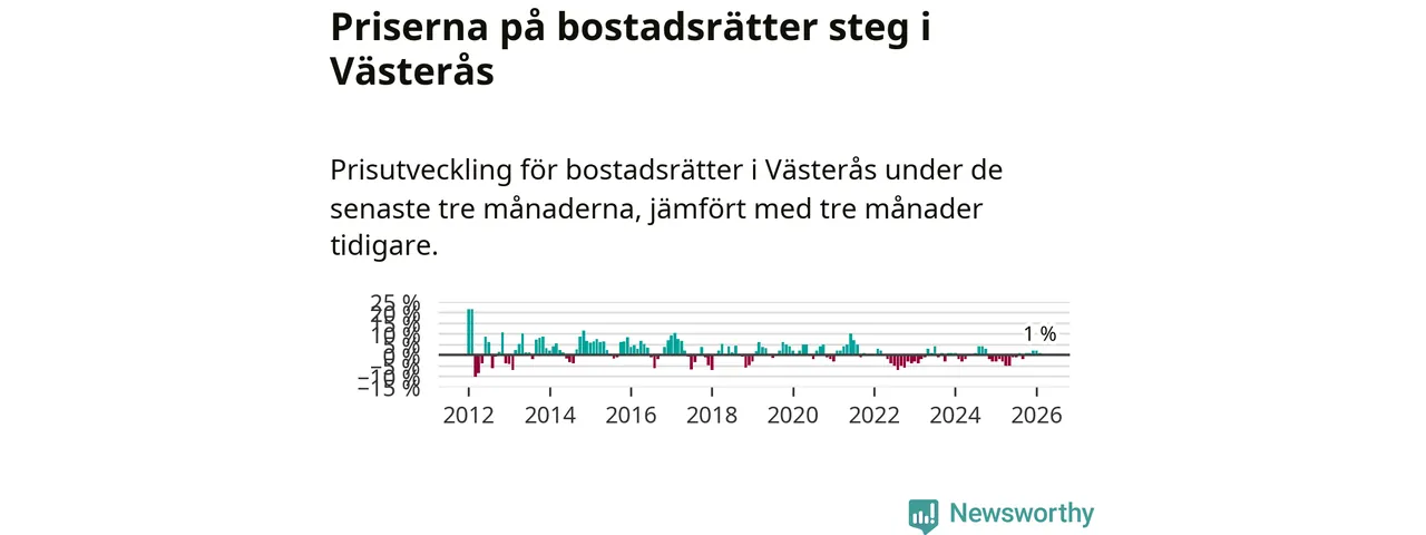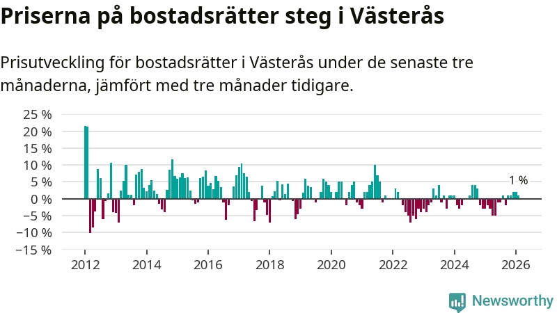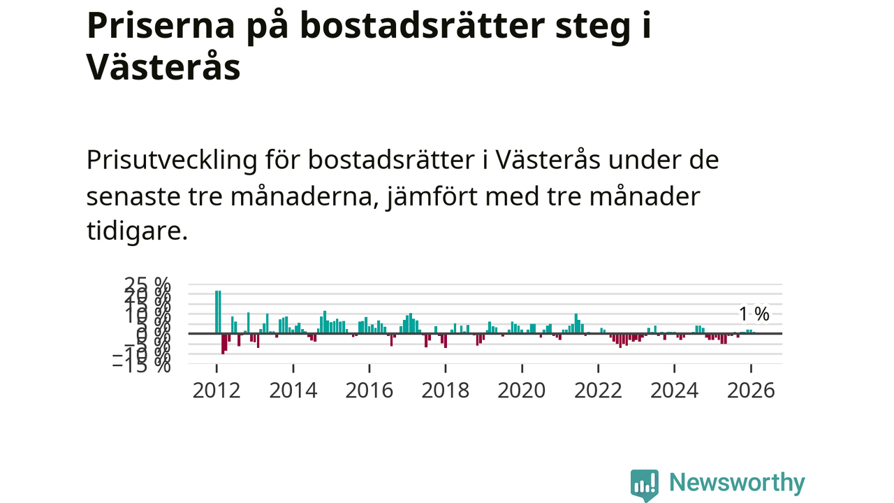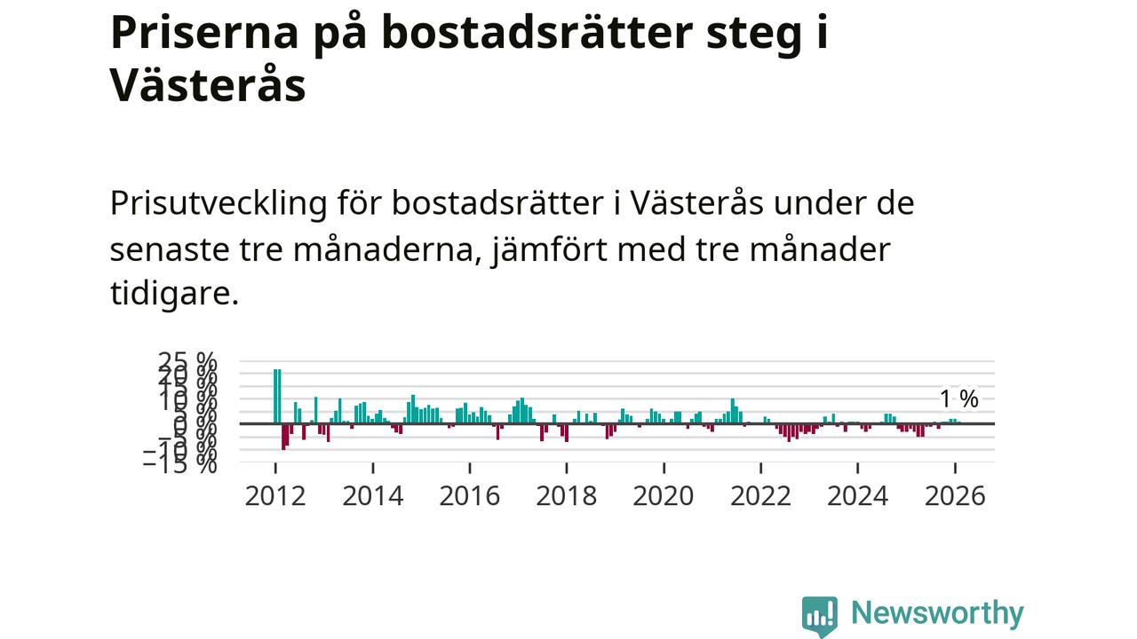 Priserna på bostadsrätter har gått upp i Västerås kommun. Medelpriset på försäljningarna under de senaste tre månaderna visar på en uppgång med 1 procent.