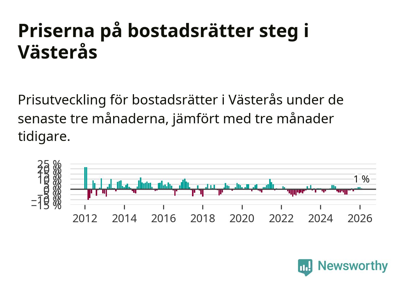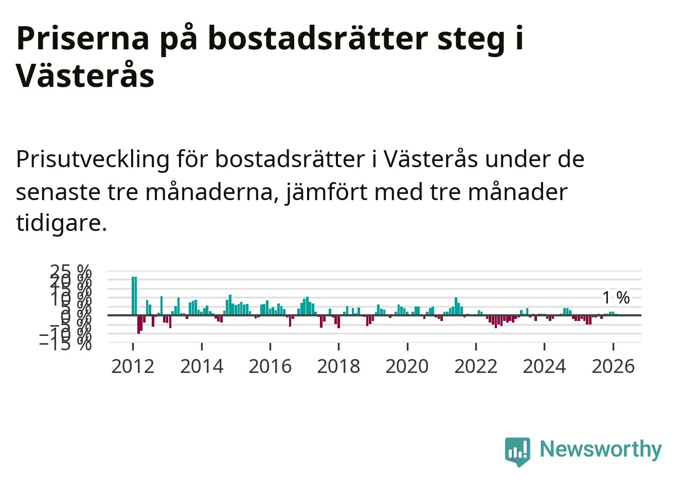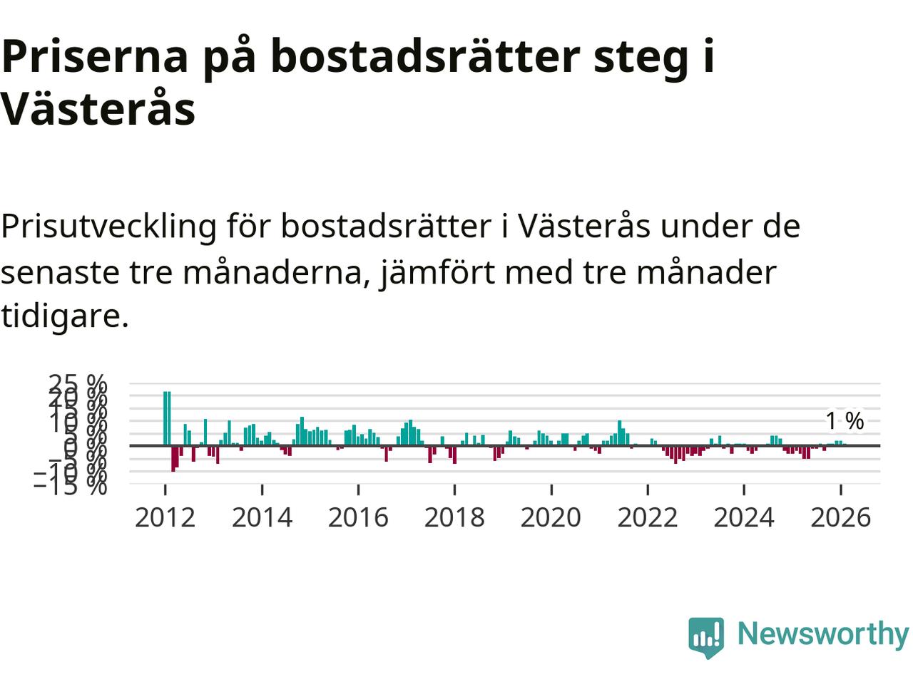 Priserna på bostadsrätter har gått upp i Västerås kommun. Medelpriset på försäljningarna under de senaste tre månaderna visar på en uppgång med 1 procent.