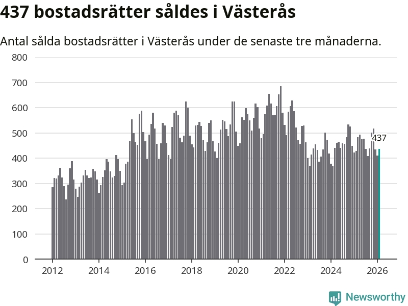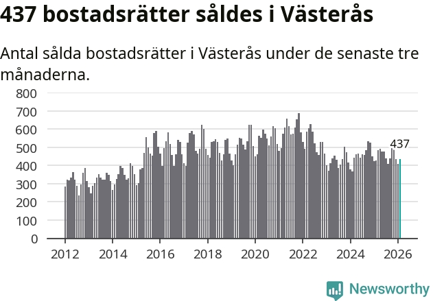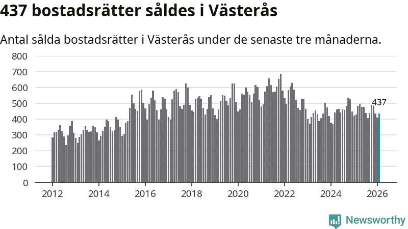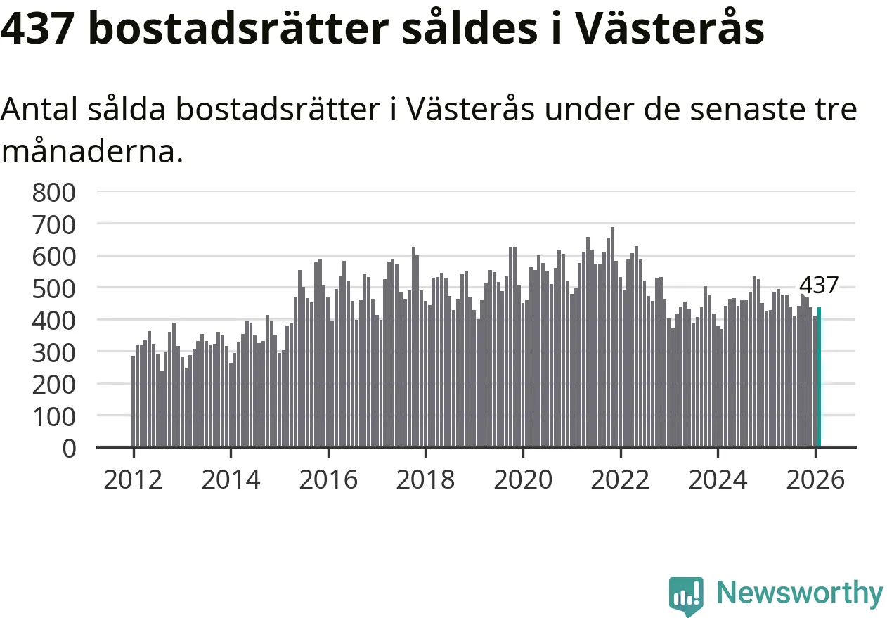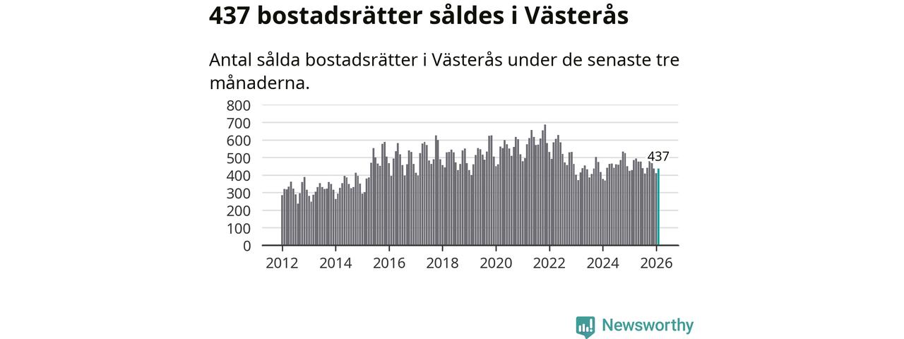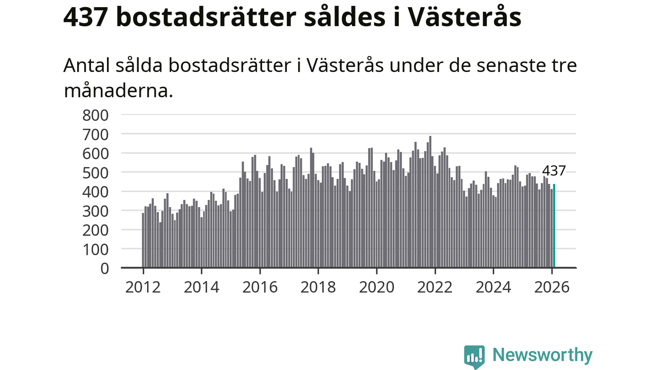 Sammanlagt såldes 437 bostadsrätter i Västerås kommun mellan december och februari till ett genomsnittligt pris på 1,7 miljoner kronor. I fjol gjordes 429 affärer vid den här tiden på året.