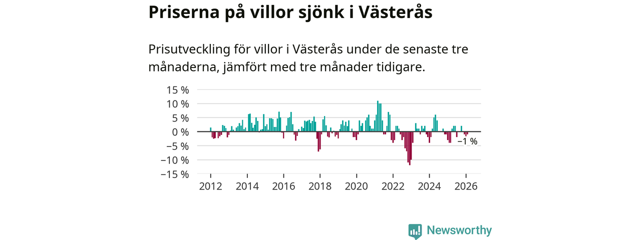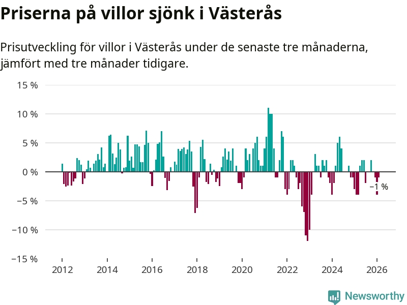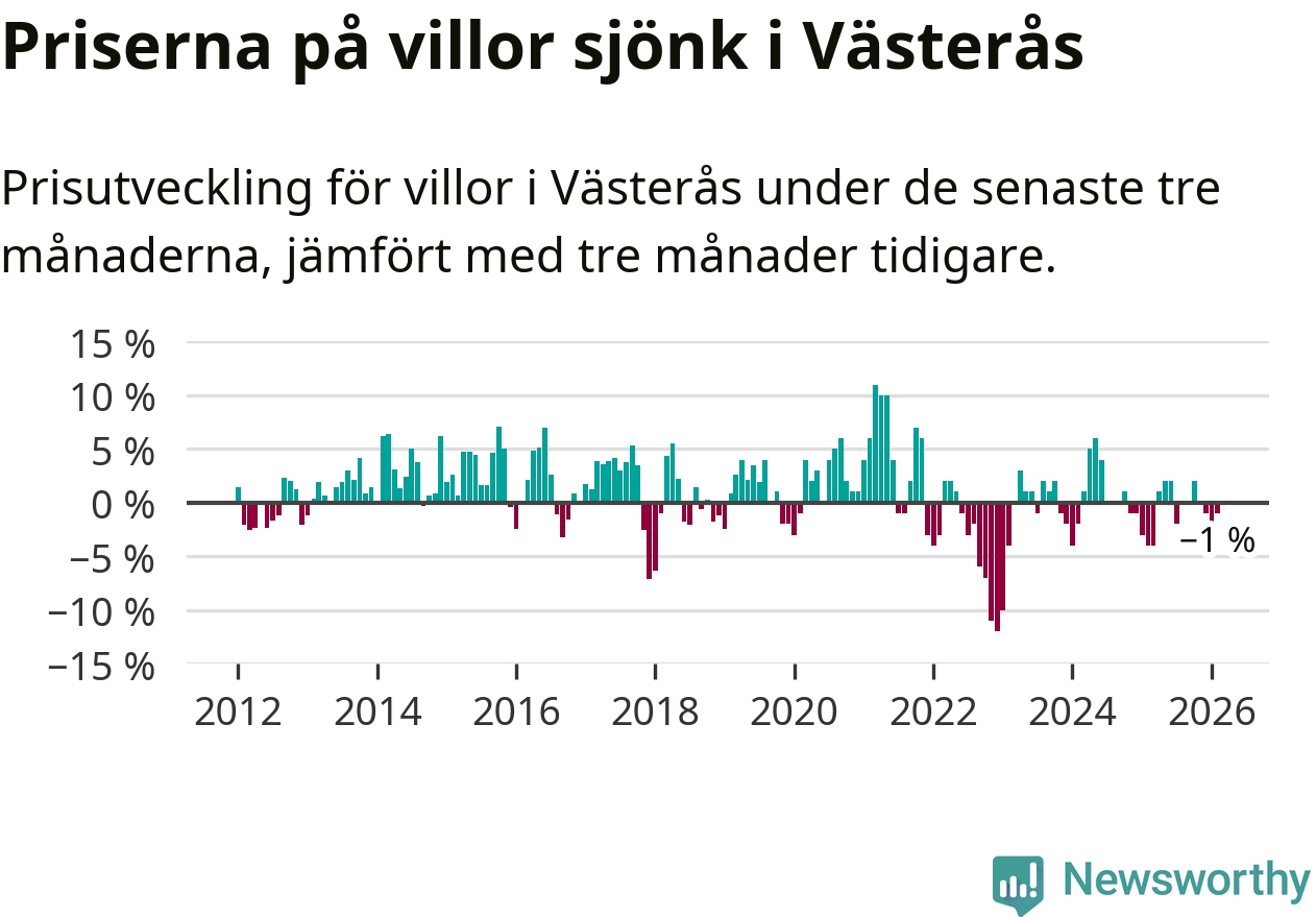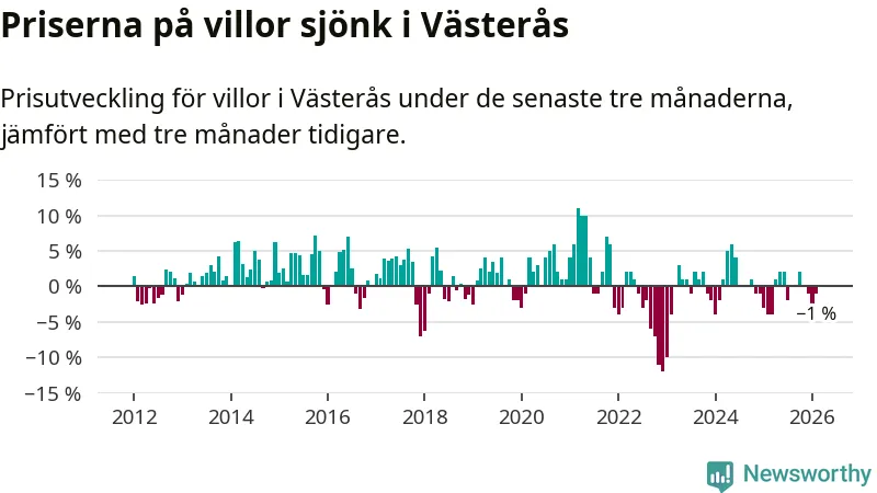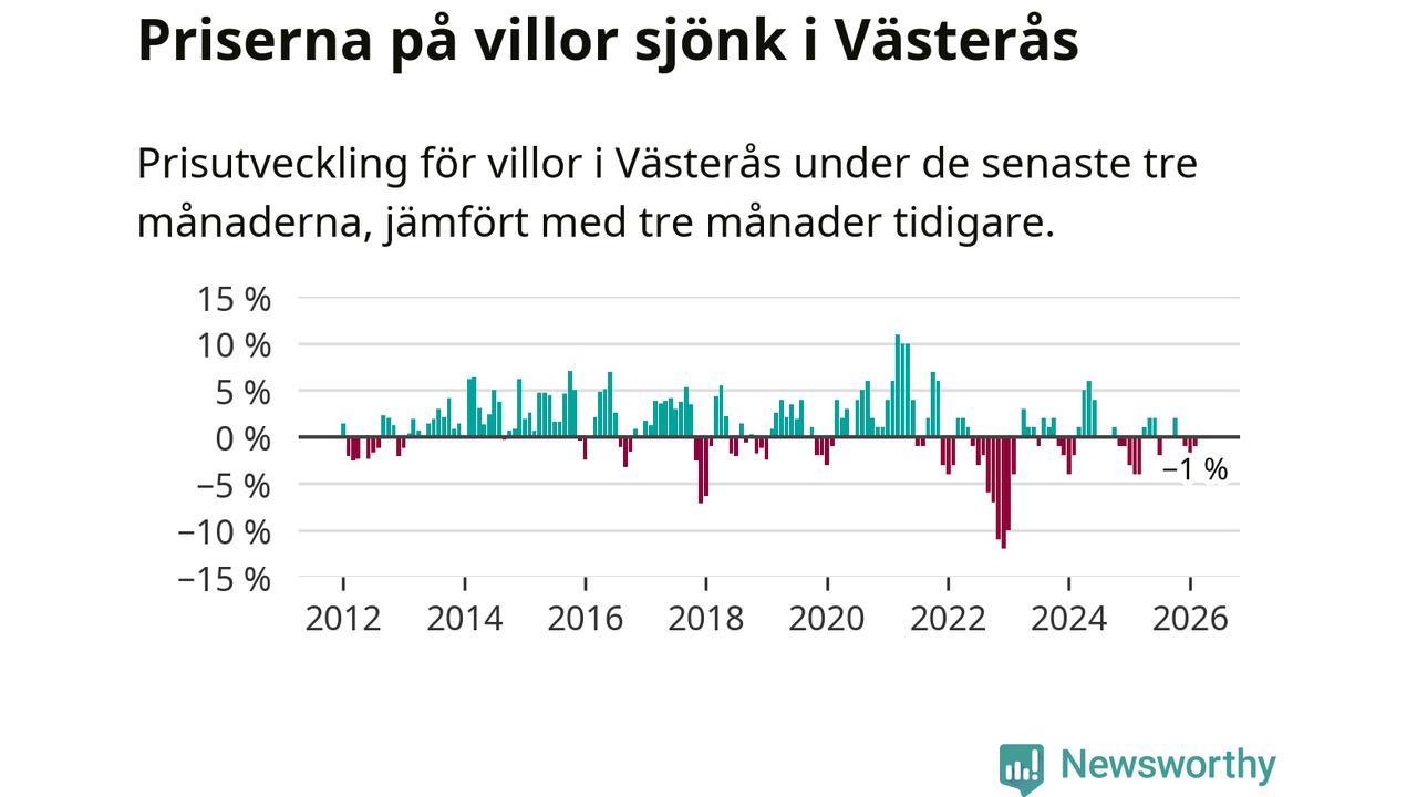 Villapriserna har gått ner i Västerås kommun. Medelpriset på försäljningarna under de senaste tre månaderna visar på en nedgång med 1 procent.