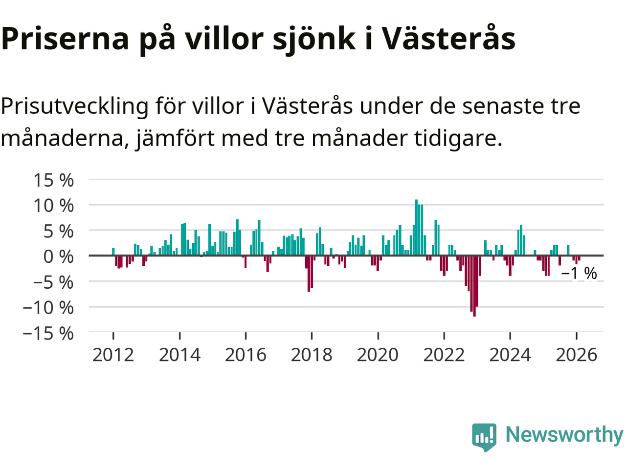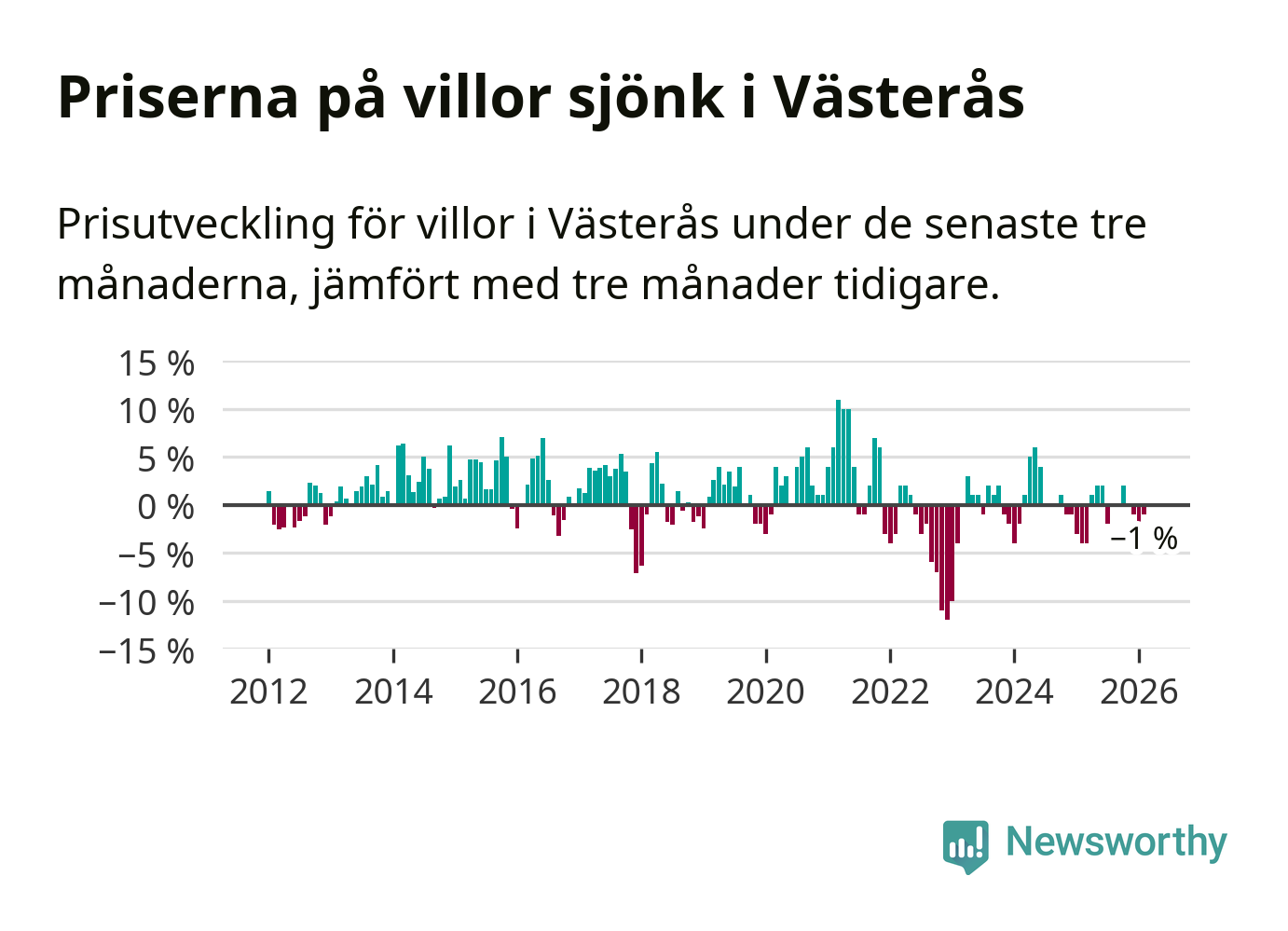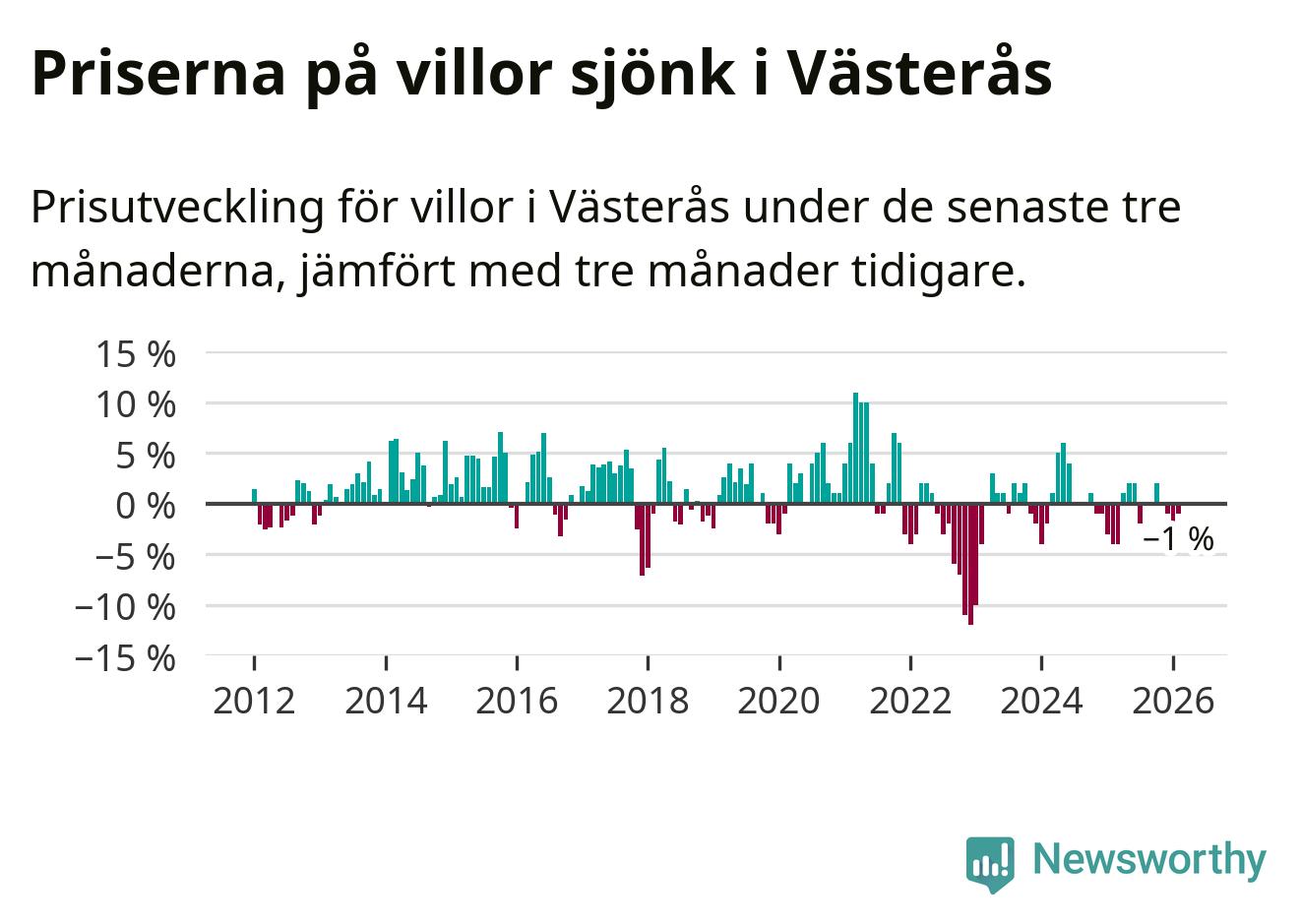 Villapriserna har gått ner i Västerås kommun. Medelpriset på försäljningarna under de senaste tre månaderna visar på en nedgång med 1 procent.