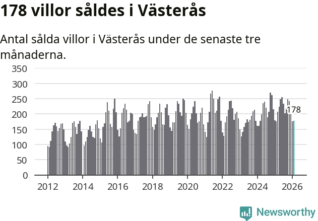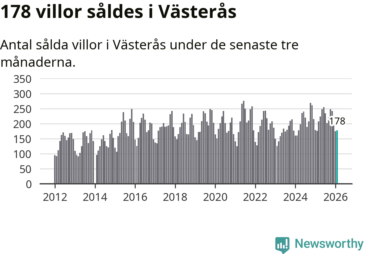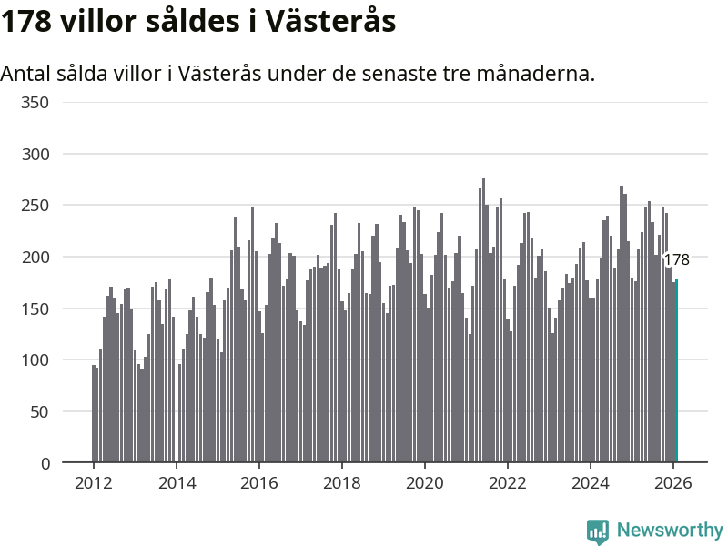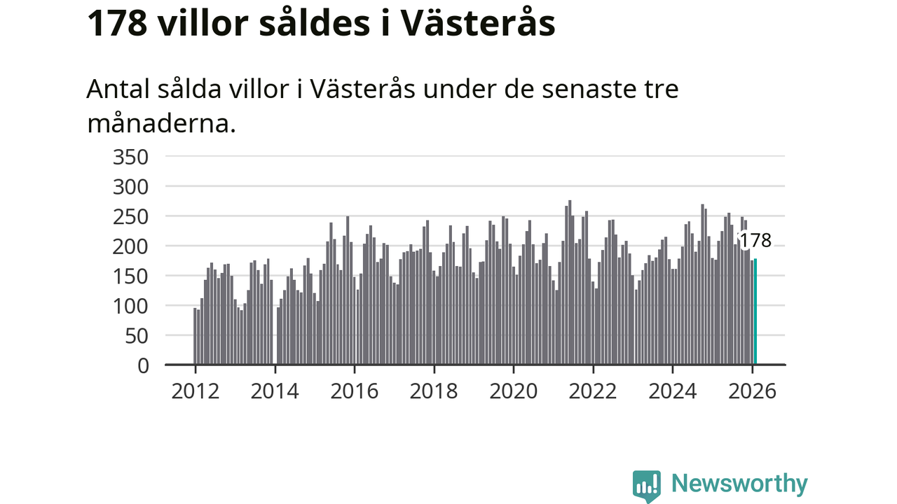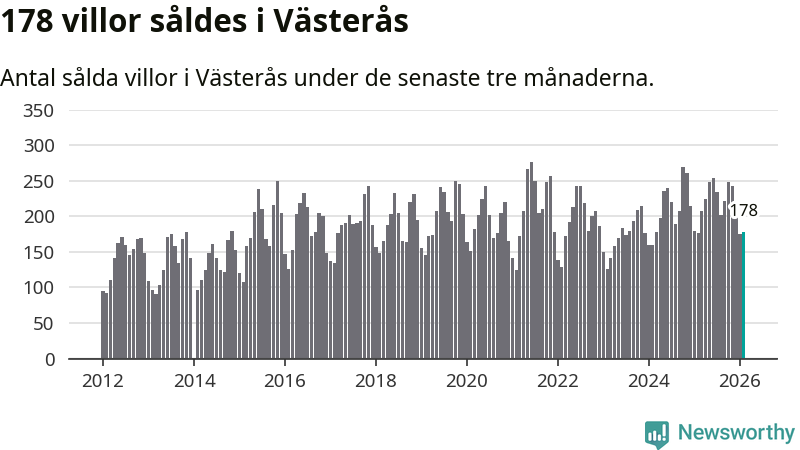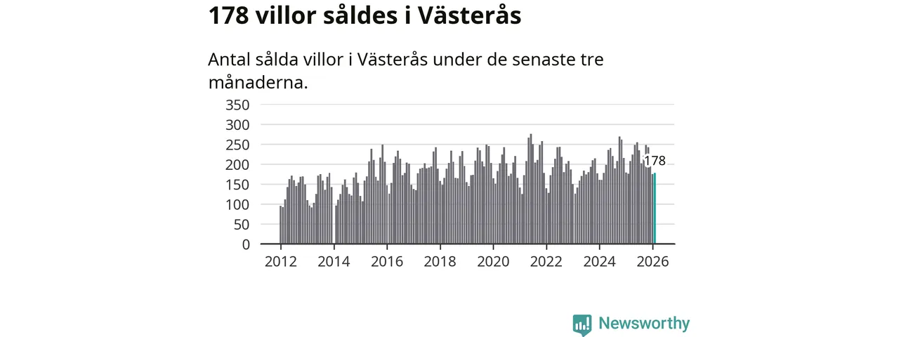 Sammanlagt såldes 178 villor i Västerås kommun mellan december och februari till ett genomsnittligt pris på 4,1 miljoner kronor. I fjol gjordes 176 affärer vid den här tiden på året.