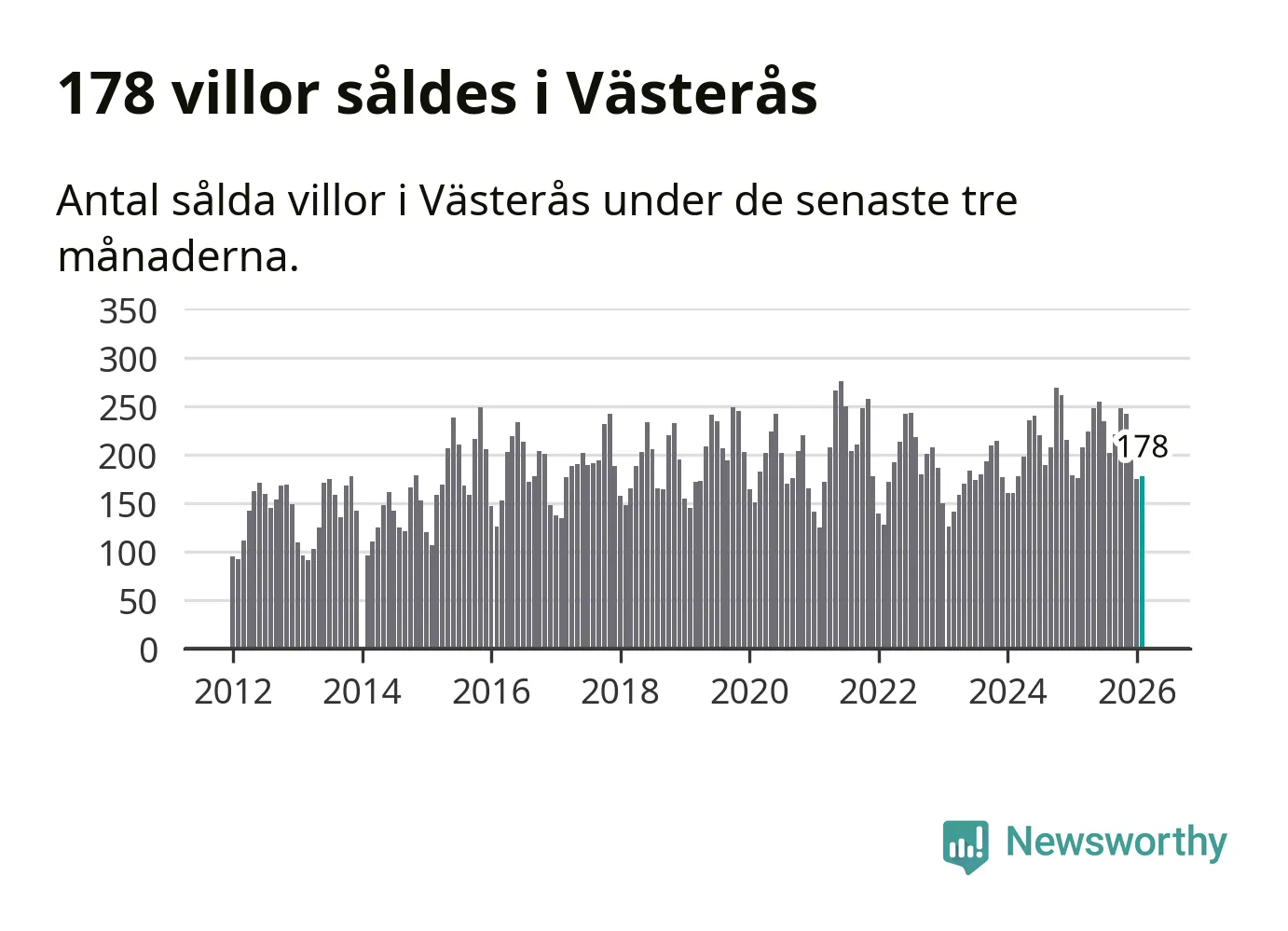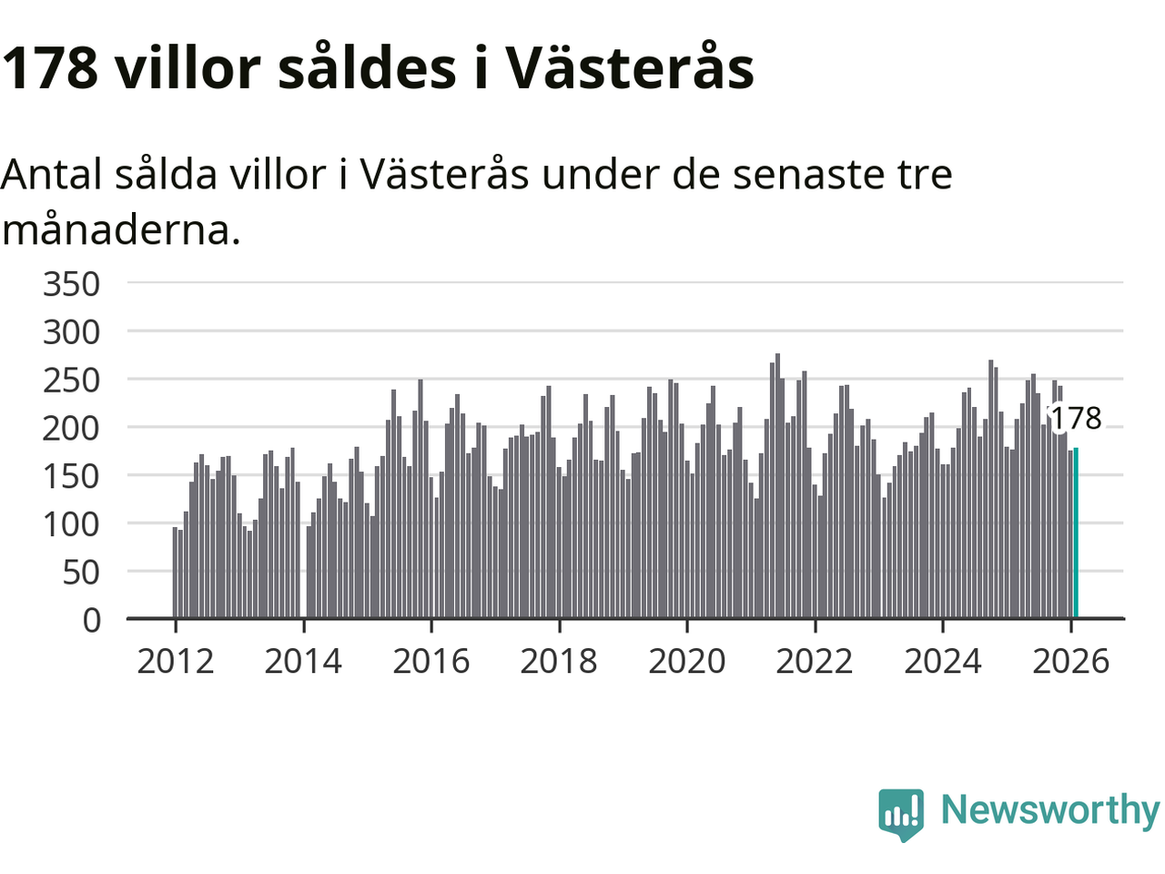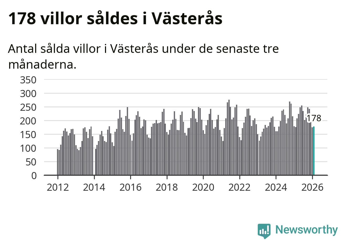 Sammanlagt såldes 178 villor i Västerås kommun mellan december och februari till ett genomsnittligt pris på 4,1 miljoner kronor. I fjol gjordes 176 affärer vid den här tiden på året.