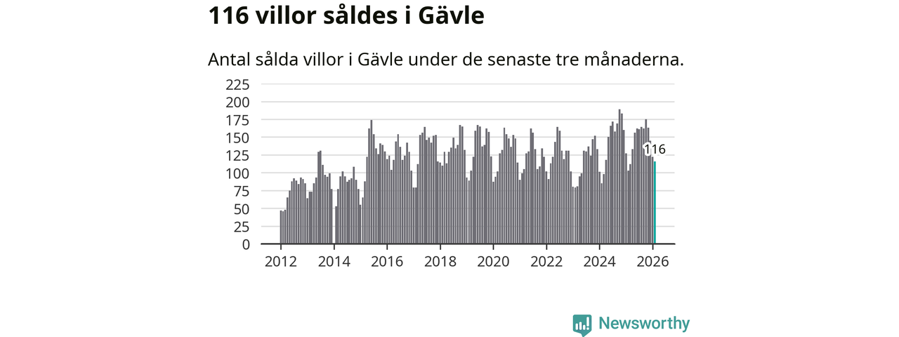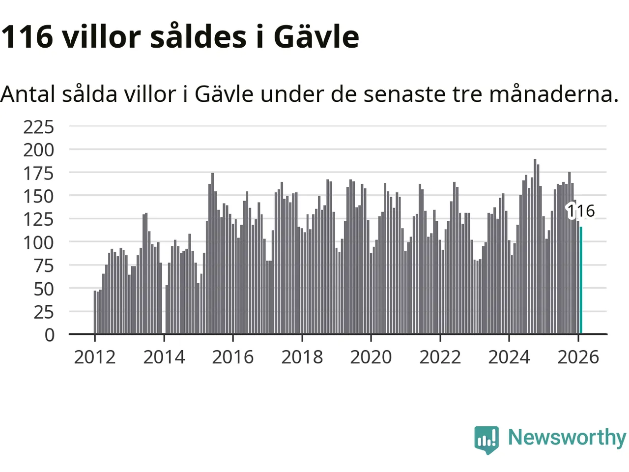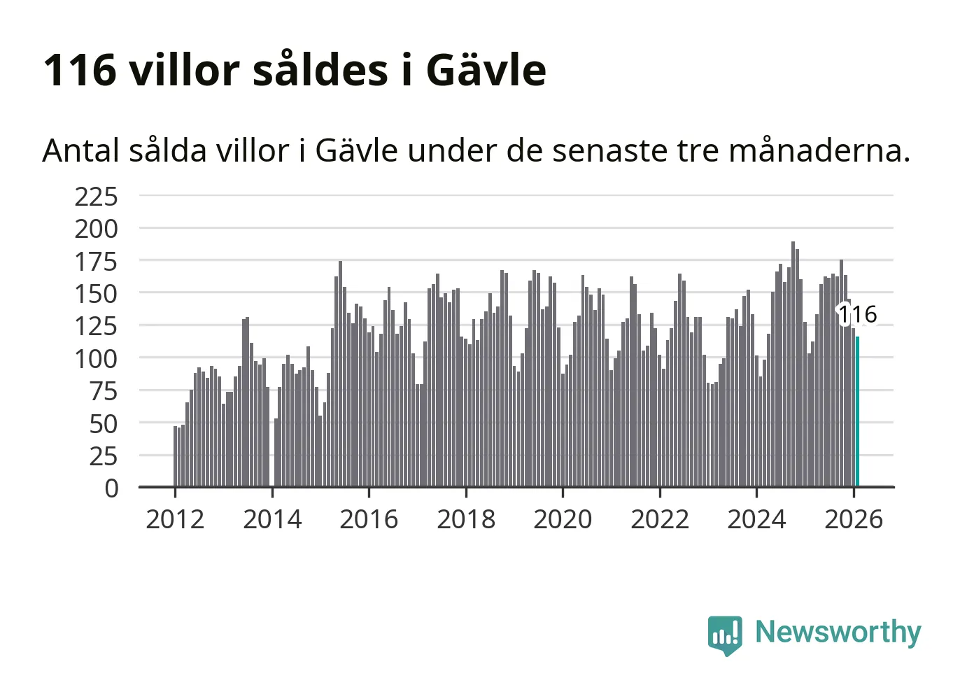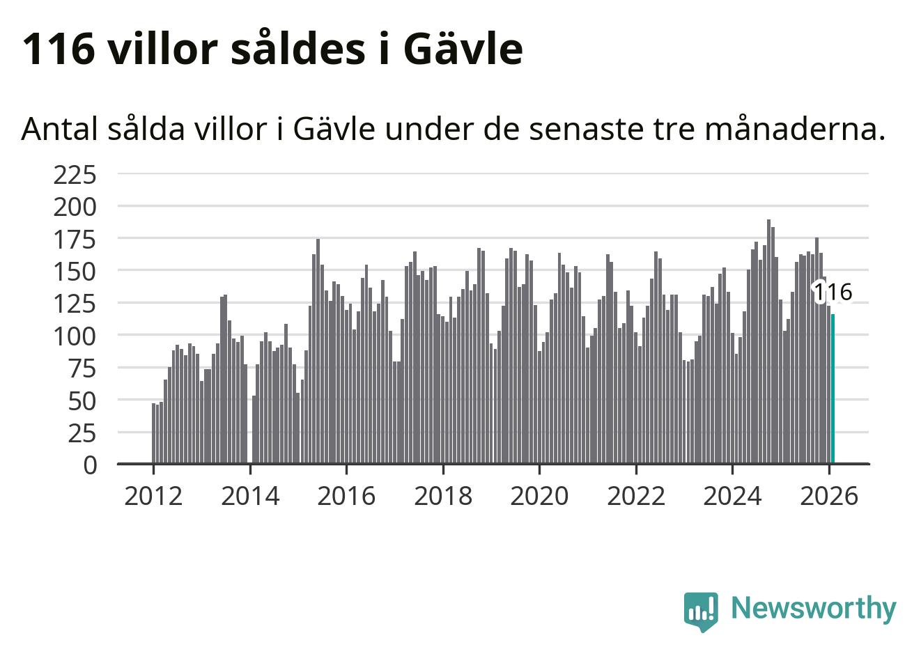 Sammanlagt såldes 116 villor i Gävle kommun mellan december och februari till ett genomsnittligt pris på 3,4 miljoner kronor. I fjol gjordes 103 affärer vid den här tiden på året.
