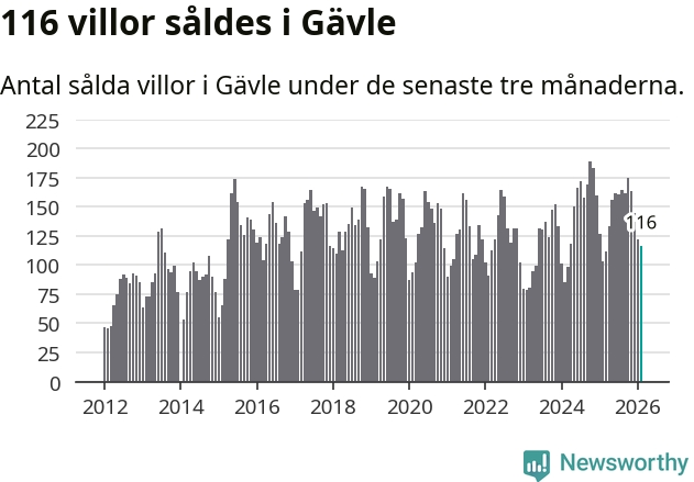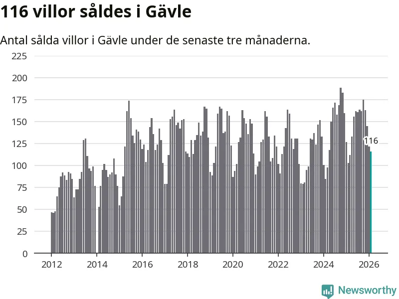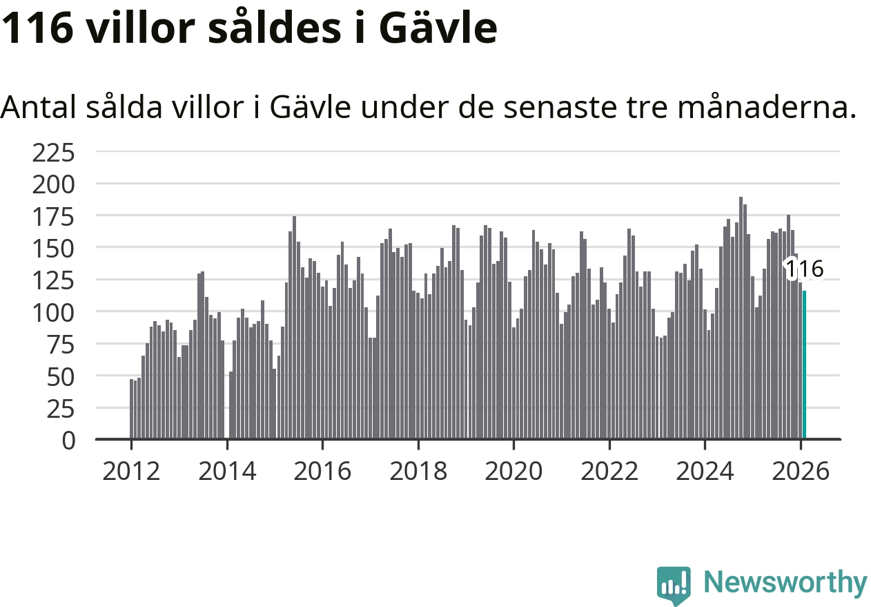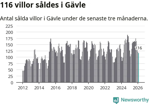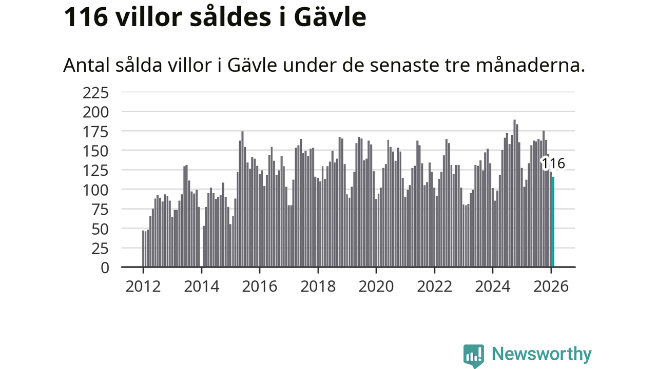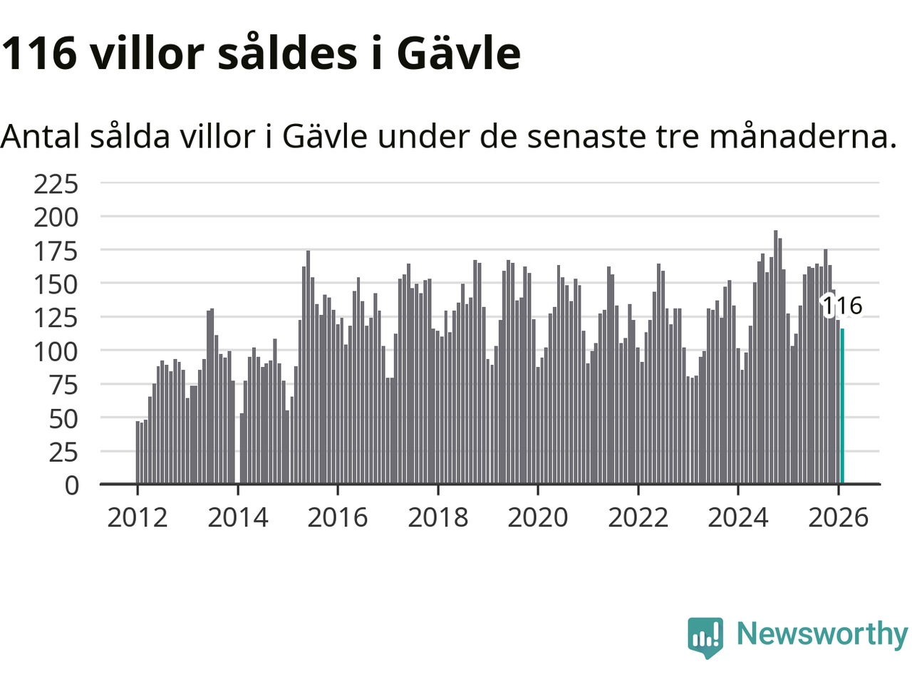 Sammanlagt såldes 116 villor i Gävle kommun mellan december och februari till ett genomsnittligt pris på 3,4 miljoner kronor. I fjol gjordes 103 affärer vid den här tiden på året.