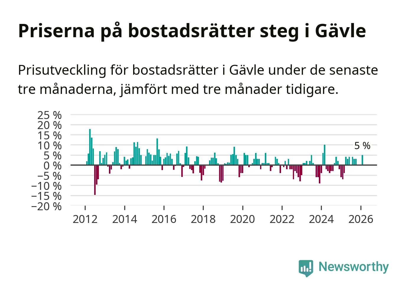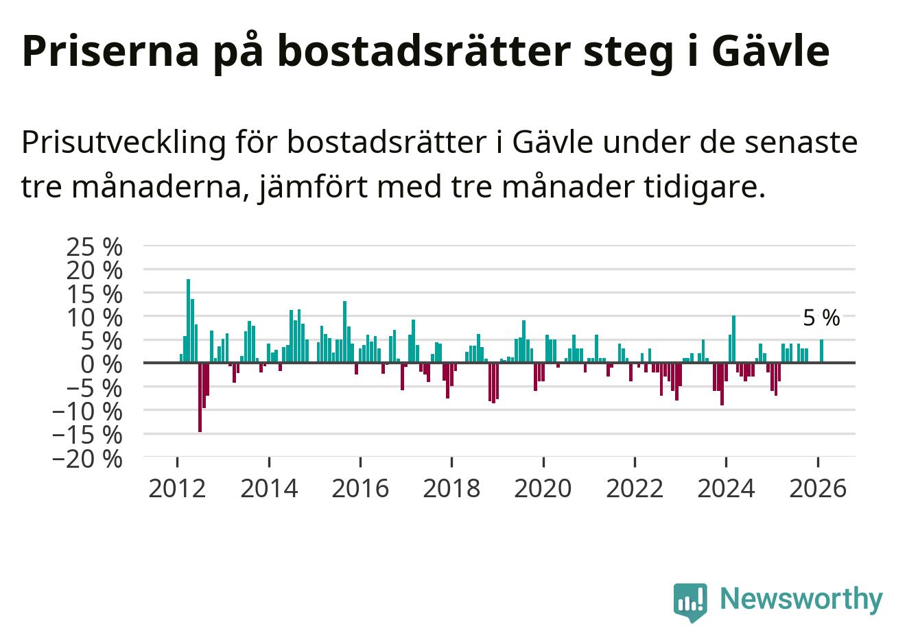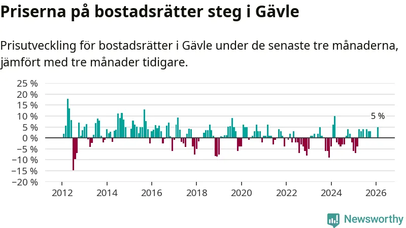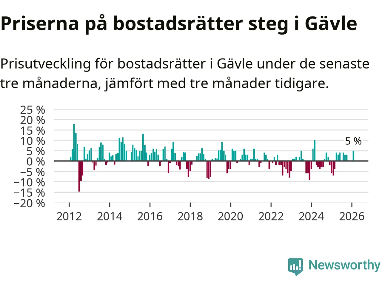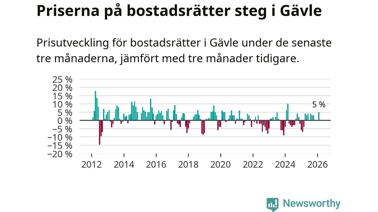 Priserna på bostadsrätter har gått upp i Gävle kommun. Medelpriset på försäljningarna under de senaste tre månaderna visar på en uppgång med 5 procent.