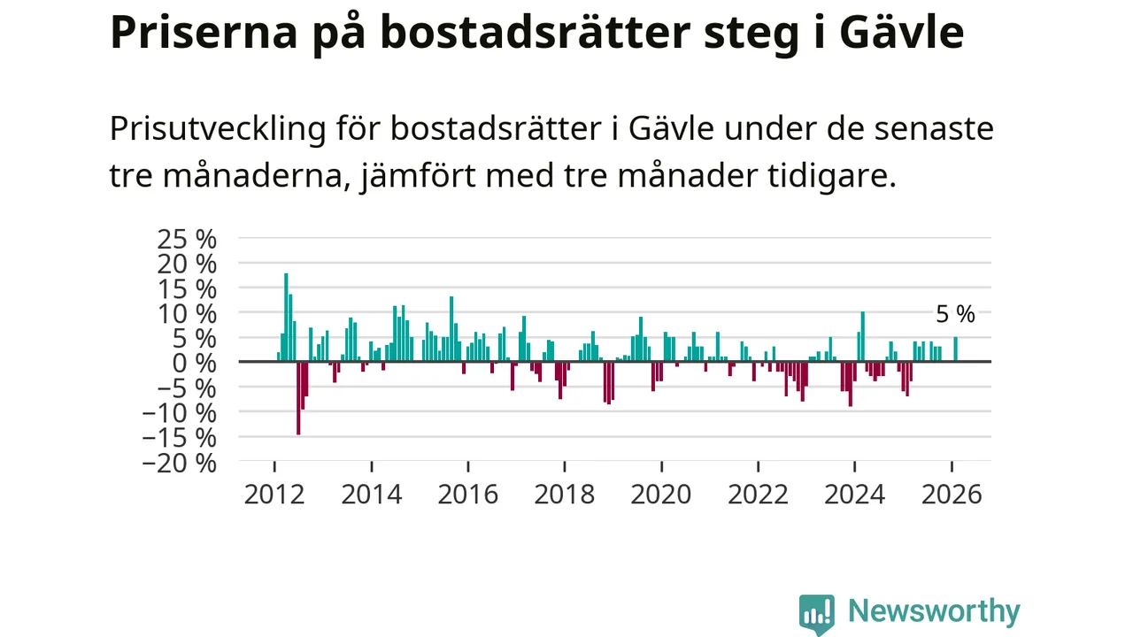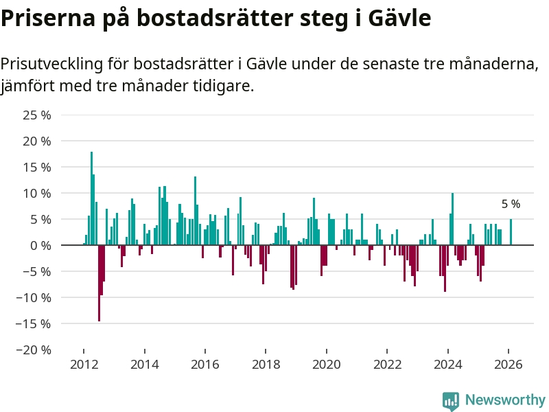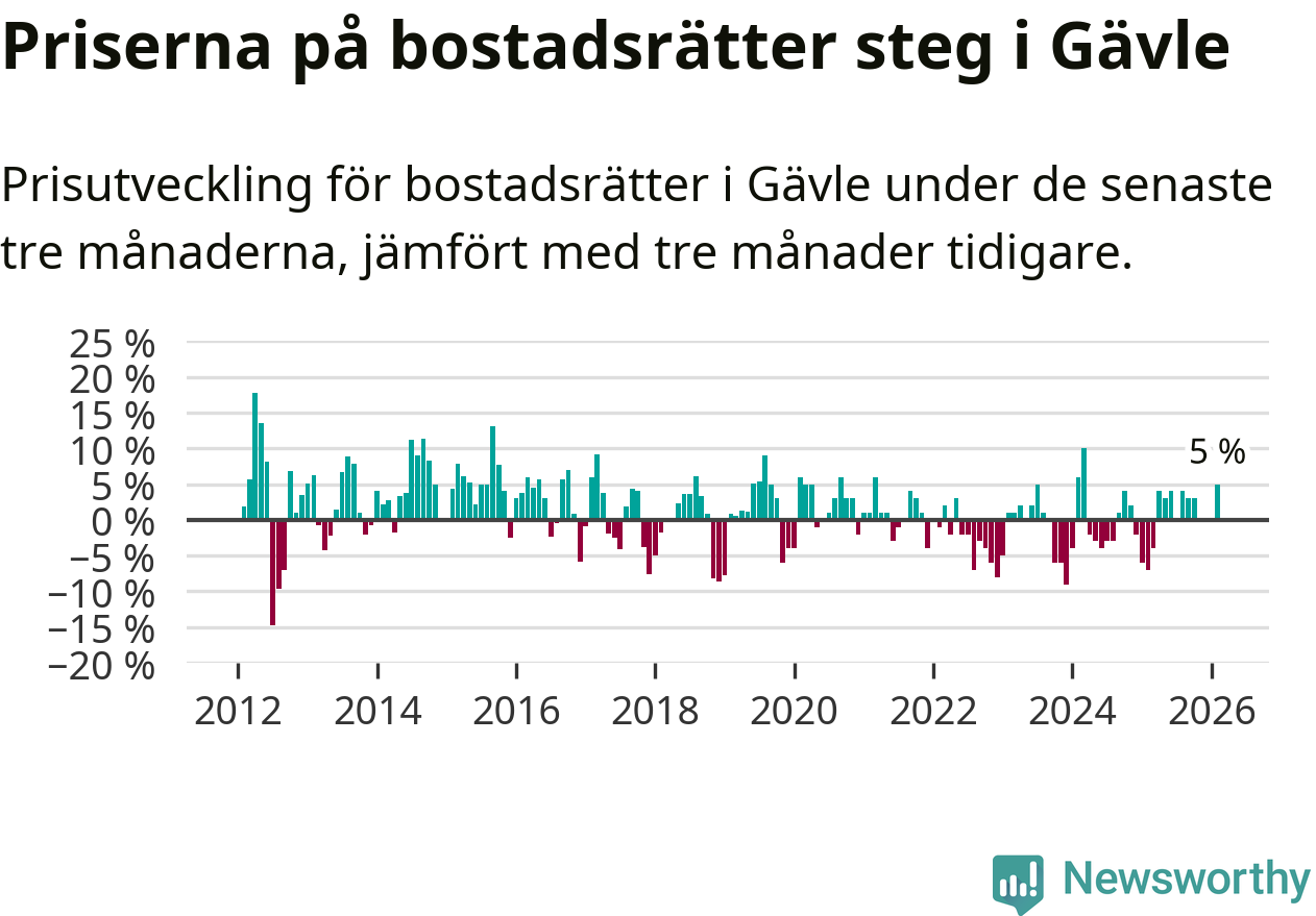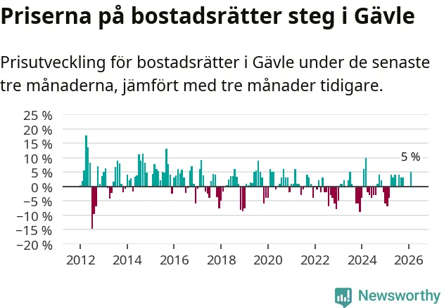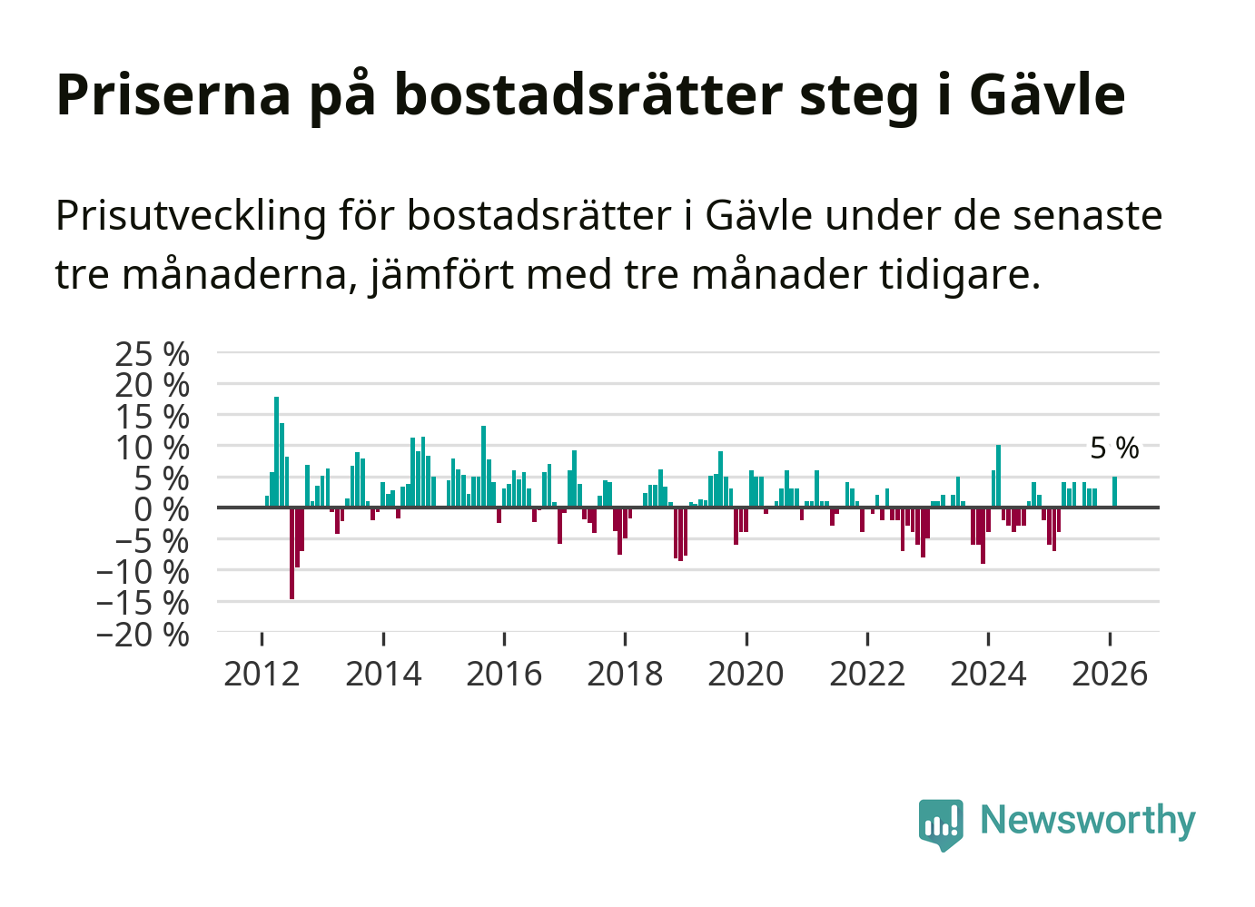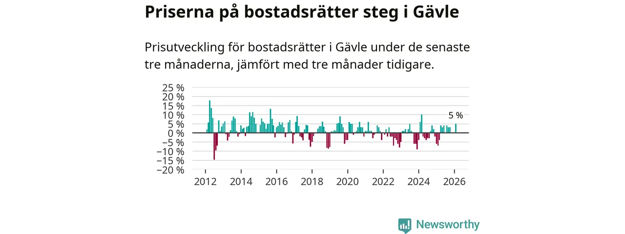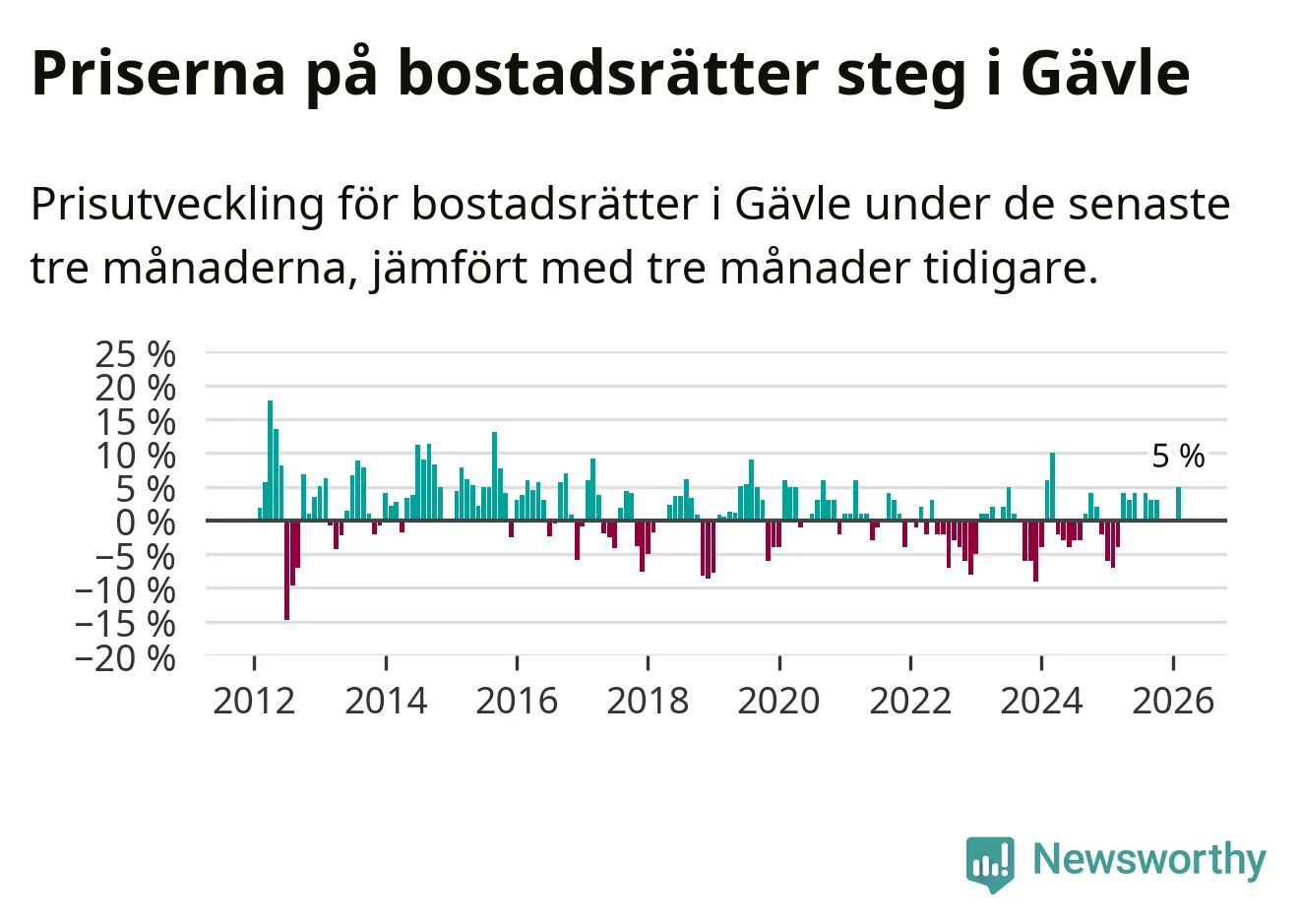 Priserna på bostadsrätter har gått upp i Gävle kommun. Medelpriset på försäljningarna under de senaste tre månaderna visar på en uppgång med 5 procent.